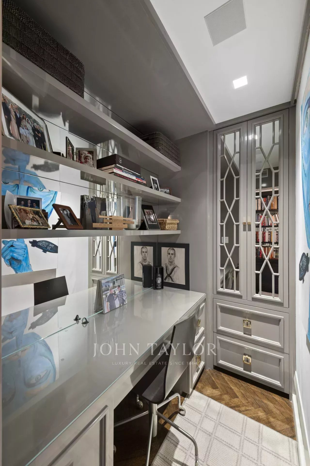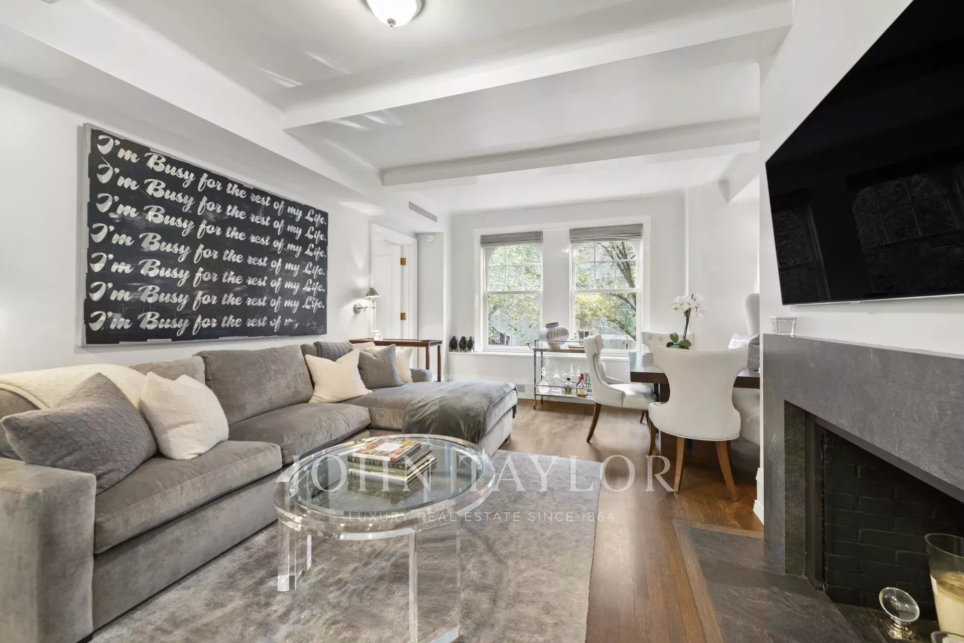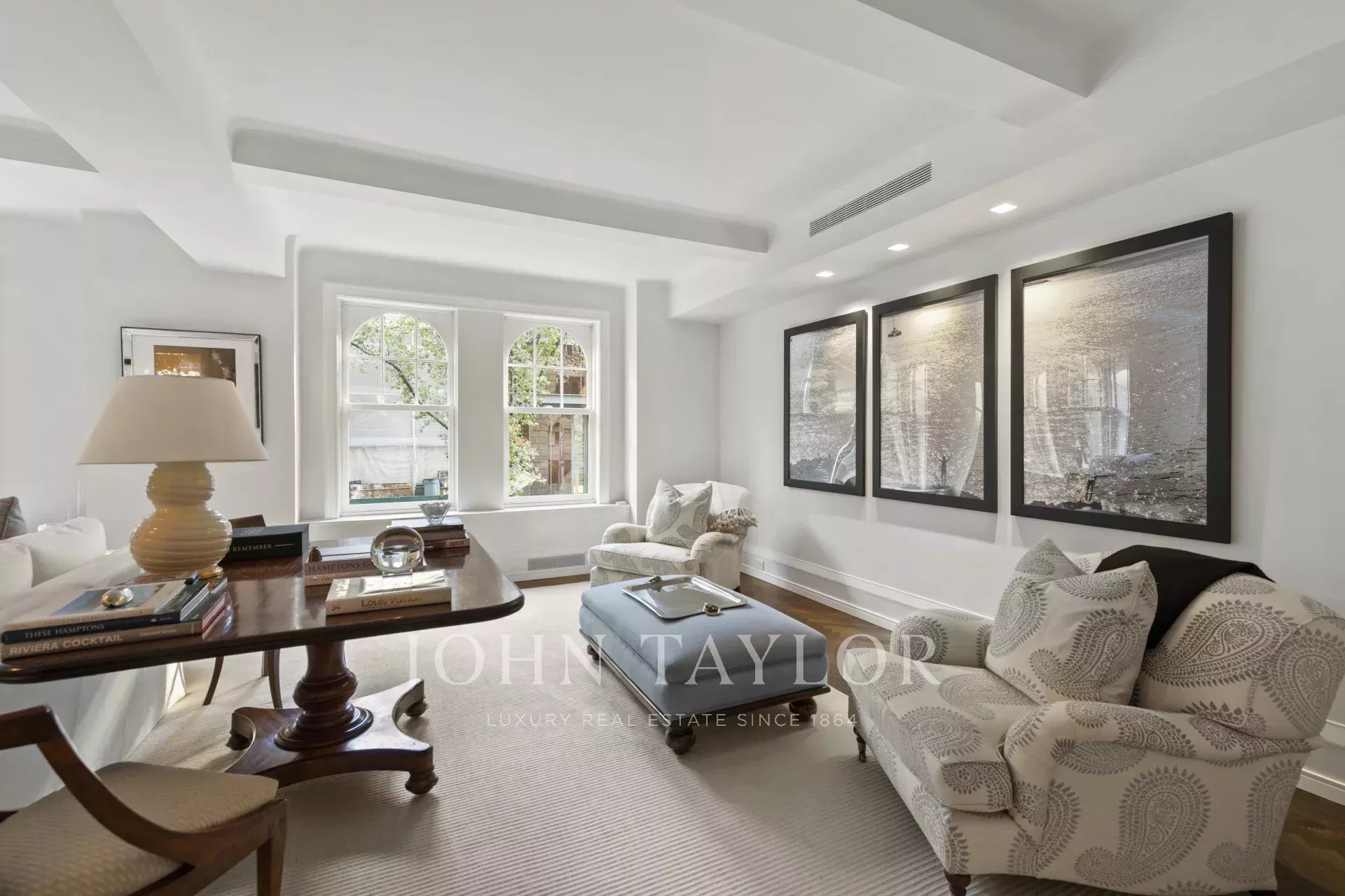 Avec quatre chambres plus un bureau, quatre salles de bains neuves, un système électrique entièrement neuf, des fenêtres Marvin, des sols en chêne blanc à chevrons et une climatisation centrale, vous avez l'élégance d'un immeuble d'avant-guerre avec toutes les commodités modernes que vous attendez d'une nouvelle construction. Le salon surdimensionné est orienté vers le nord avec des fenêtres historiques en arc de cercle donnant sur la 63e rue Est et possède une cheminée. Le salon est suivi d'une salle à manger idéale pour recevoir des amis. La cuisine Poggenpohl est équipée d'une gamme complète d'appareils Meile (fours, réfrigérateur massif, etc.), d'une cuisinière Gaggenau et d'un grand réfrigérateur à vin, d'une armoire Polar White avec tiroirs automatiques, de plans de travail Calcutta Gold de 5 cm d'épaisseur assortis aux livres, etc. La cuisine dispose également d'une cheminée, d'un coin salon et d'un coin petit-déjeuner confortable avec vue sur East 63rd Street et une partie de Park Avenue.
