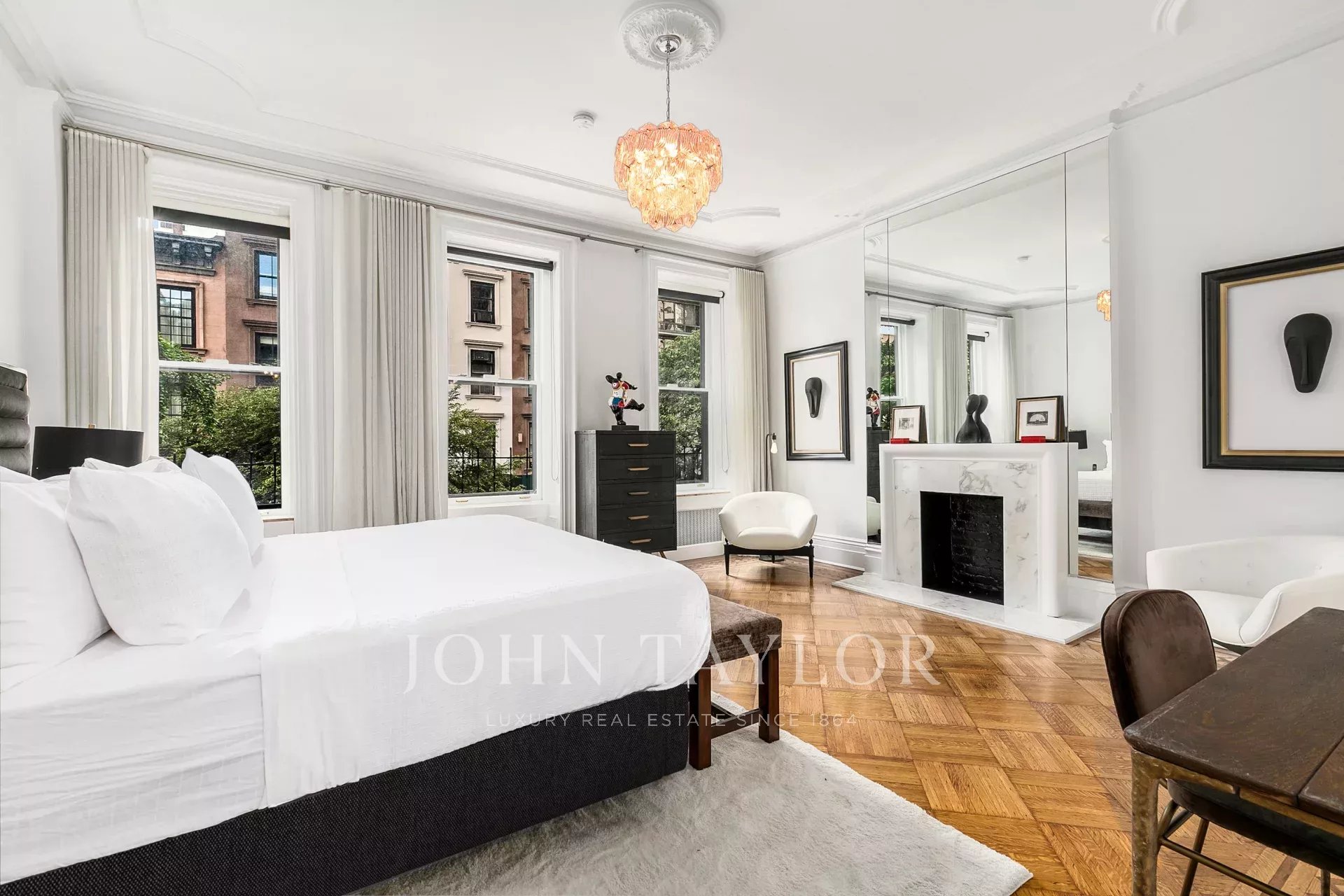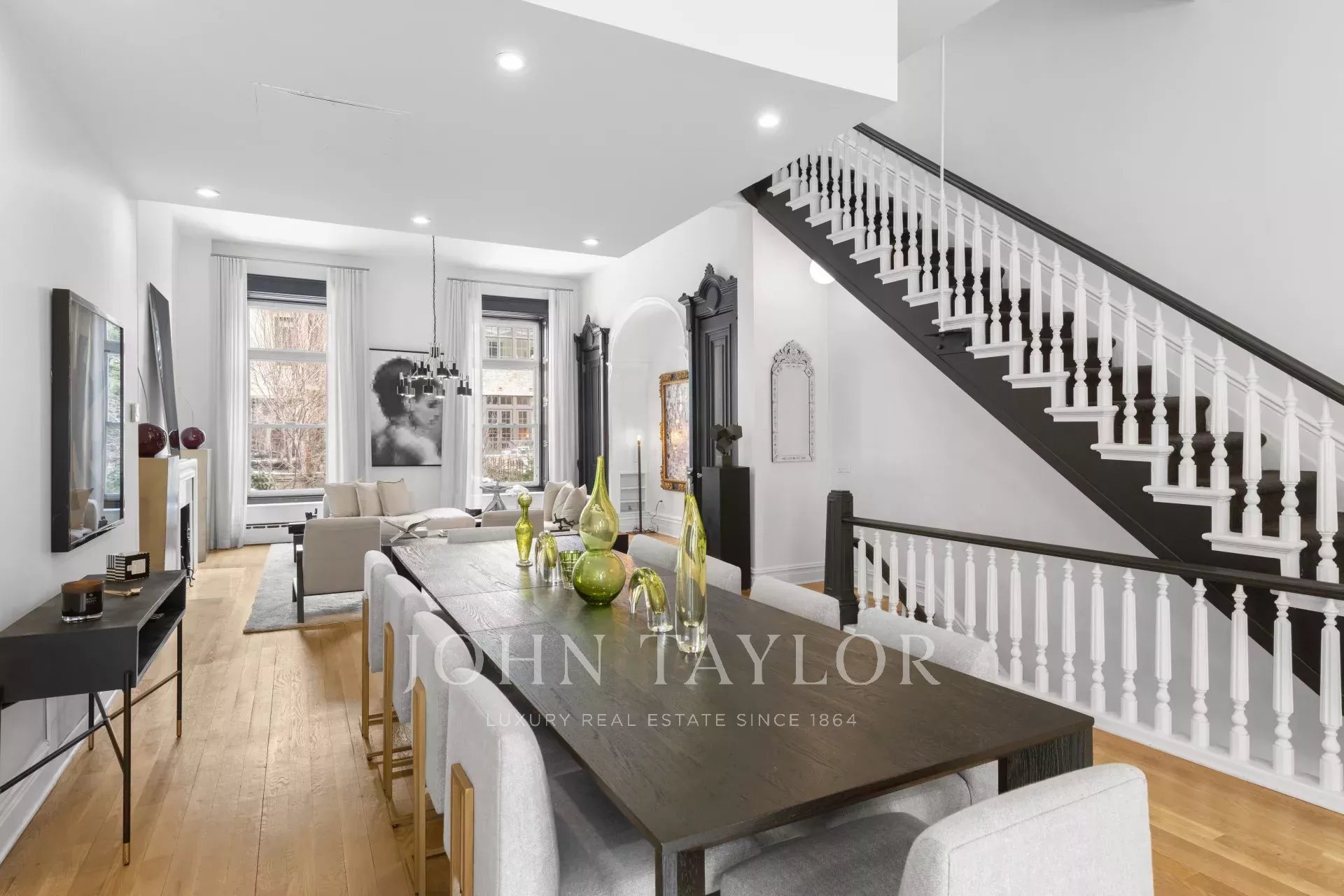 Entièrement meublée avec des meubles en parfait état, magnifiquement conçue et riche en détails d'origine, cette grande maison de ville rénovée de 4 étages, d'une largeur de 20 pieds, avec un espace extérieur privé de 1 000 pieds carrés, est située dans une jolie rue bordée d'arbres au cœur du quartier historique de Treadwell Farms, avec deux garages à côté.