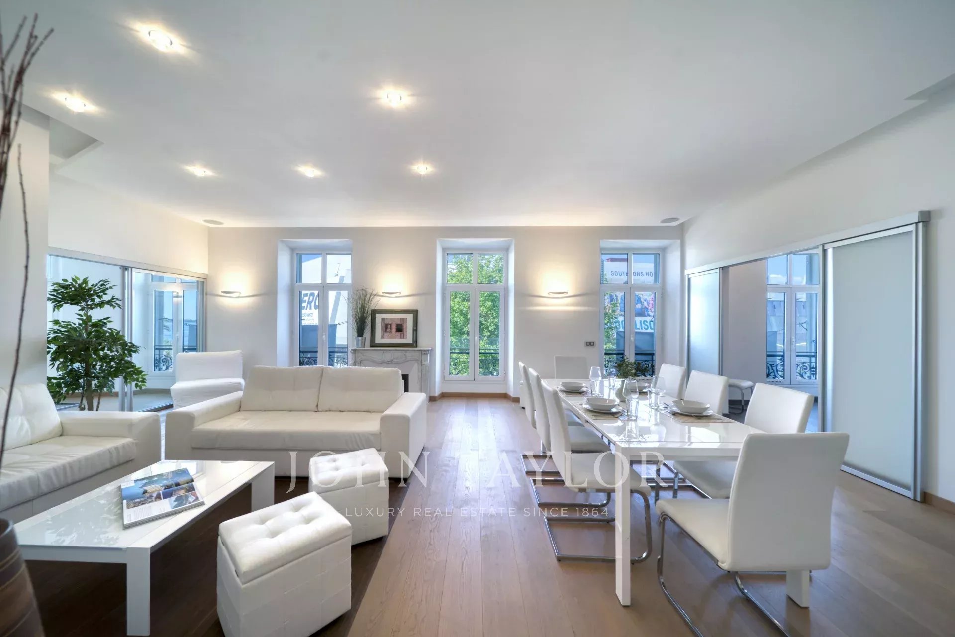 Face au Palais des Festivals, une belle et grande pièce de réception avec salon, coin salle à manger et cuisine ouverte équipée