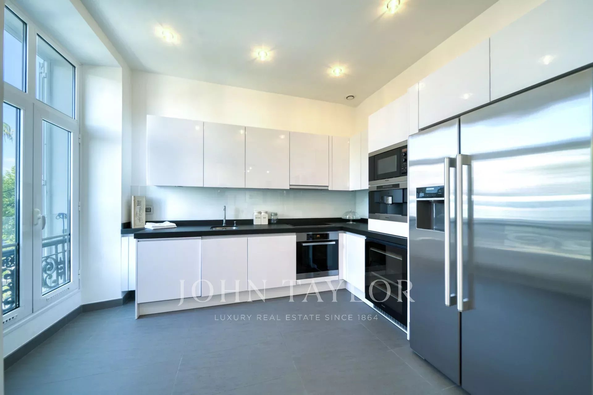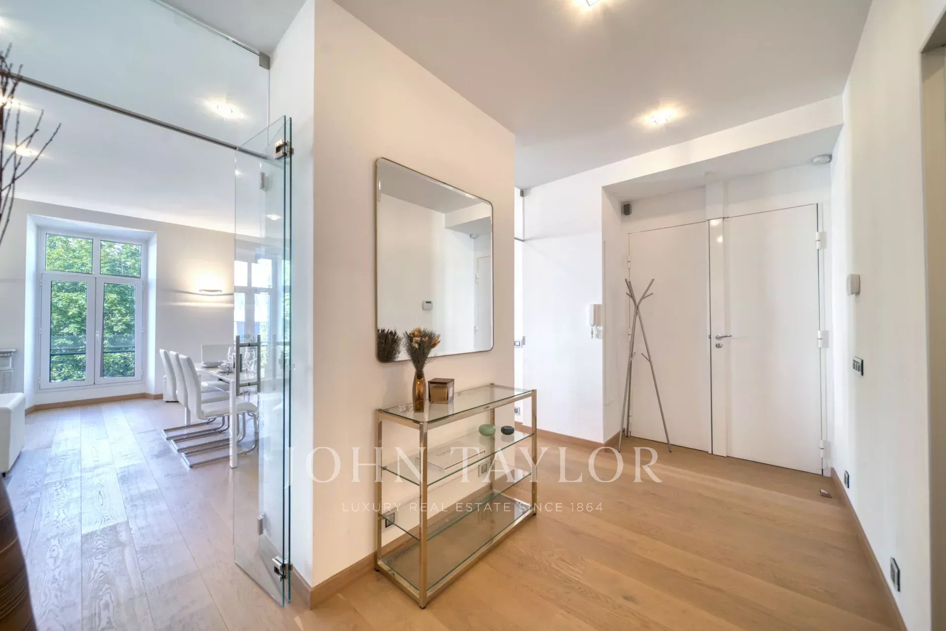 Au 2ème étage d’un immeuble bourgeois, face au Palais des Festivals et des plages de la Croisette, proche de la rue d’Antibes, du marché Forville et de la vieille ville de Cannes "Le Suquet", appartement contemporain entièrement rénové et climatisé de 141 m2 habitables comme suit :