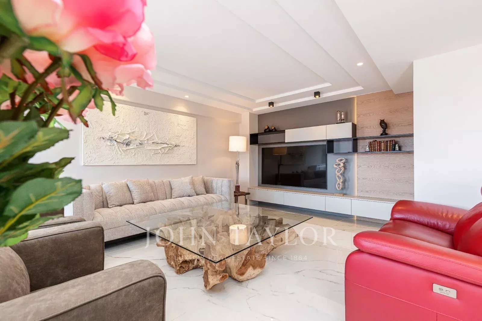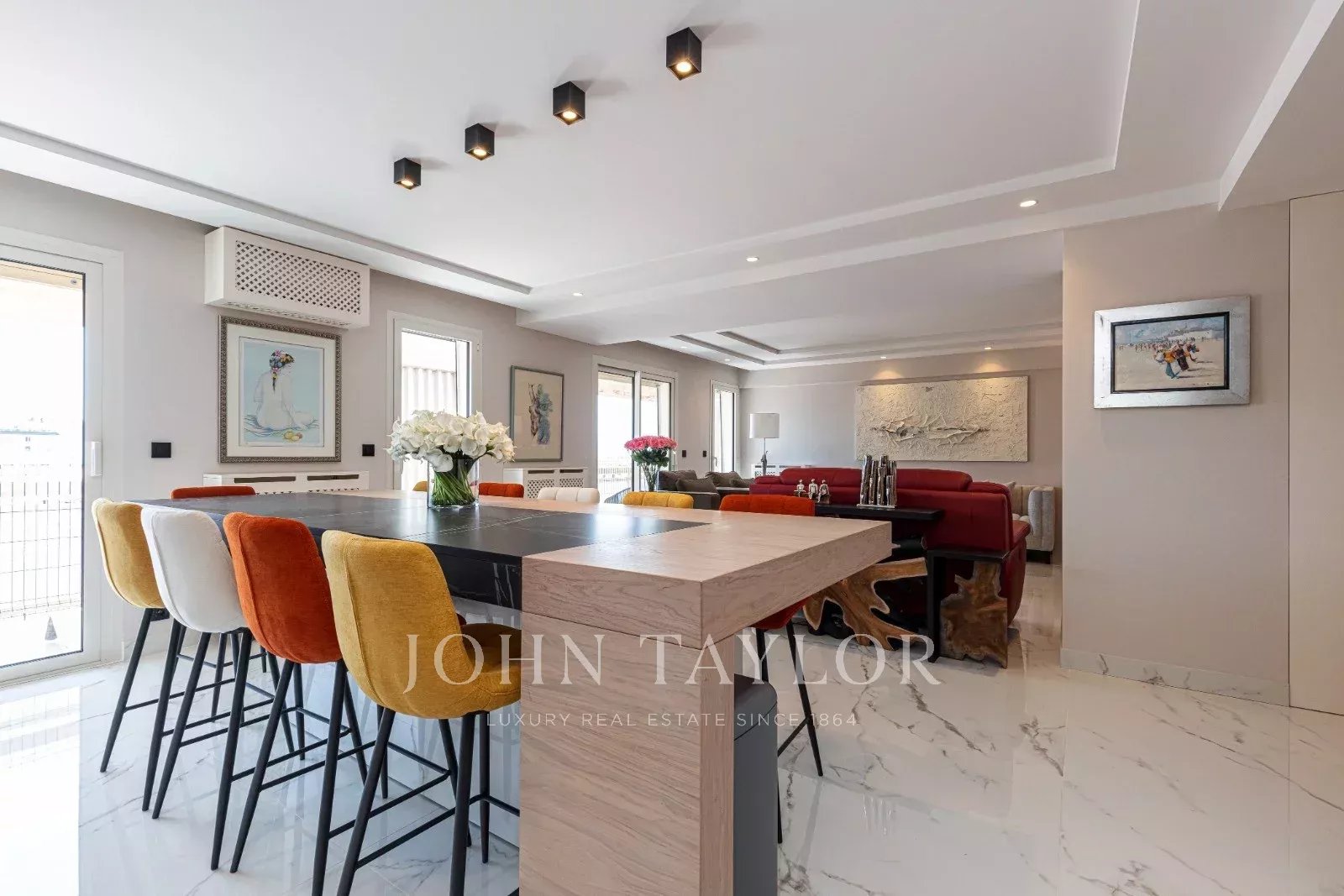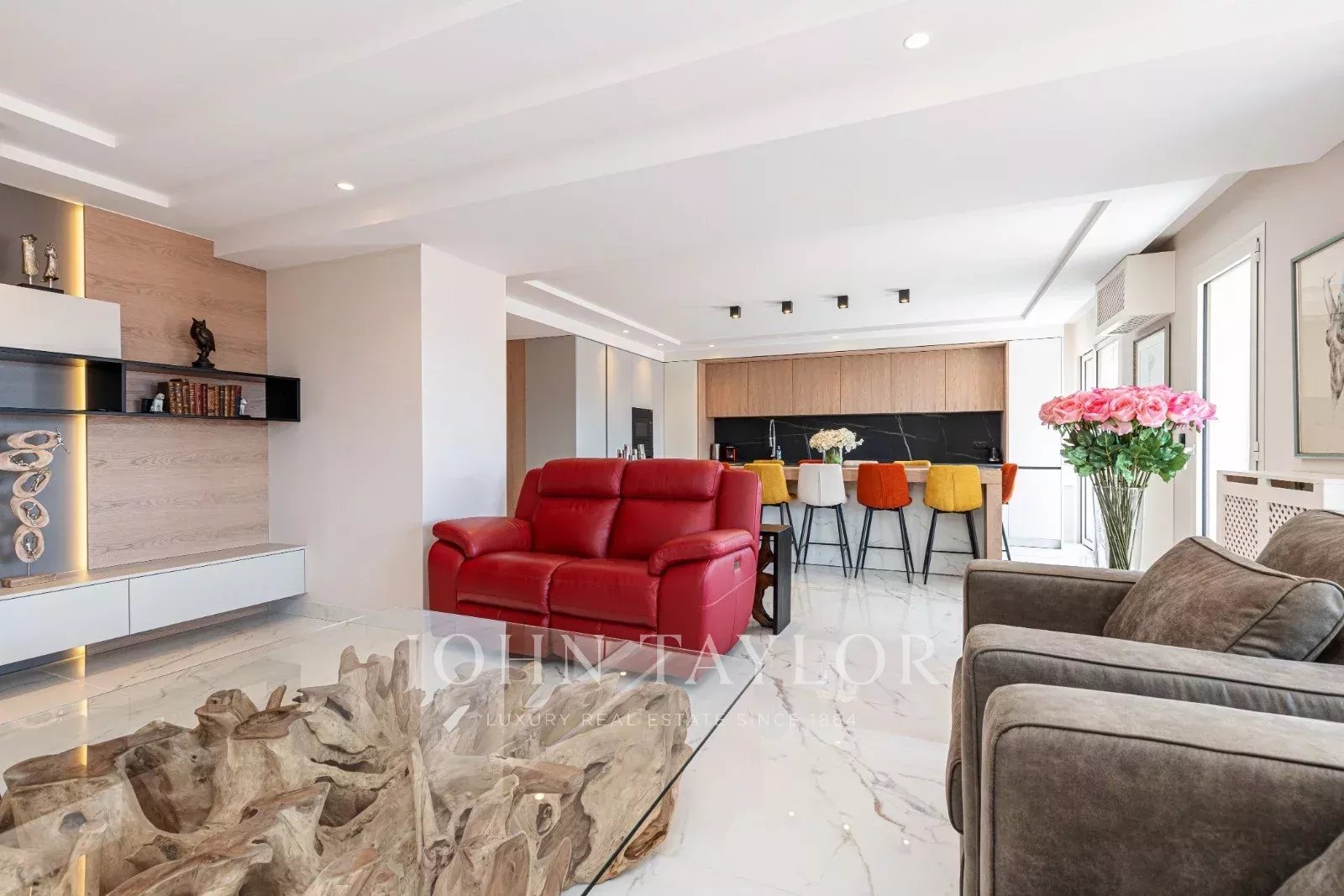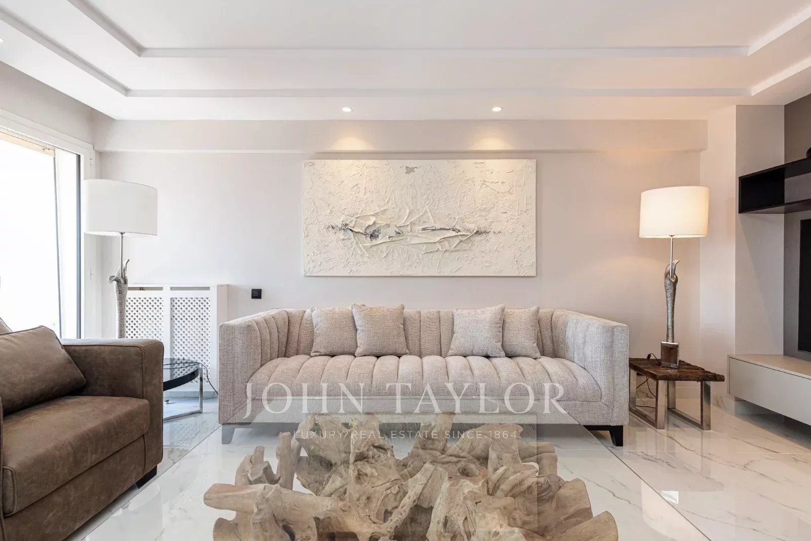Idéalement situé au cœur du centre ville de Cannes, derrière la rue de d'Antibes et à quelques pas de la Croisette, vaste appartement de style contemporain de 4 chambres d'environ 150m² entièrement rénové et meublé avec soins et terrasse.