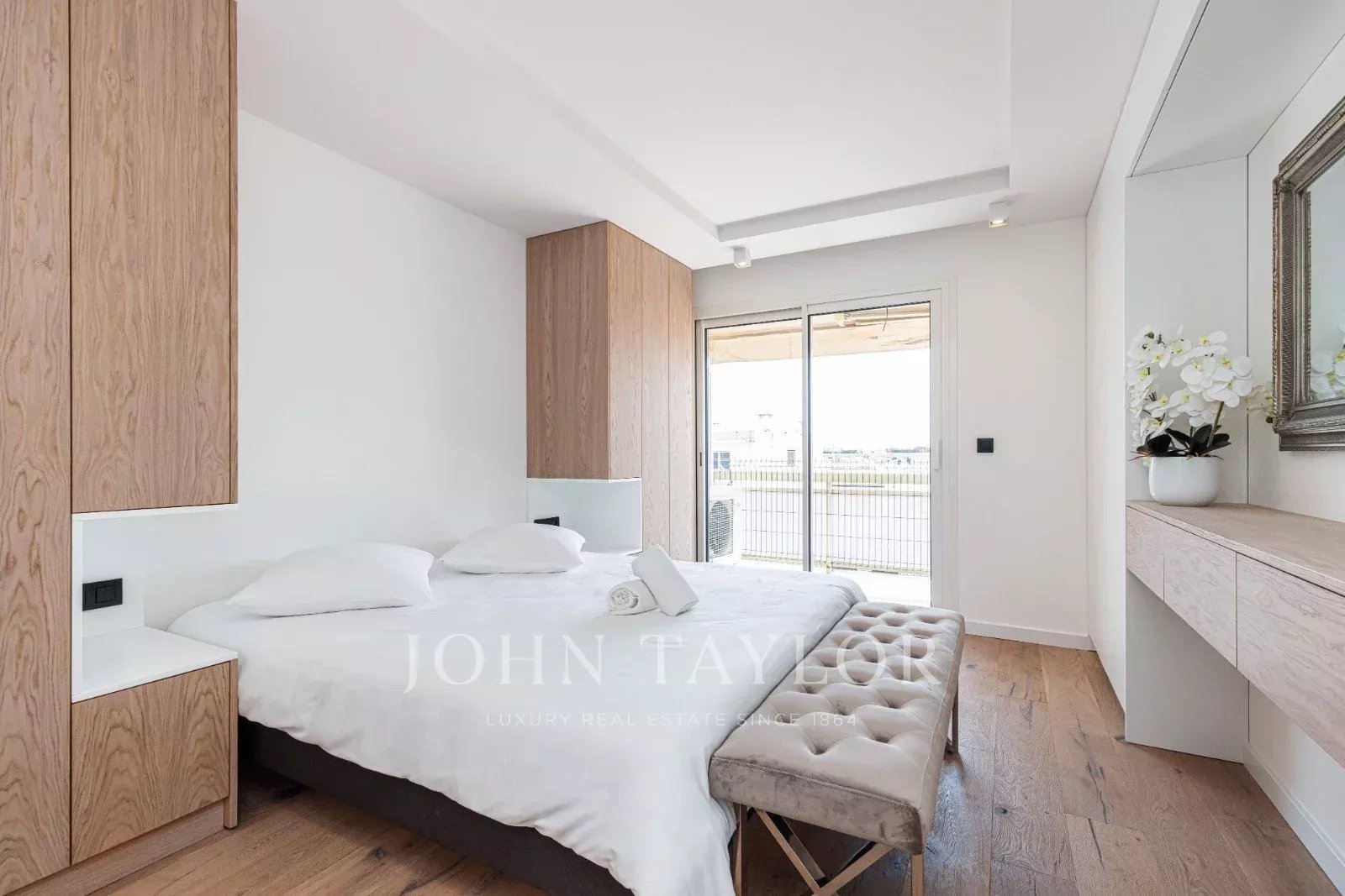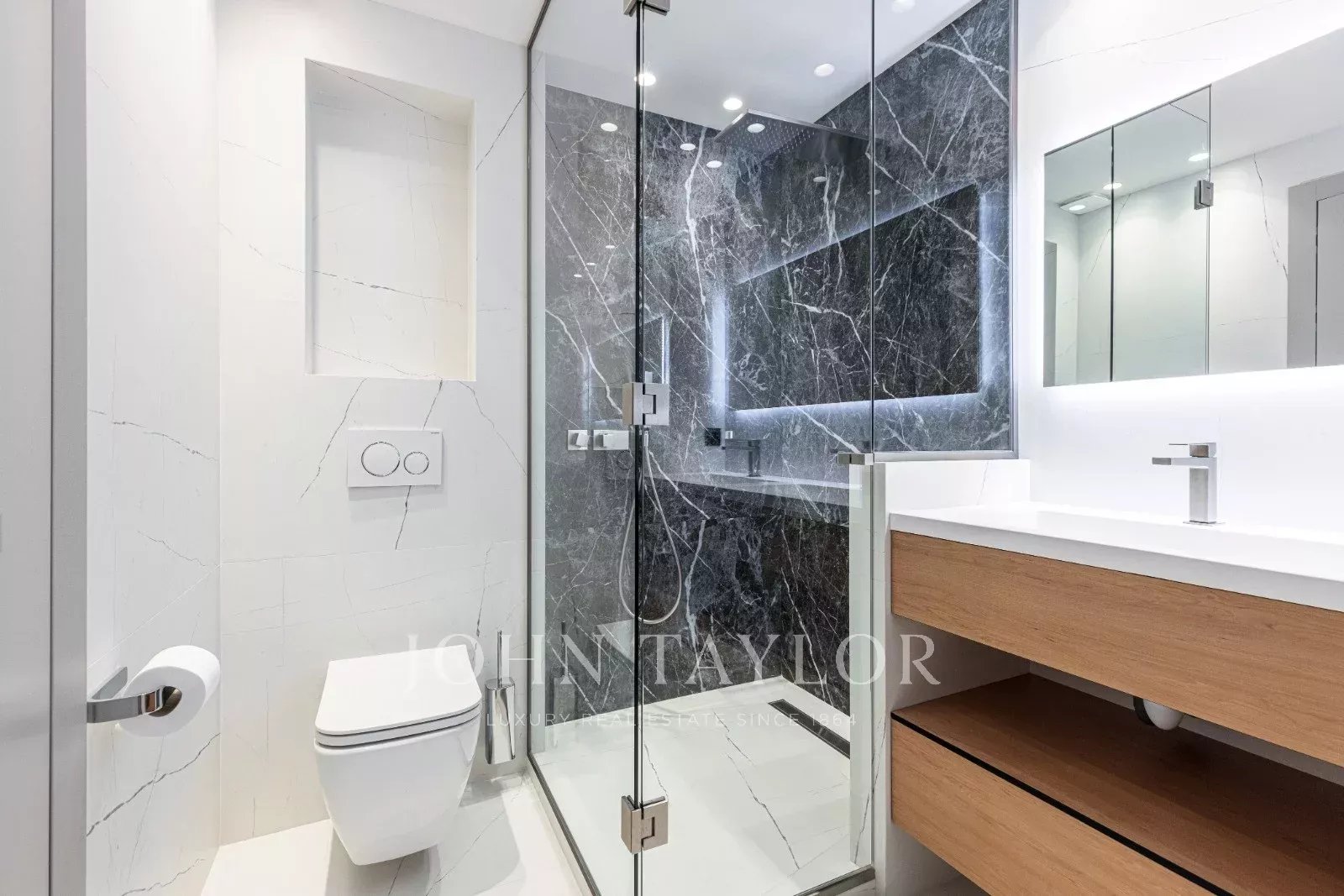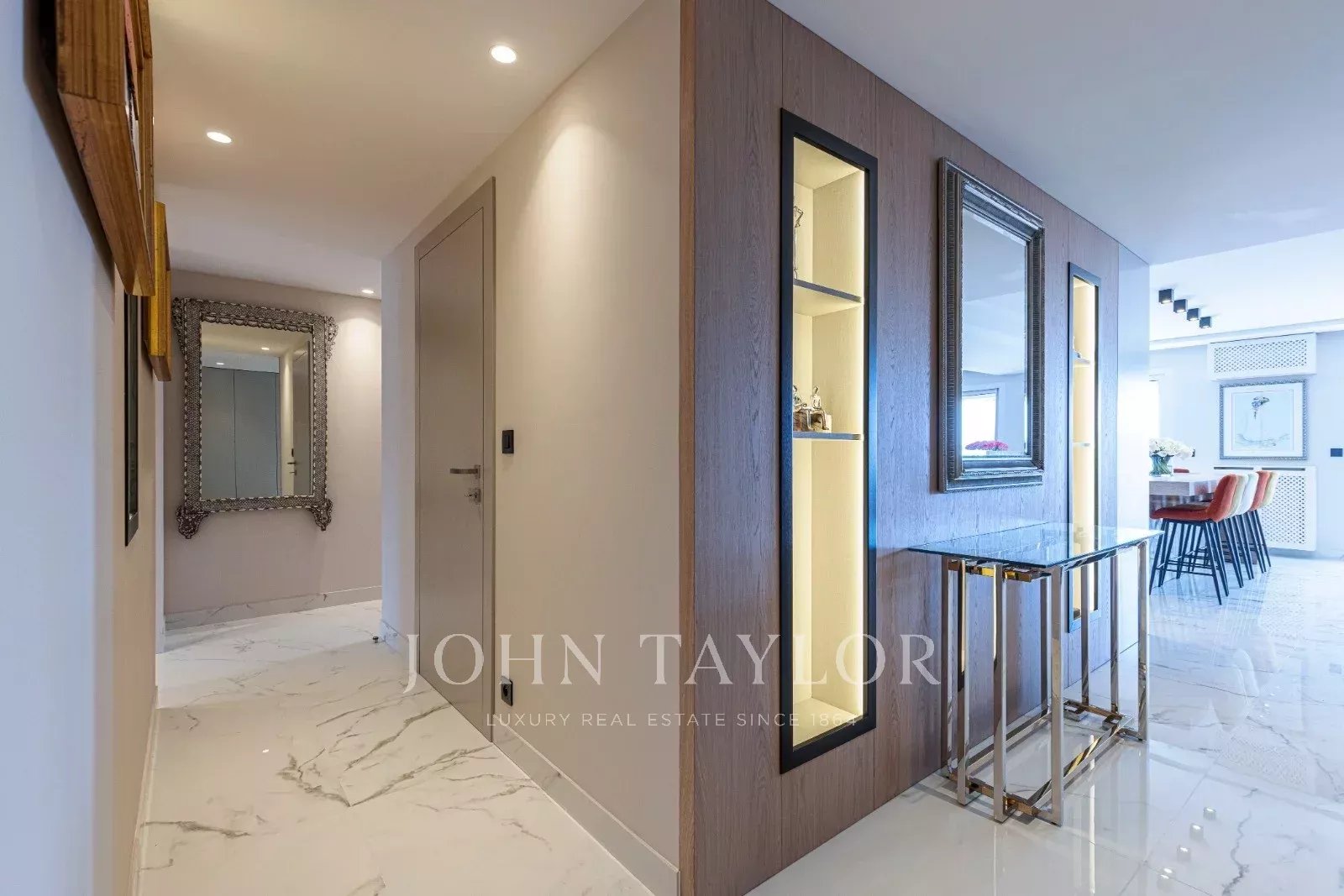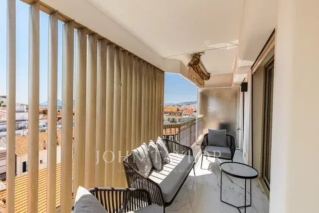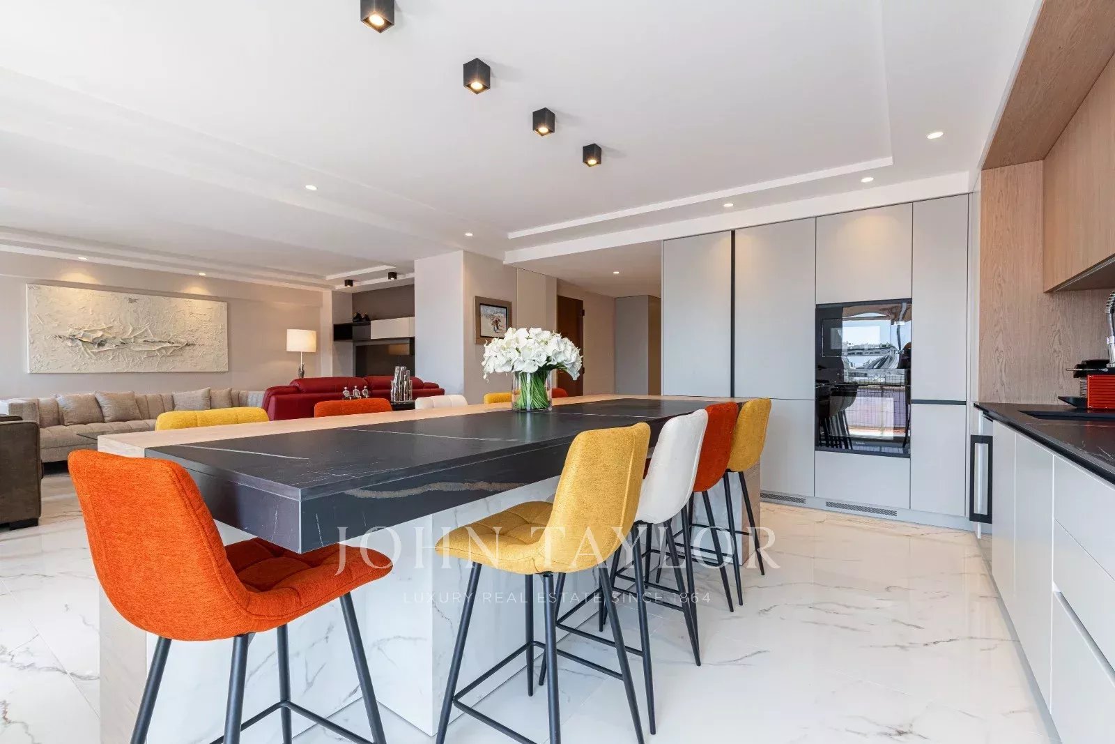 Idéalement situé au cœur du centre ville de Cannes, derrière la rue de d'Antibes et à quelques pas de la Croisette, vaste appartement de style contemporain de 4 chambres d'environ 150m² entièrement rénové et meublé avec soins et terrasse.