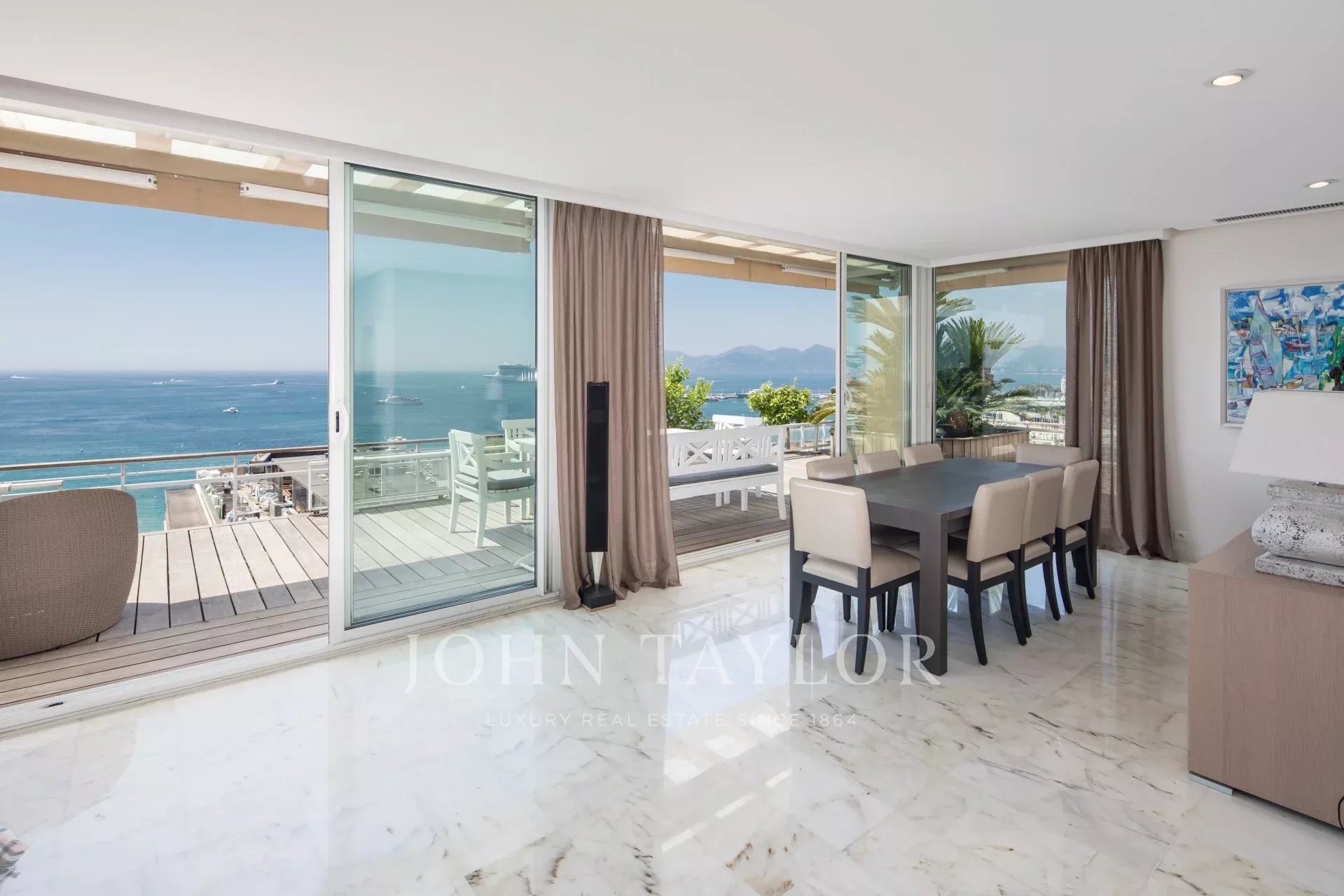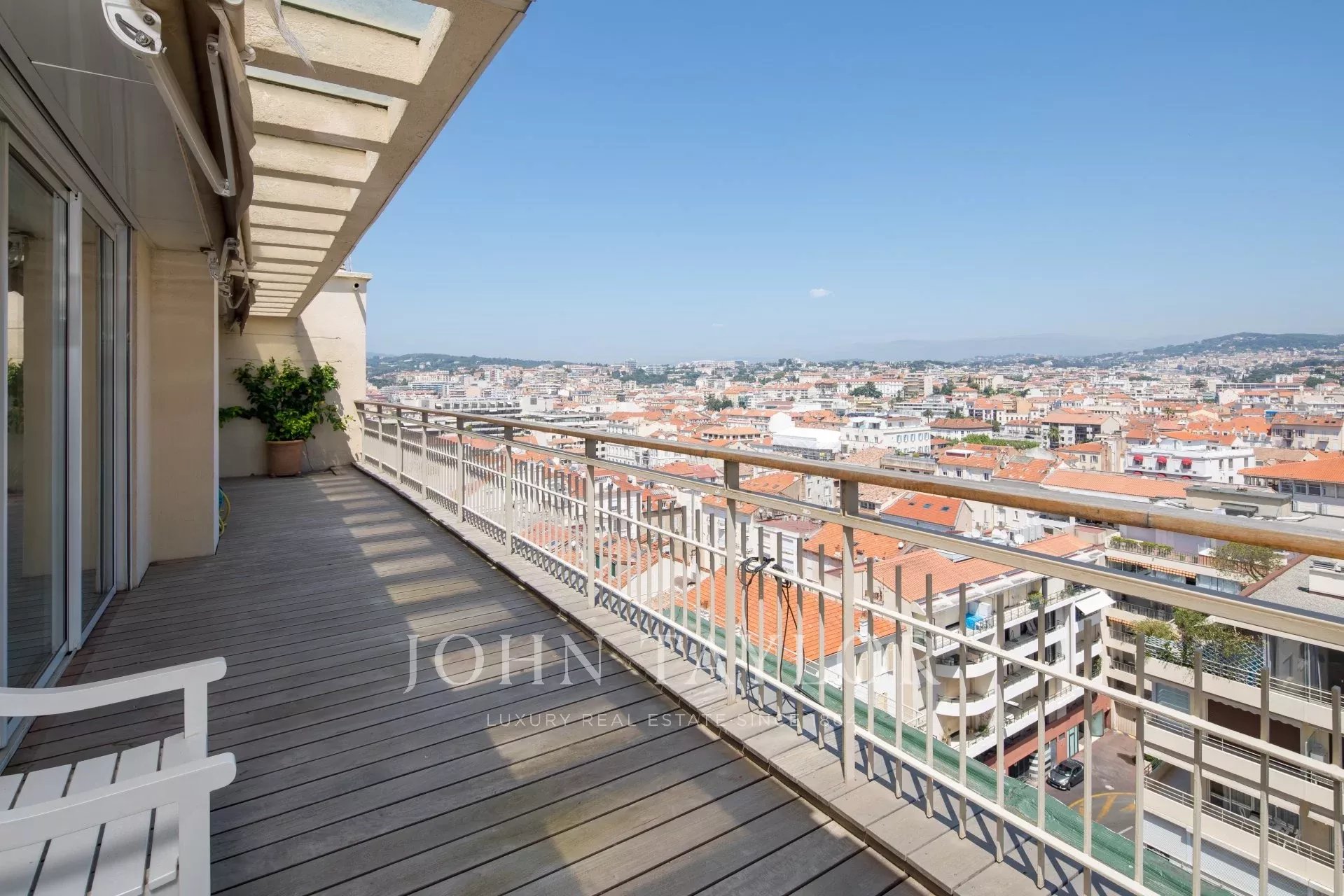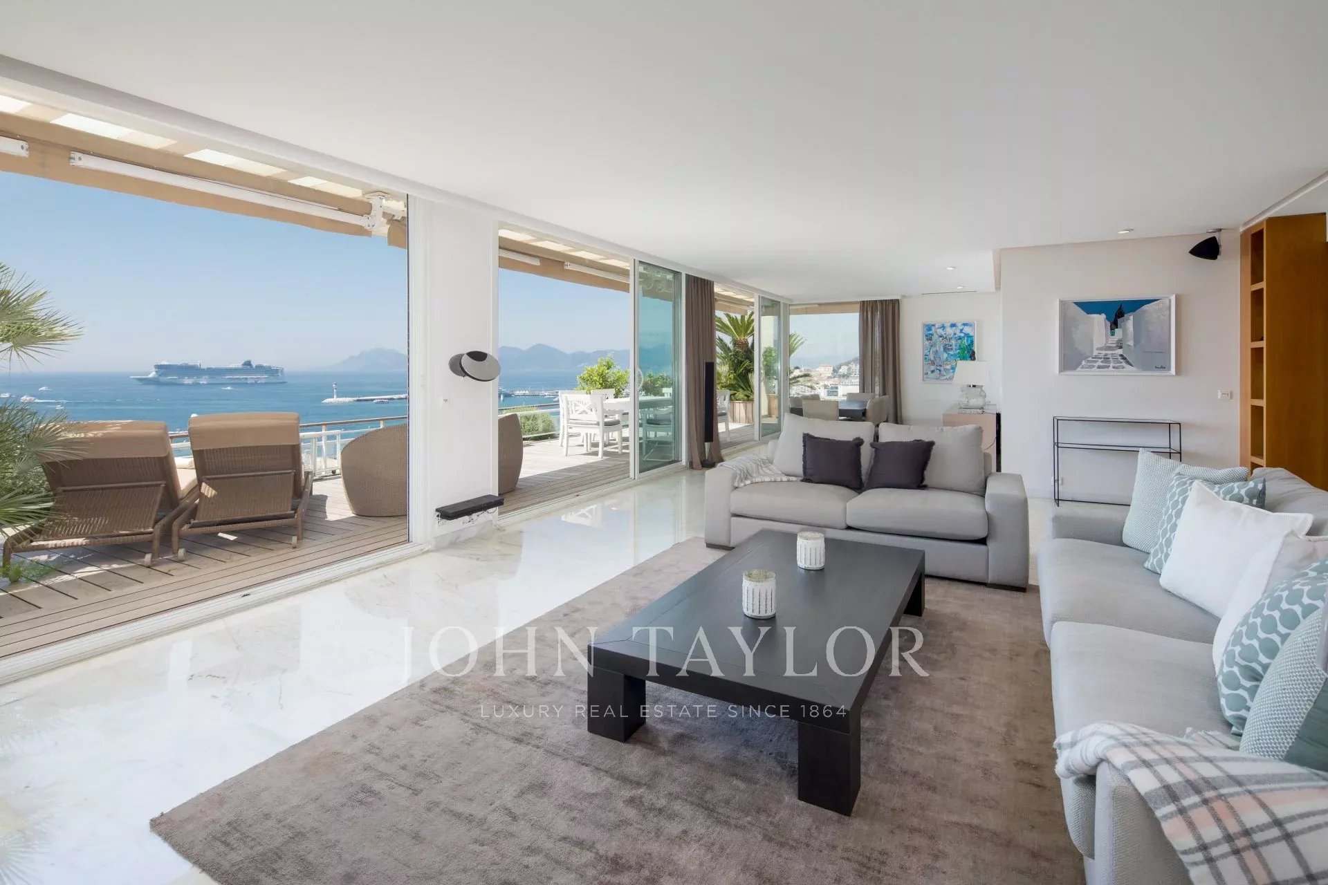 Cet appartement offre toutes les prestations et le confort nécessaire afin d'organiser vos rendez-vous professionnels; Grand appartement de 150 m² avec terrasse de 182m² bénéficiant d'une vue panoramique sur la Baie de Cannes.