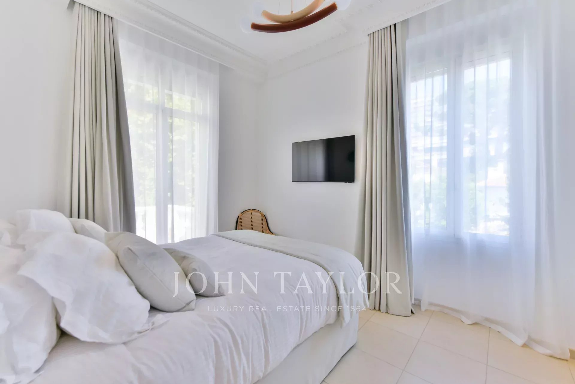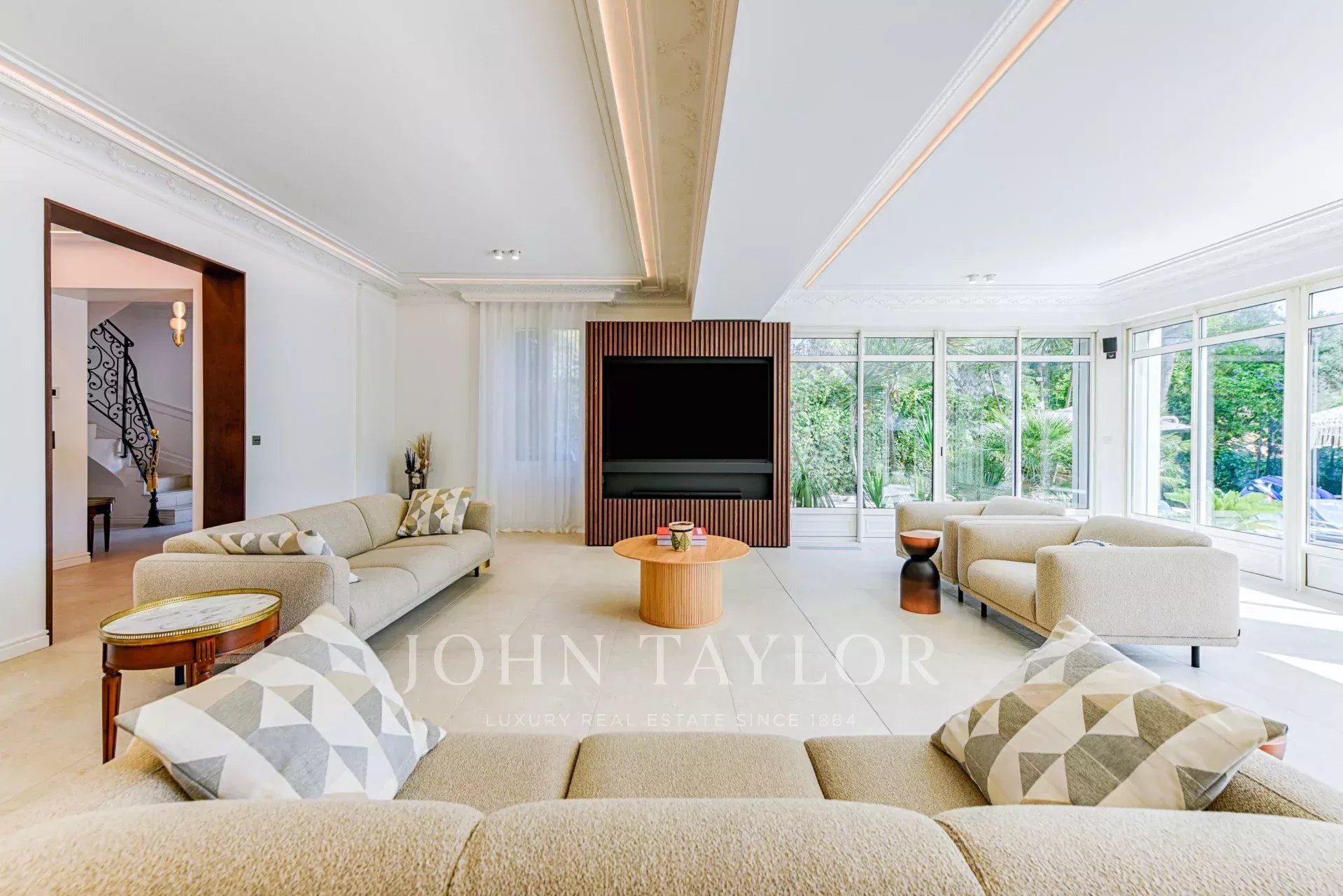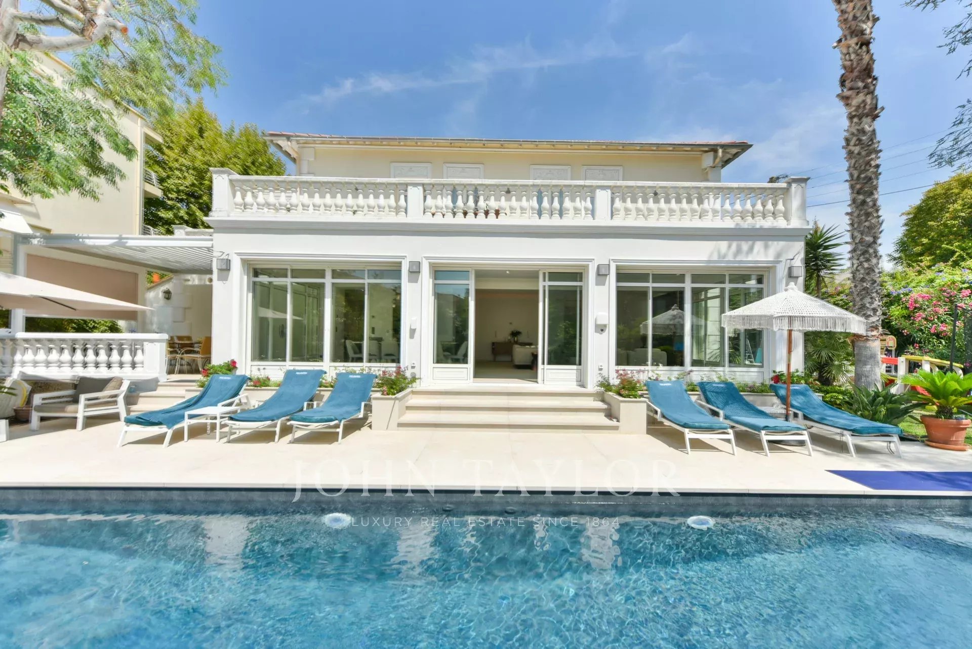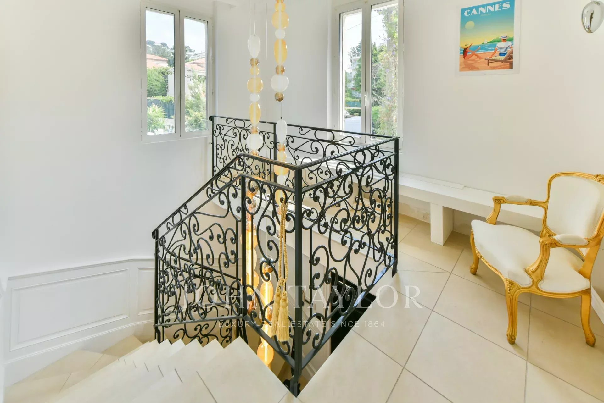 A quelques minutes du centre-ville de Cannes, sur deux niveaux, belle villa entièrement climatisée de 300 m2 habitables. Entièrement rénovée, elle séduit par sa décoration, ses prestations et matériaux haut de gamme et ses belles et grandes terrasses.