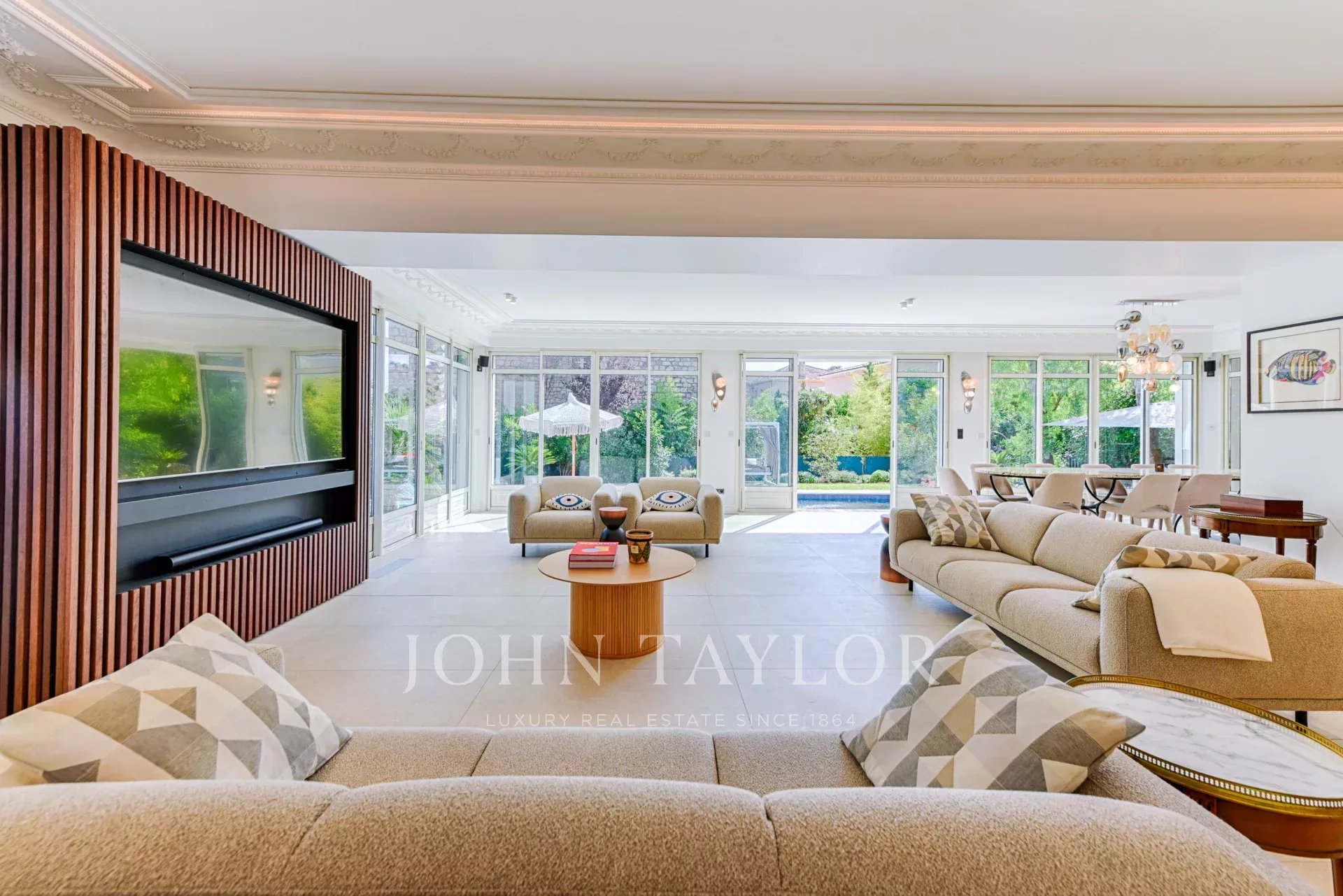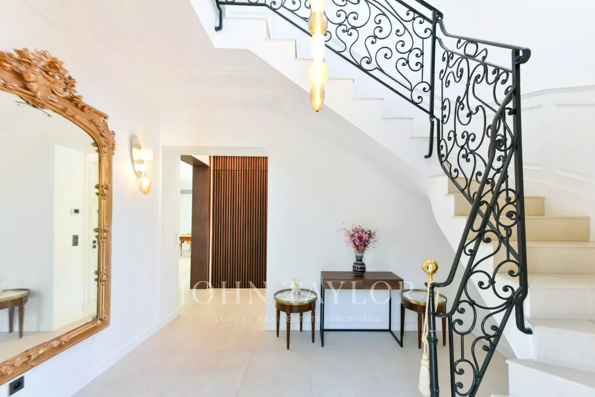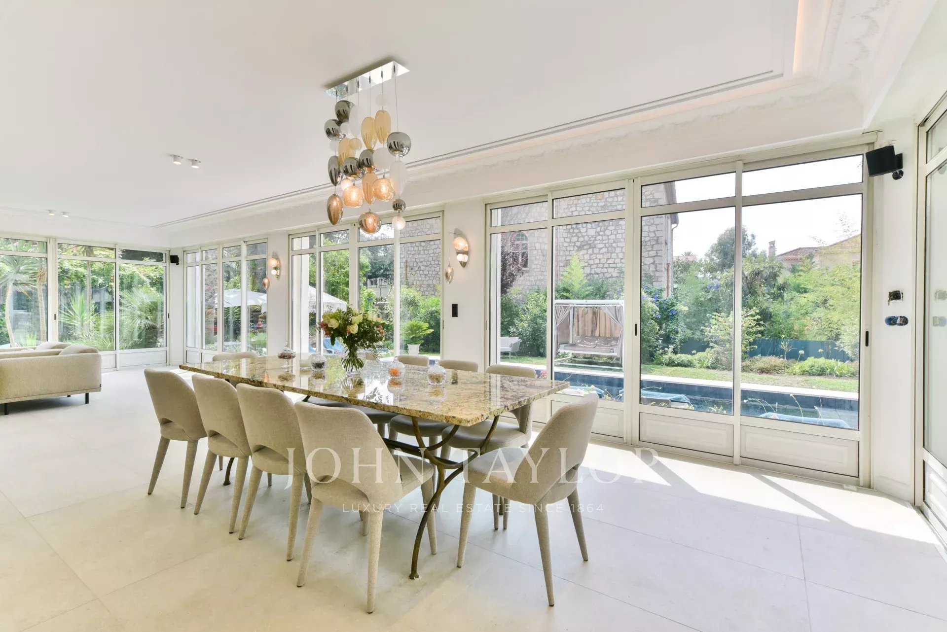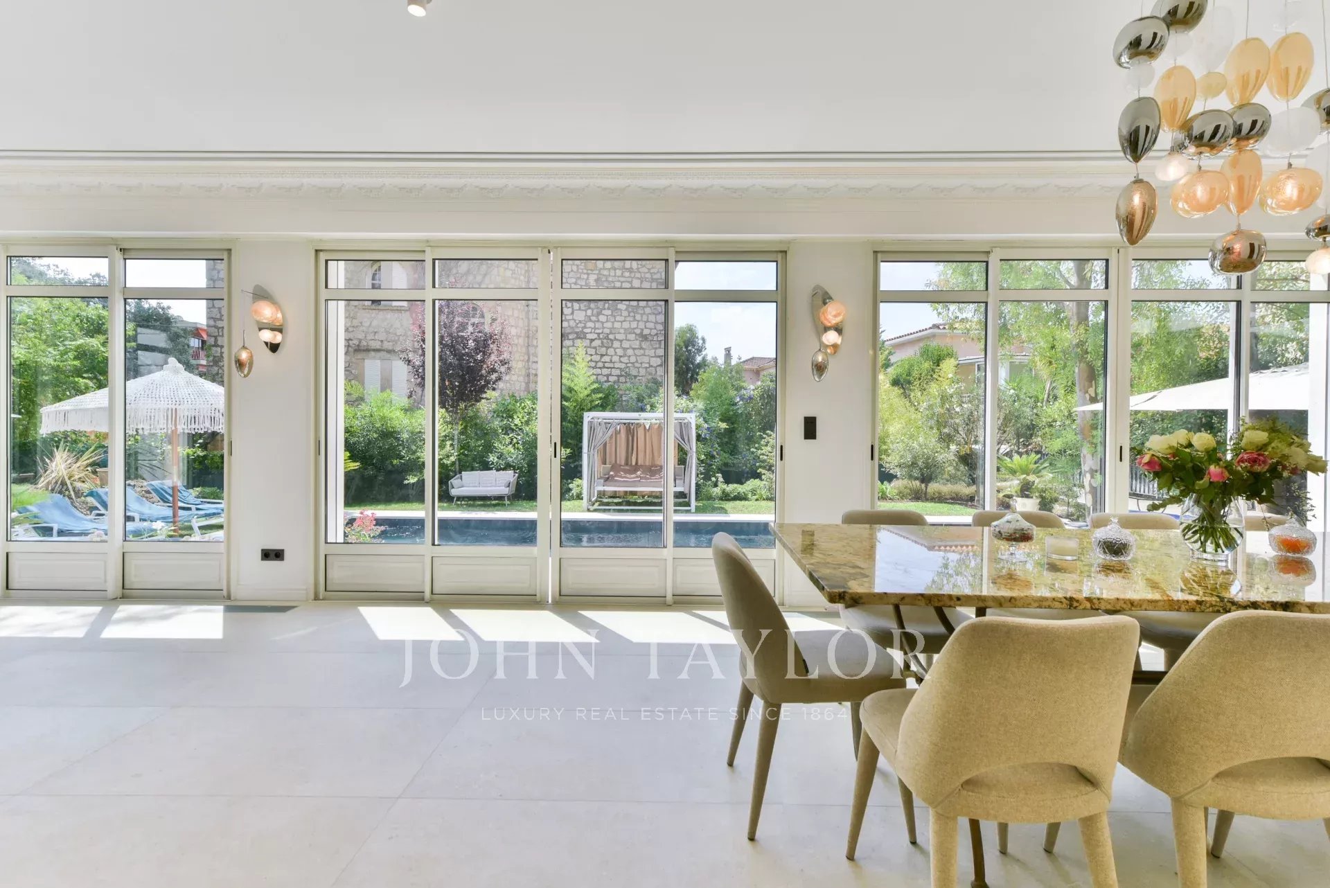 A quelques minutes du centre-ville de Cannes, sur deux niveaux, belle villa entièrement climatisée de 300 m2 habitables. Entièrement rénovée, elle séduit par sa décoration, ses prestations et matériaux haut de gamme et ses belles et grandes terrasses.