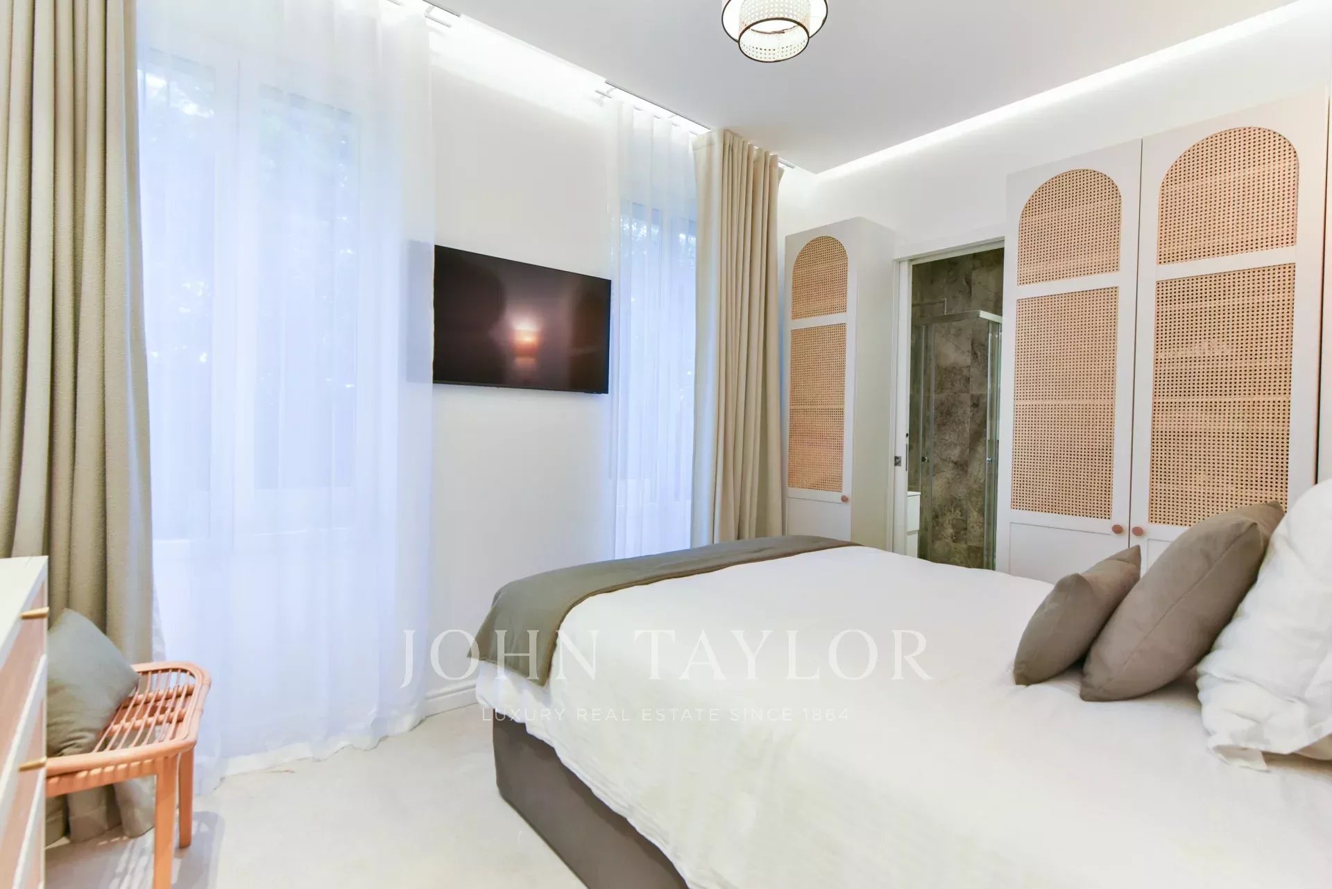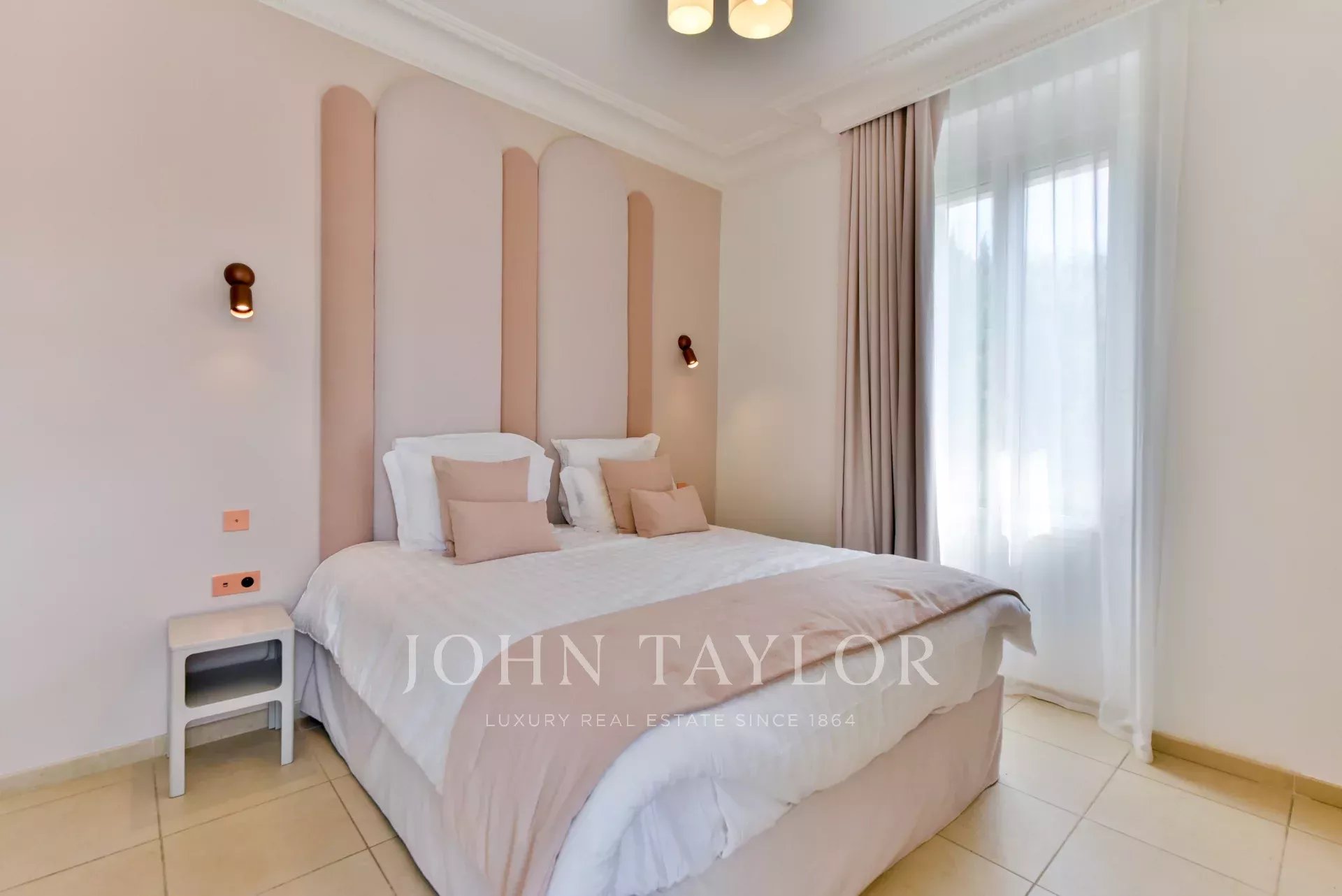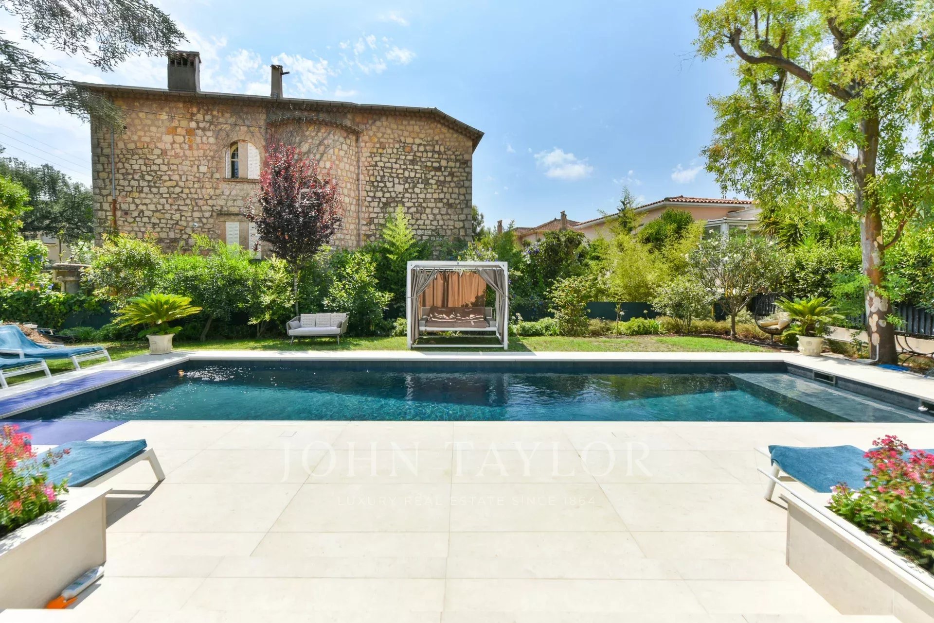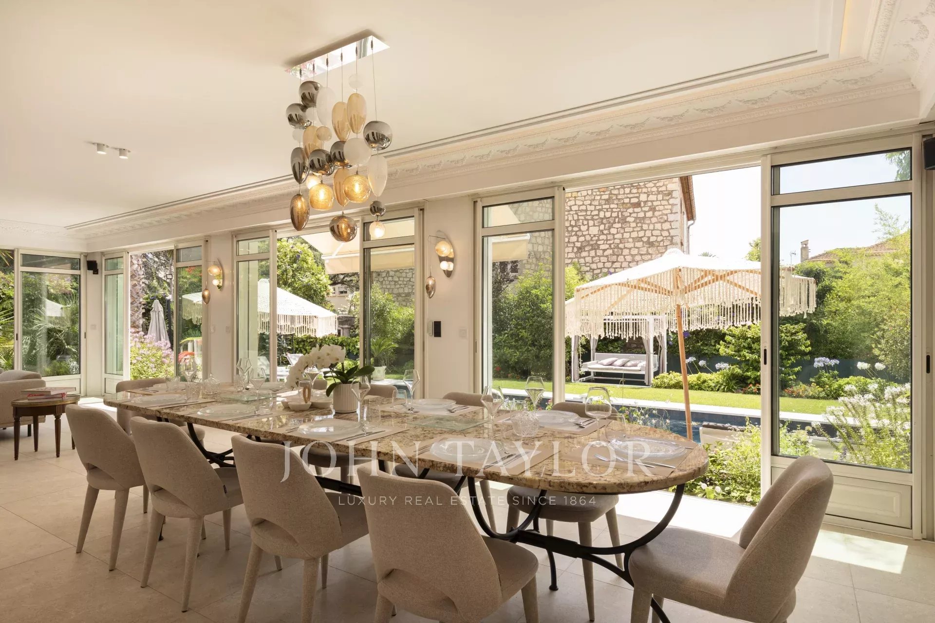A quelques minutes du centre-ville de Cannes, sur deux niveaux, belle villa entièrement climatisée de 300 m2 habitables. Entièrement rénovée, elle séduit par sa décoration, ses prestations et matériaux haut de gamme et ses belles et grandes terrasses.