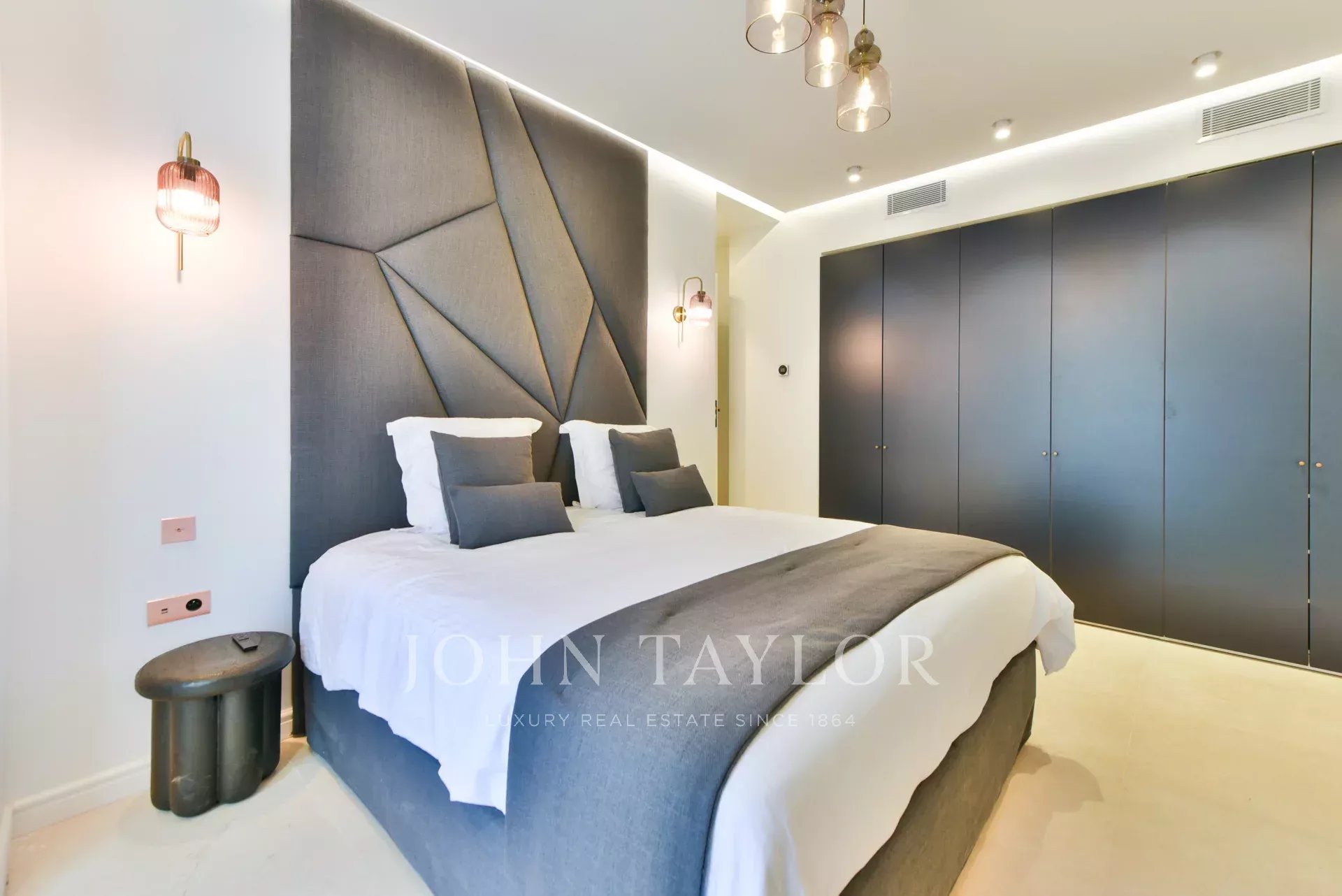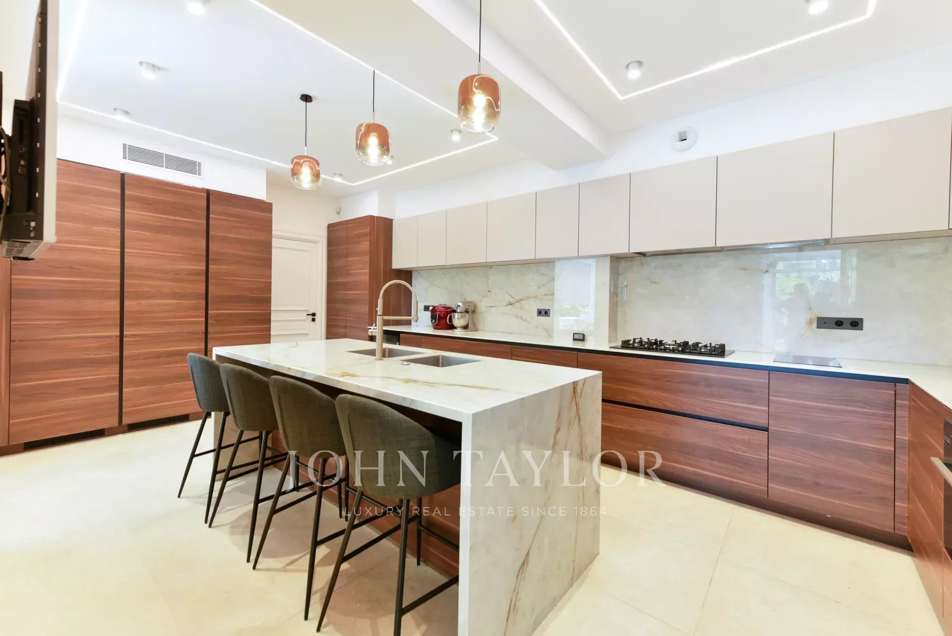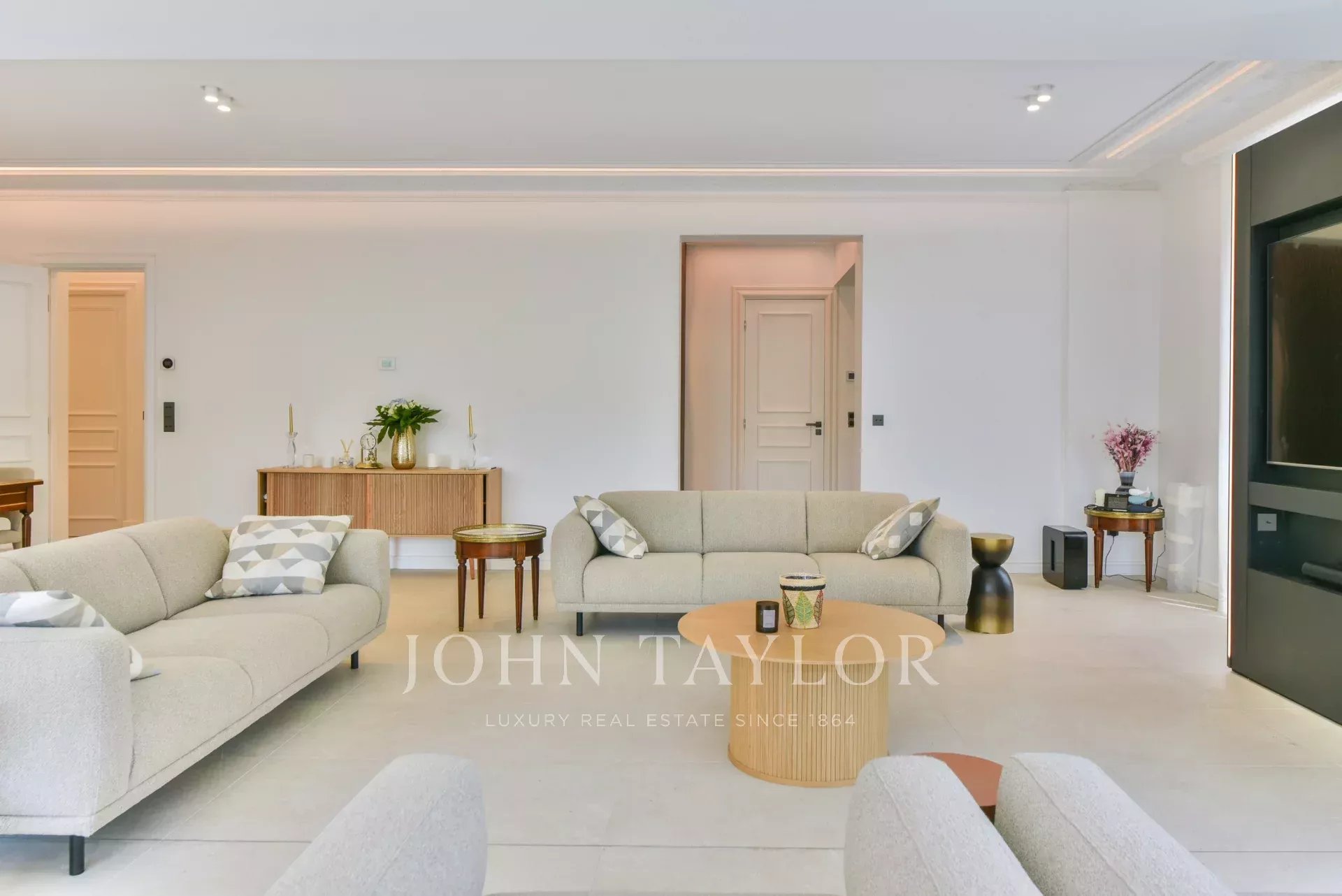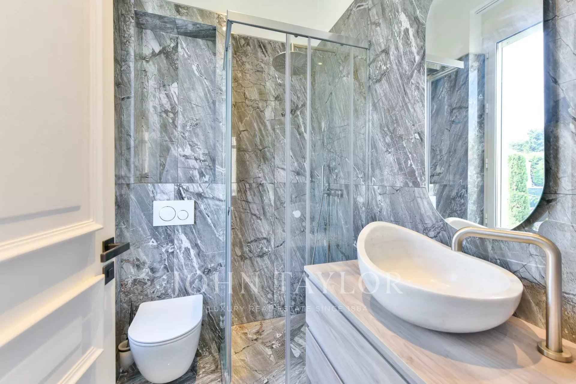 A quelques minutes du centre-ville de Cannes, sur deux niveaux, belle villa entièrement climatisée de 300 m2 habitables. Entièrement rénovée, elle séduit par sa décoration, ses prestations et matériaux haut de gamme et ses belles et grandes terrasses.