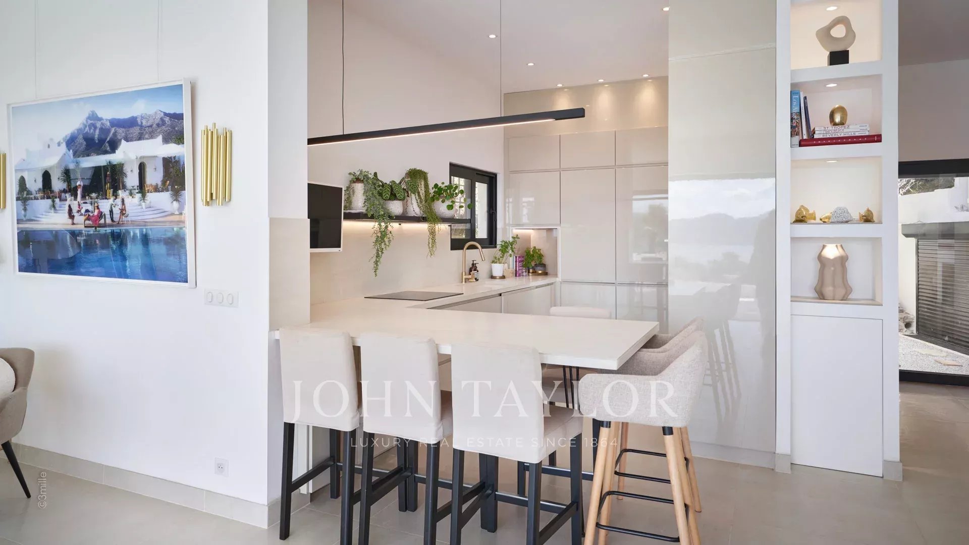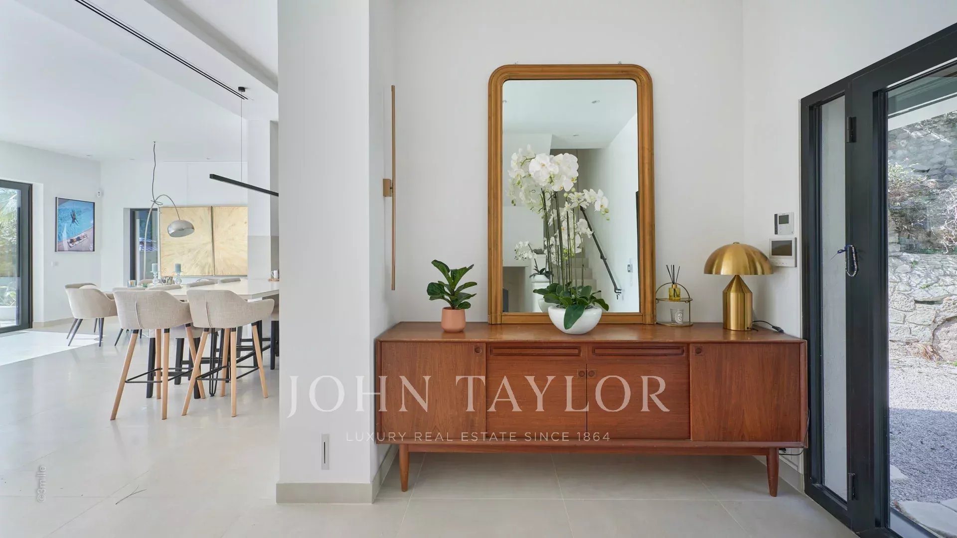 Entrée menant à la pièce de réception comprenant, salon, salle à manger et cuisine américaine, le tout s’ouvrant sur la terrasse et la piscine, vue mer