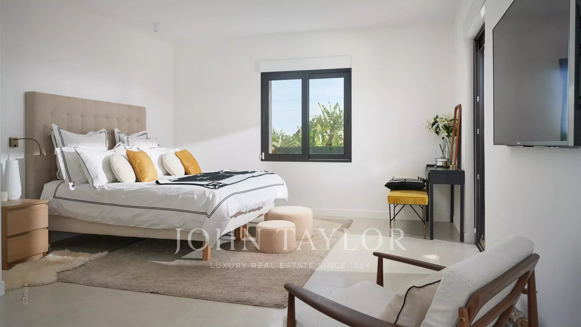 Chambre (lit double) TV s'ouvrant sur le jardin et la piscine vue mer.