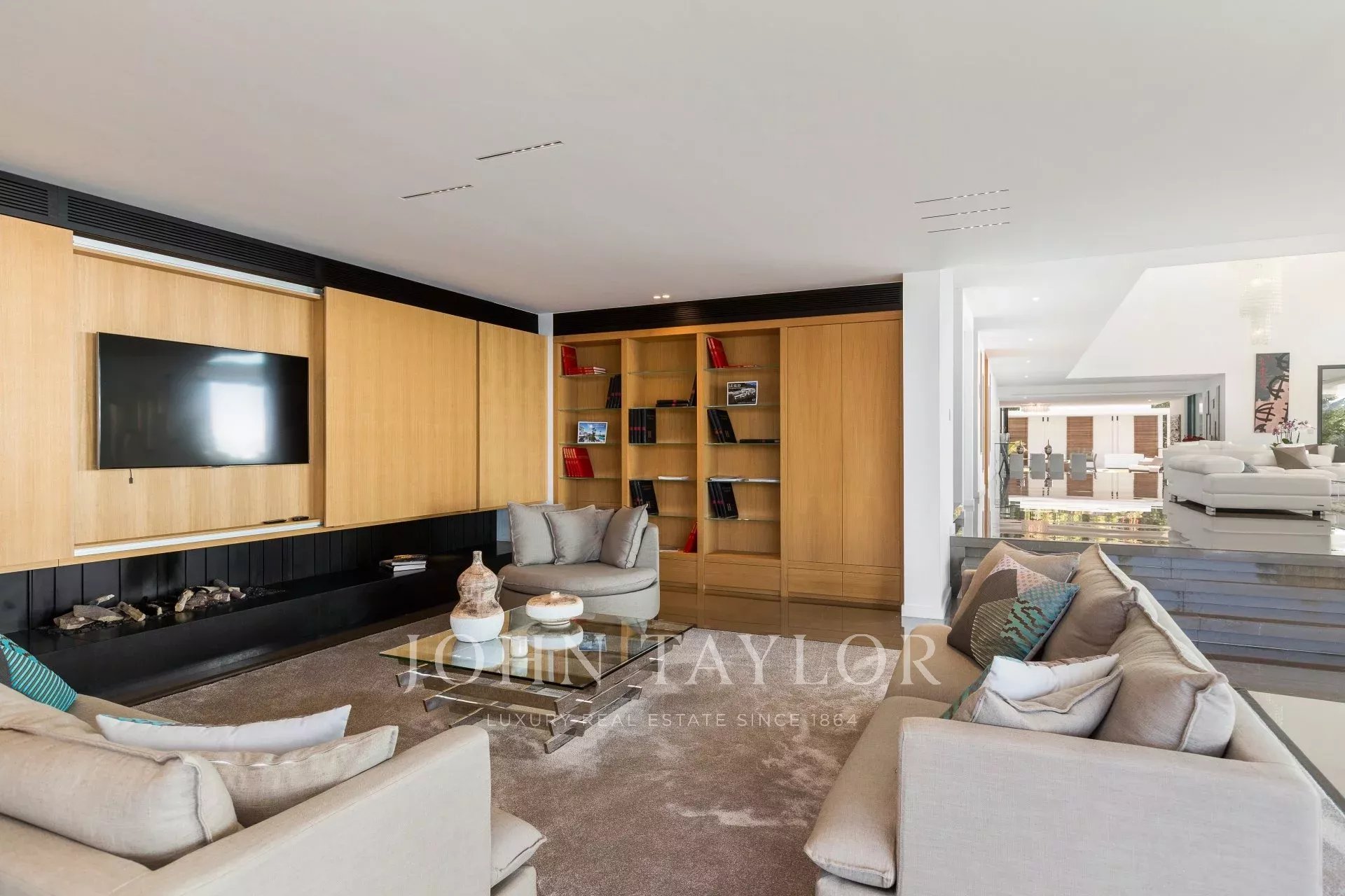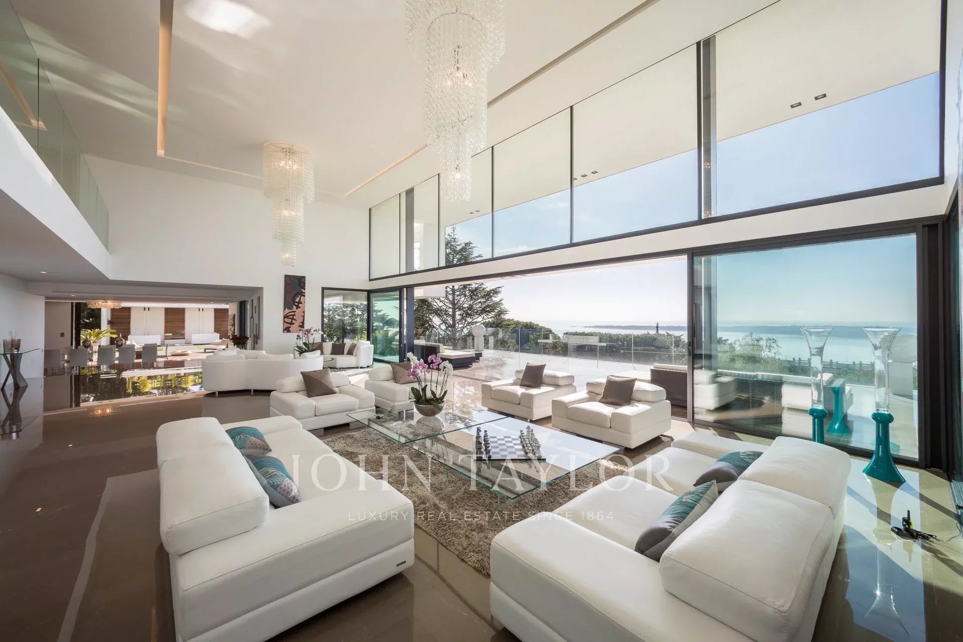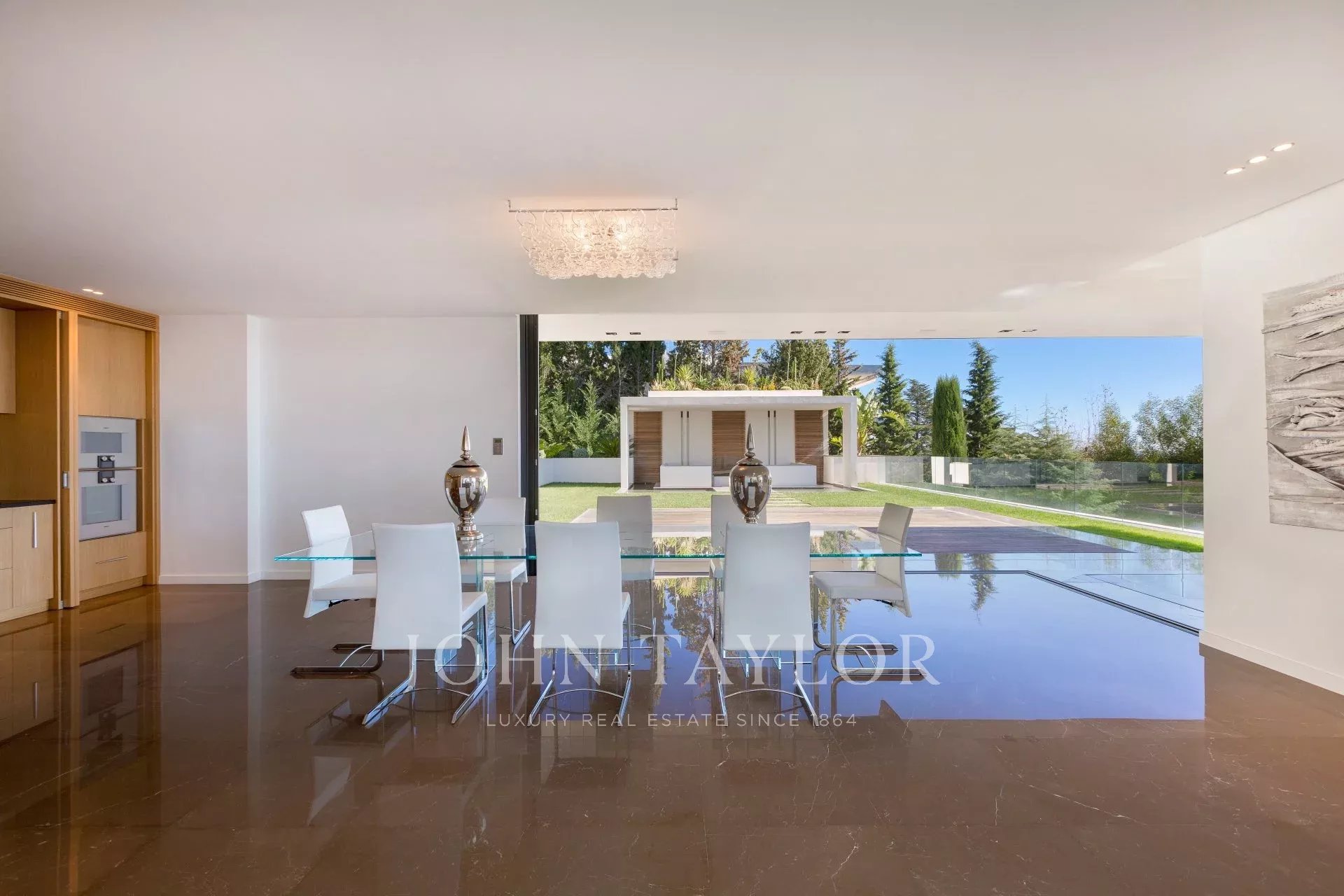 Entrée donnant sur une vaste salle de réception d'environ 250m² comprenant salon, salle à manger avec cuisine américaine et s’ouvrant sur de belles terrasses