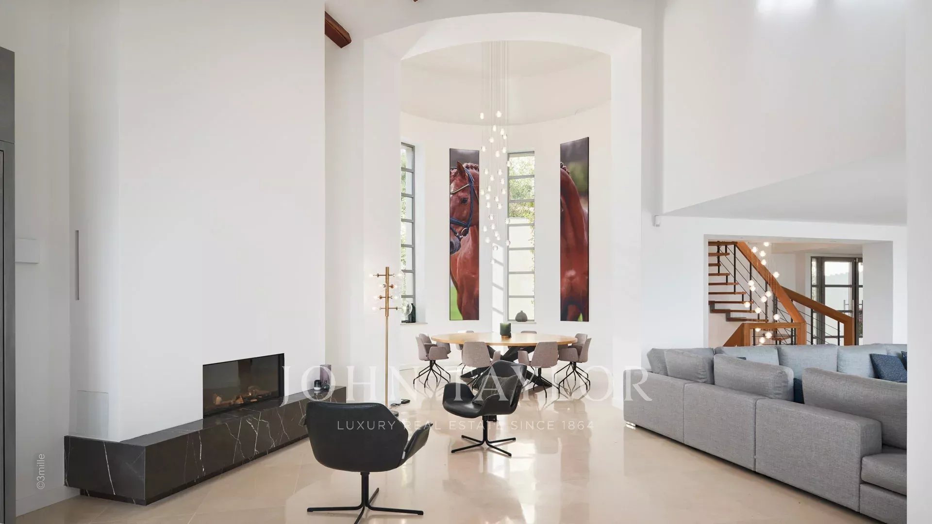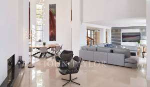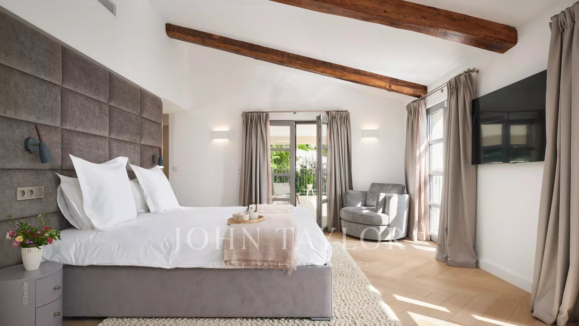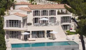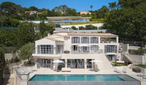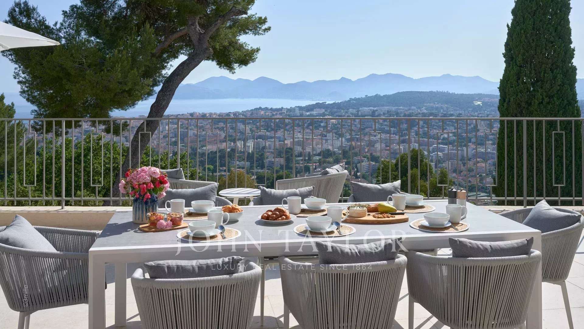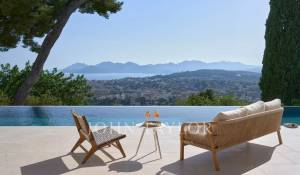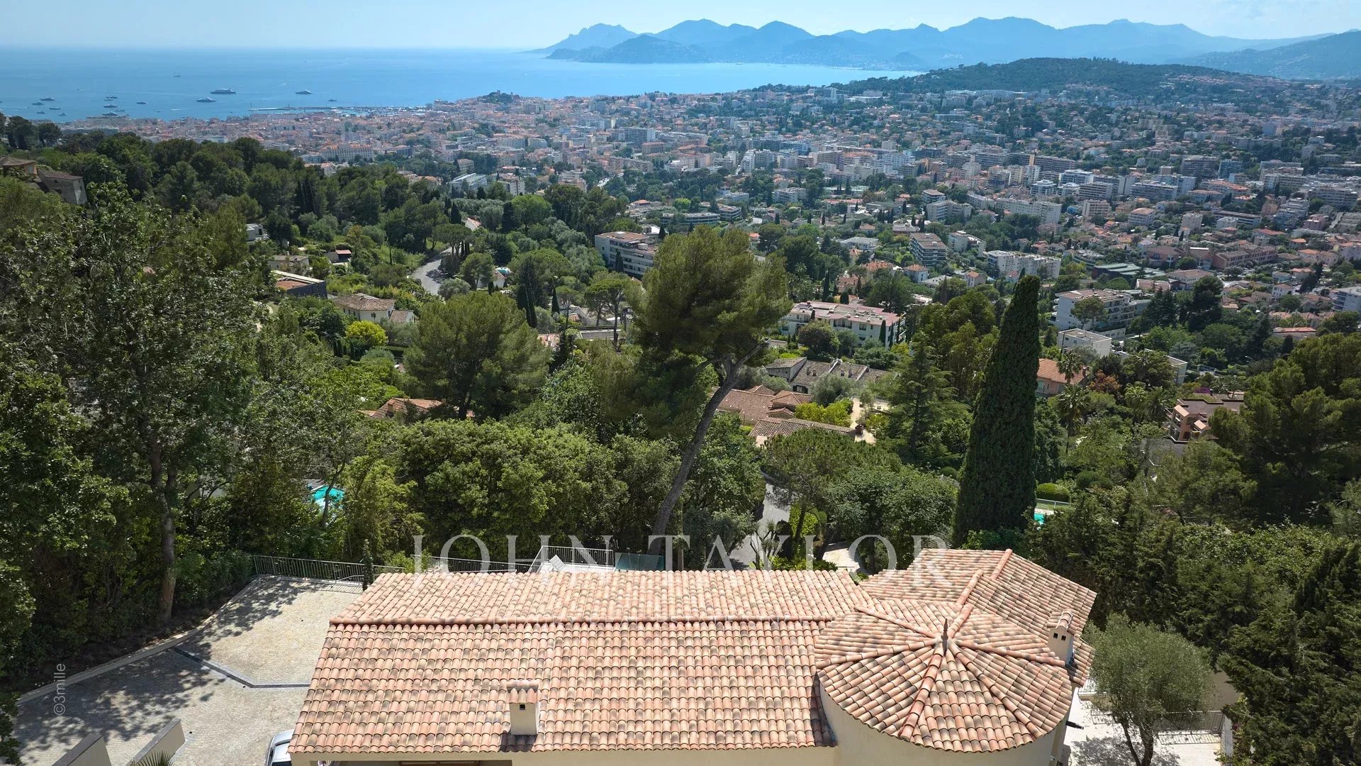 Sur les hauteurs de Cannes, cette belle villa entièrement rénovée avec de belles prestations d'environ 340 m², édifiée sur un jardin paysager d'environ 2 300 m² avec piscine, offre de larges volumes de réception et une vue panoramique sur la baie de Cannes, l'Estérel et la mer.