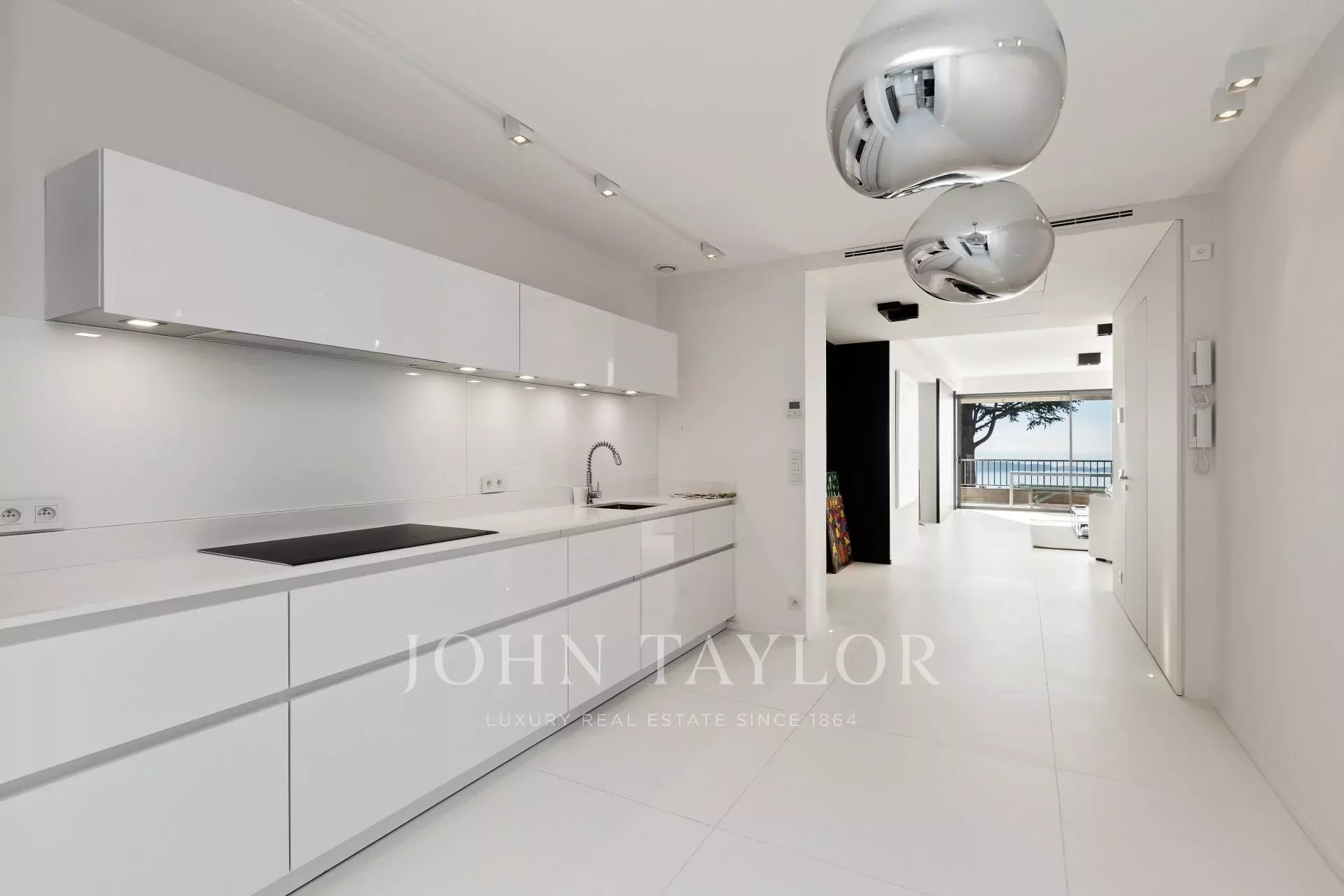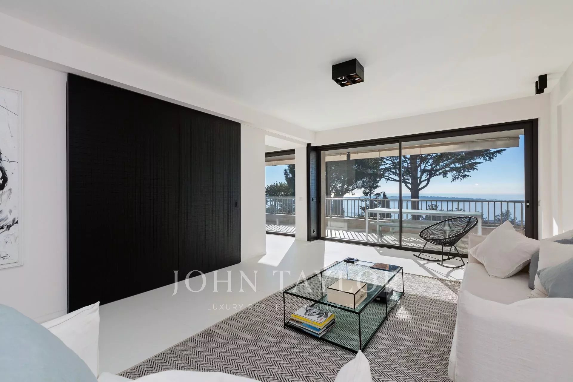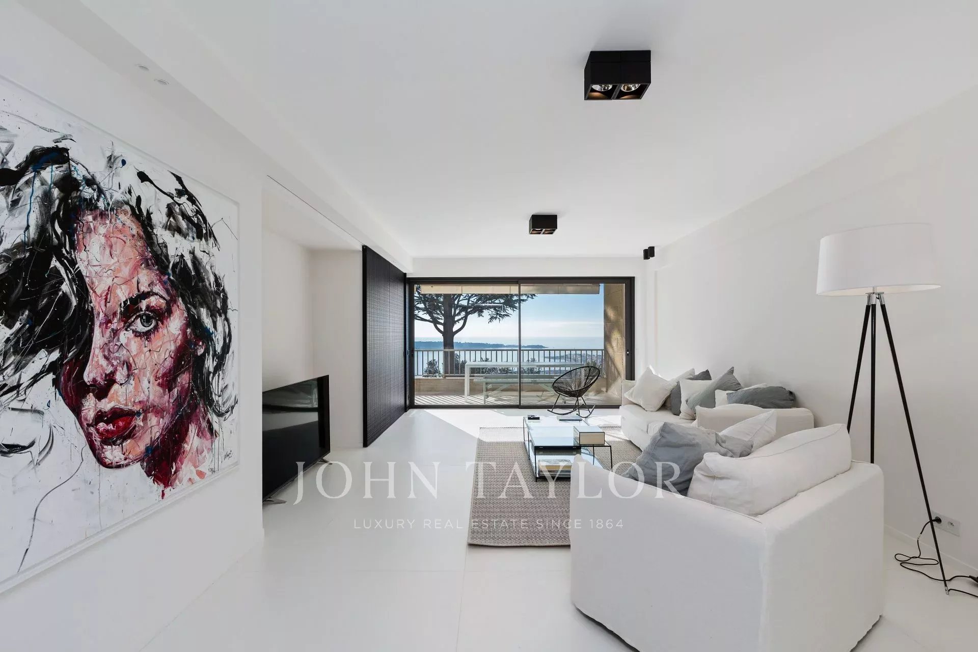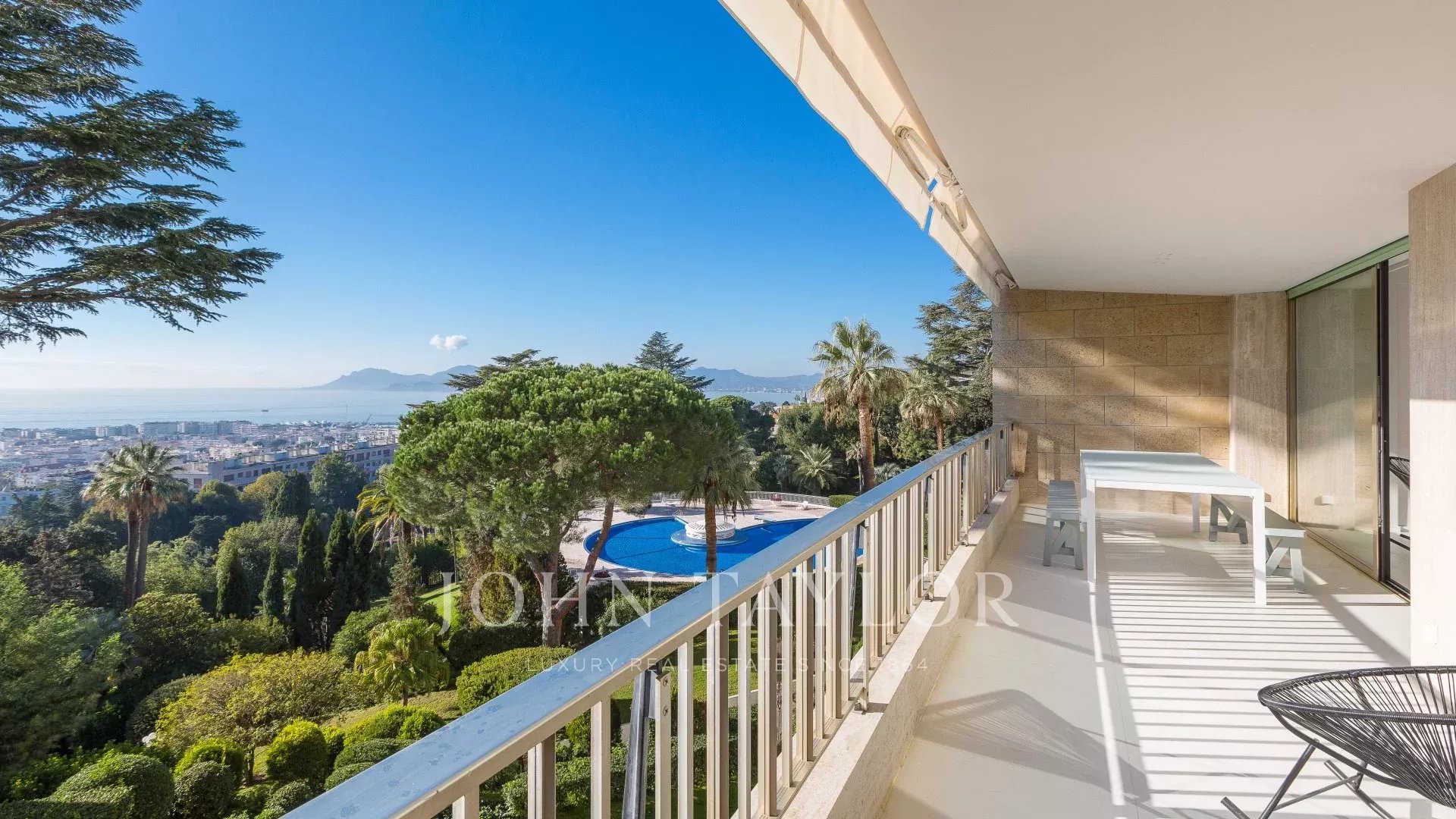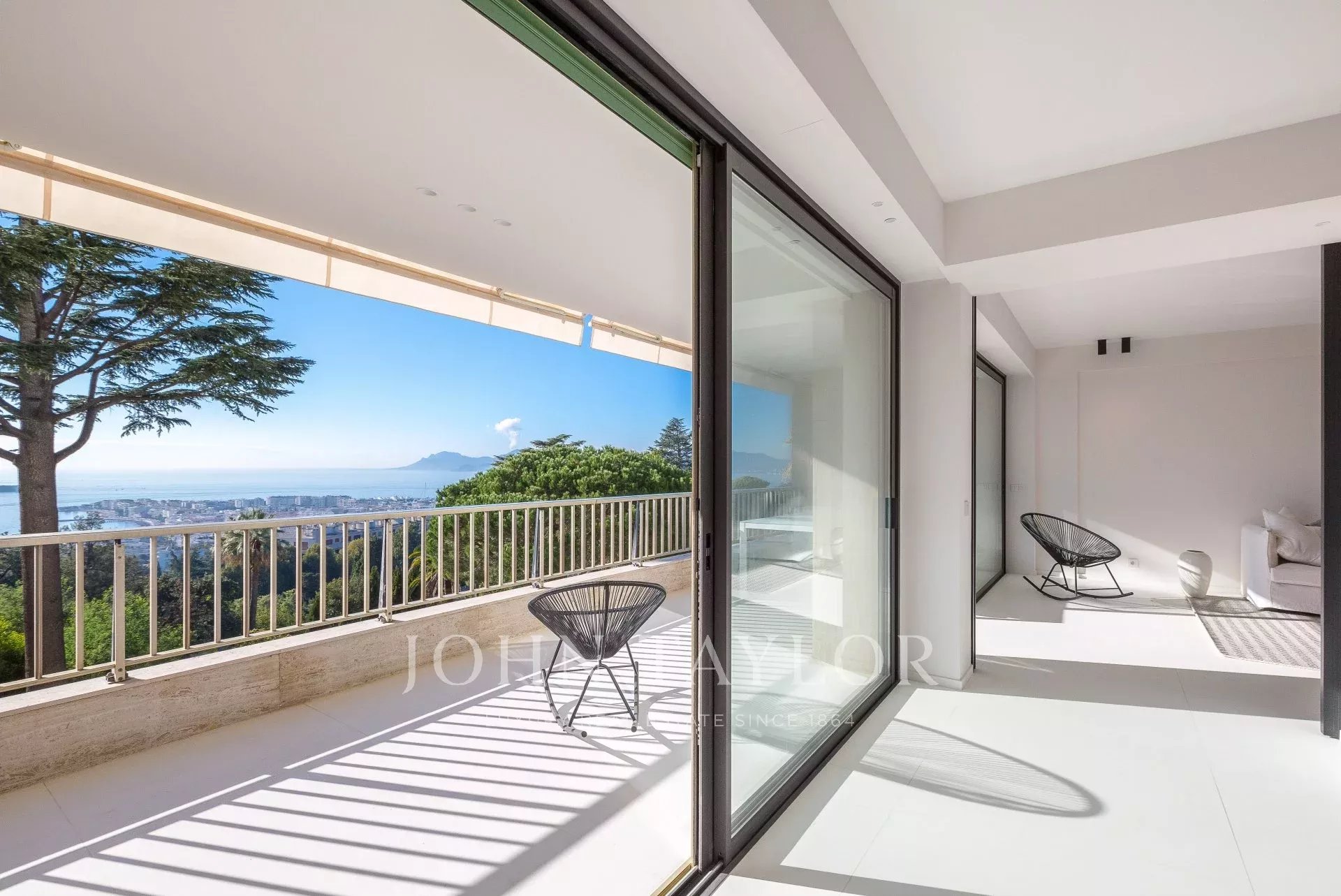 Dans une résidence de standing avec piscine, bel appartement climatisé entièrement rénové dans un style contemporain jouissant d'une vue sur la Baie de Cannes.