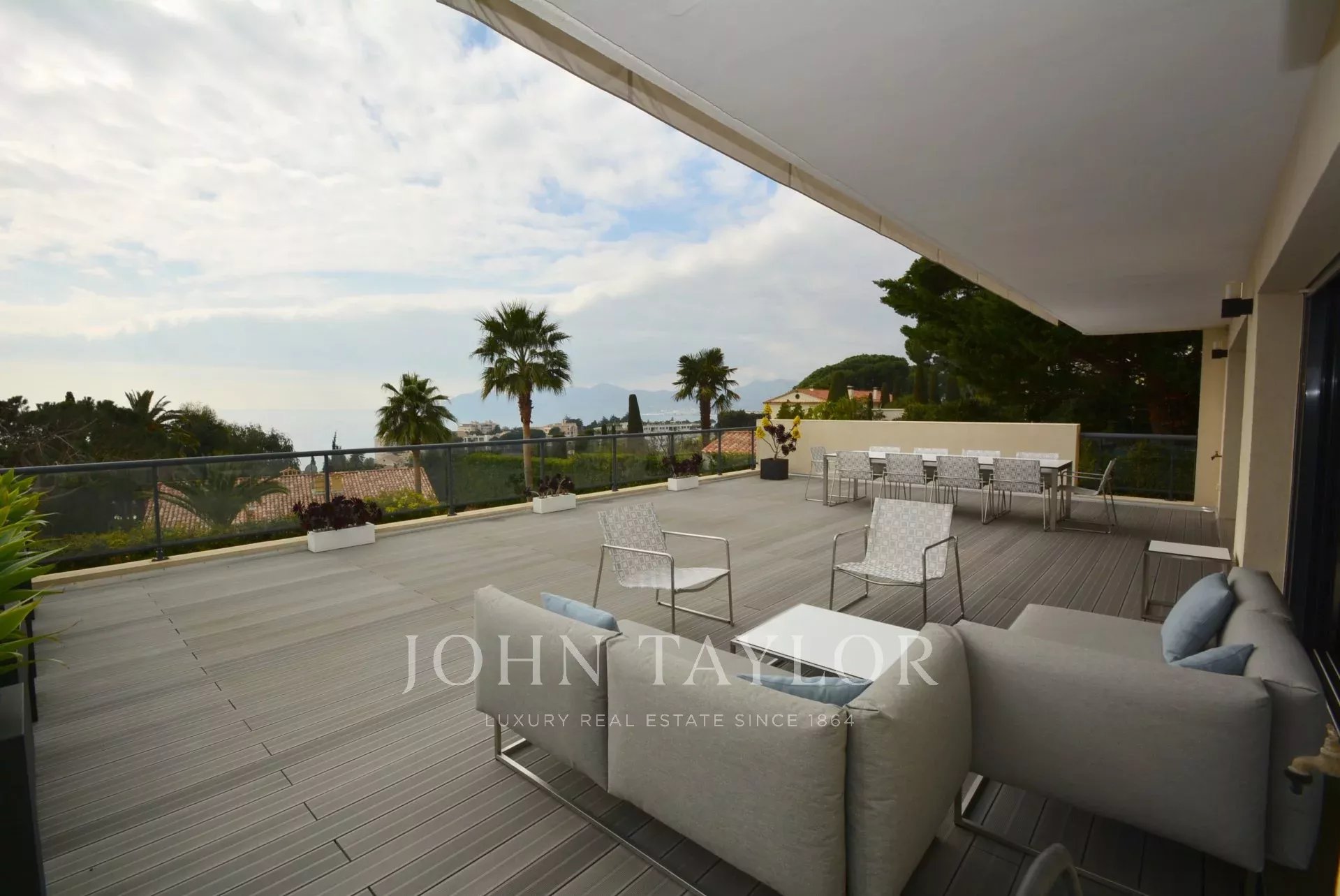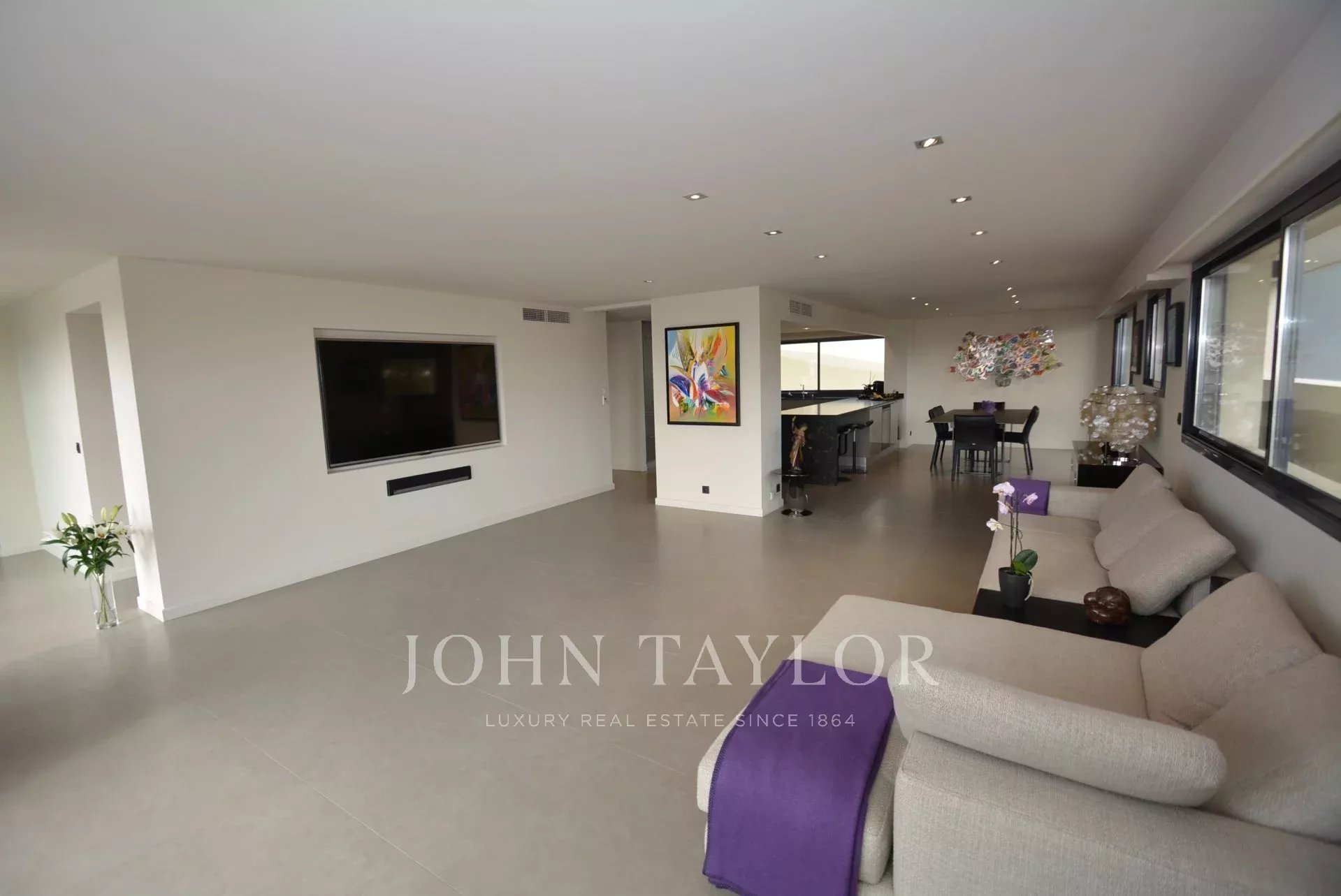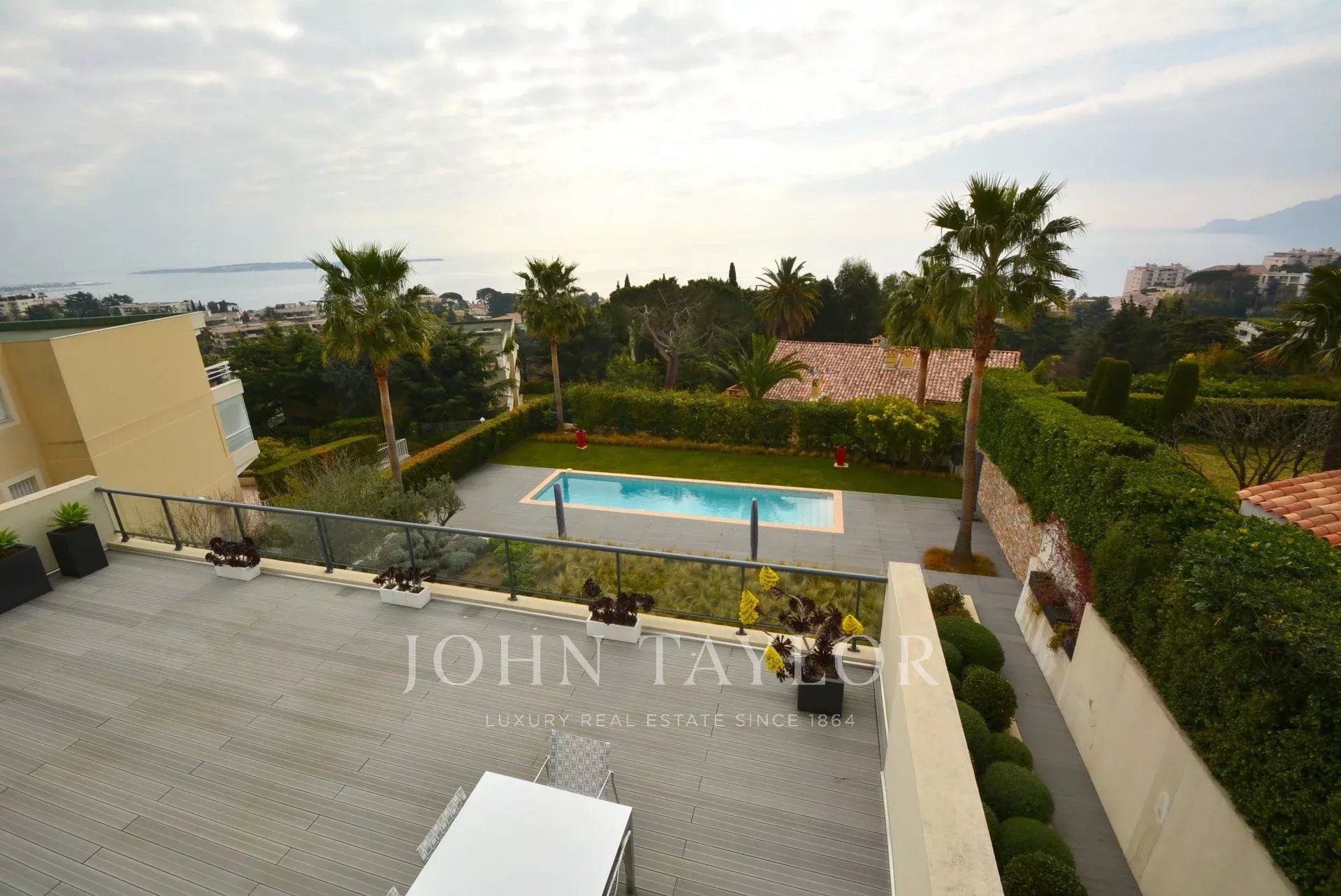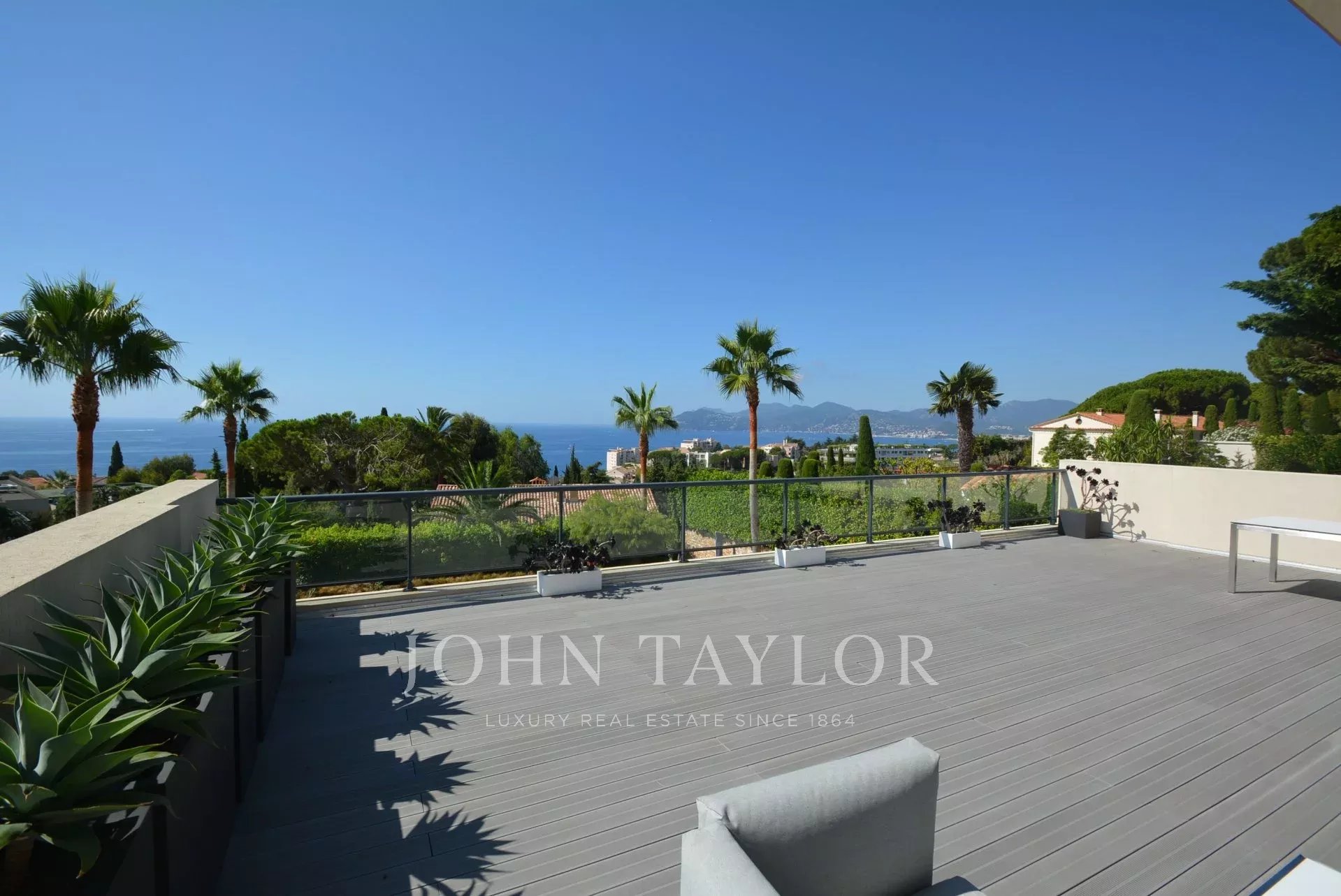 Quartier « CROIX DES GARDES », à dix minutes du centre-ville de Cannes et du Palais des Festivals, jouissant d'une magnifique vue sur la baie de Cannes, les Iles de Lérins et l'Estérel, appartement entièrement climatisé au dernier étage d’une résidence de 3 appartements avec jardin et piscine pouvant être chauffée.