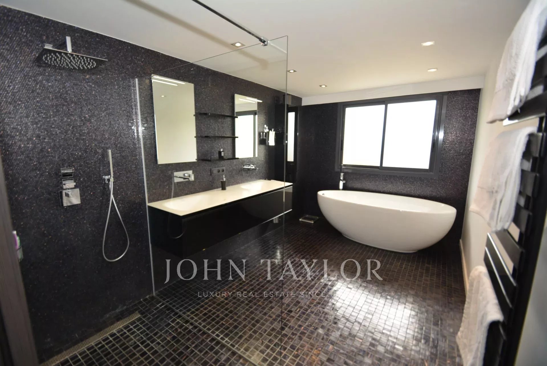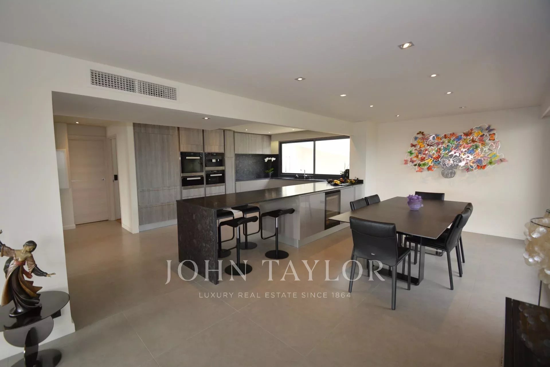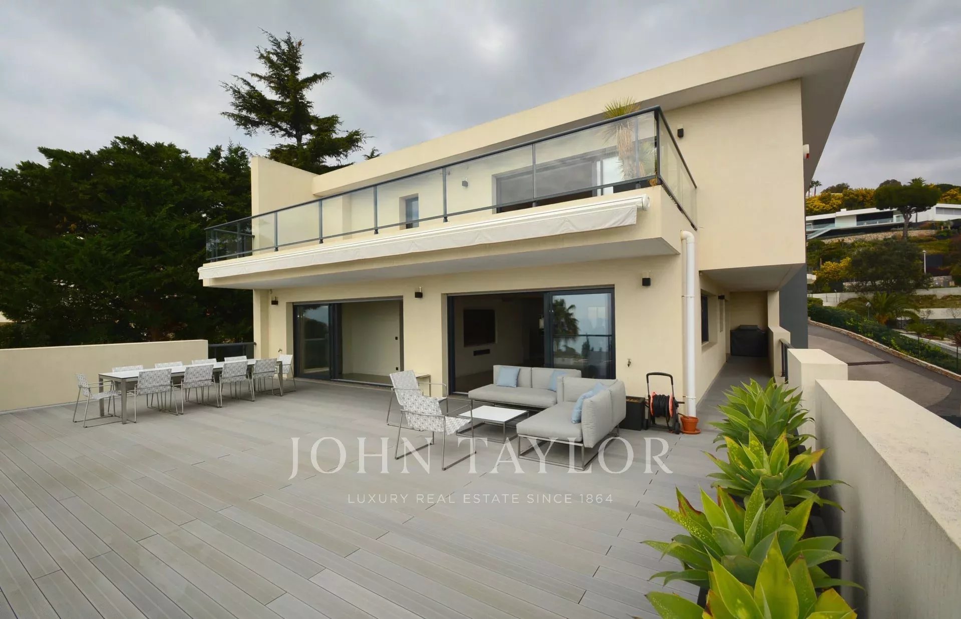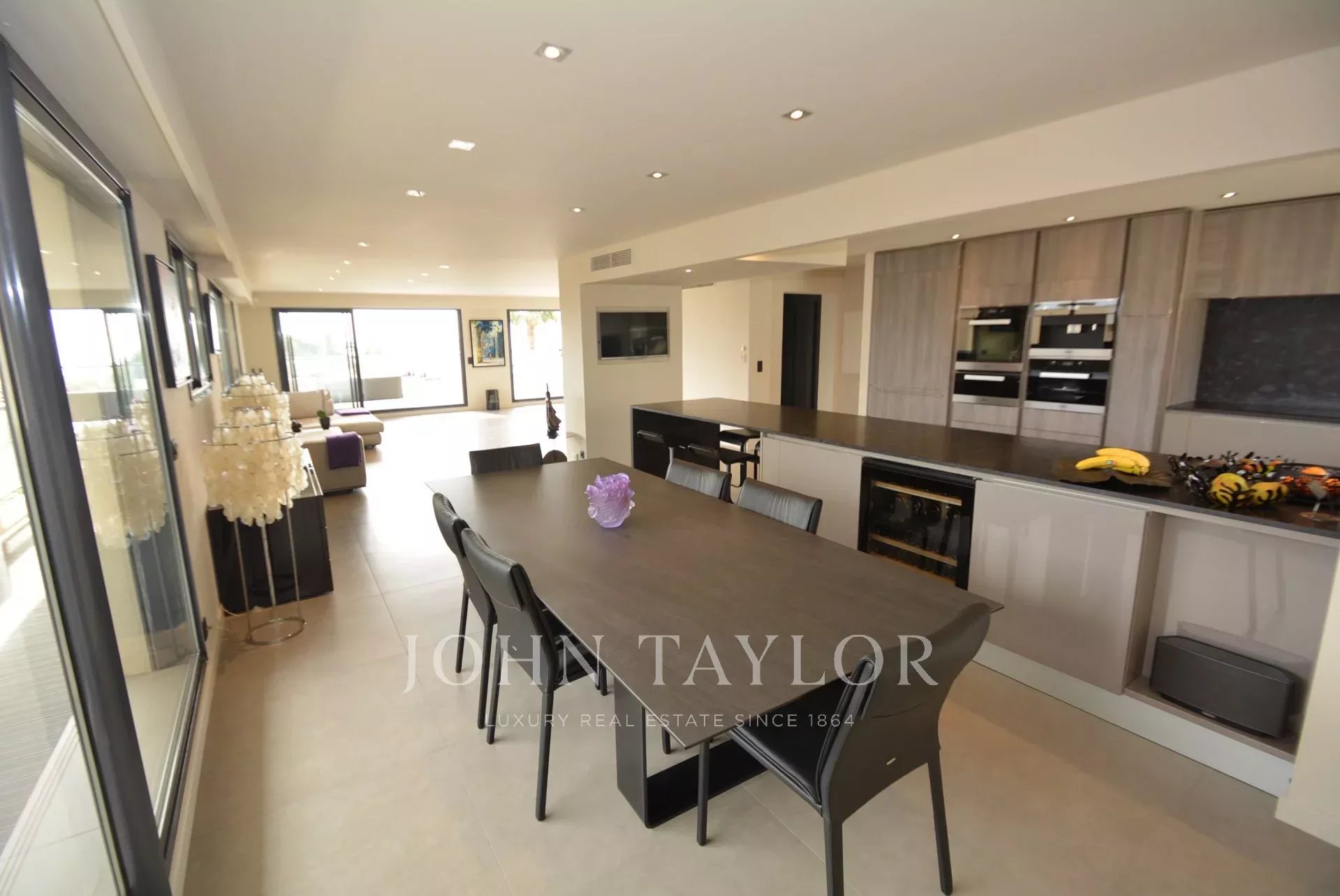 Quartier « CROIX DES GARDES », à dix minutes du centre-ville de Cannes et du Palais des Festivals, jouissant d'une magnifique vue sur la baie de Cannes, les Iles de Lérins et l'Estérel, appartement entièrement climatisé au dernier étage d’une résidence de 3 appartements avec jardin et piscine pouvant être chauffée.