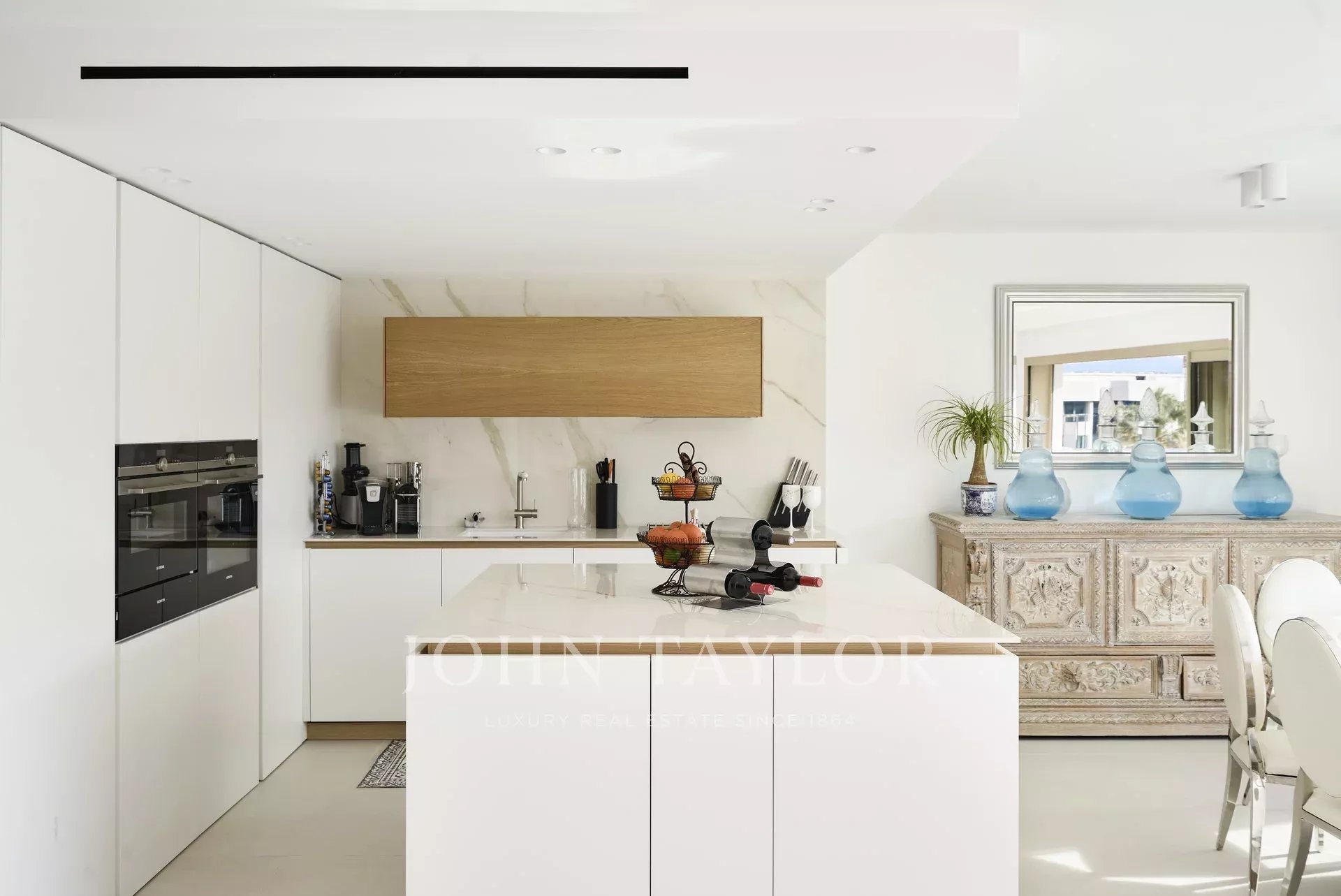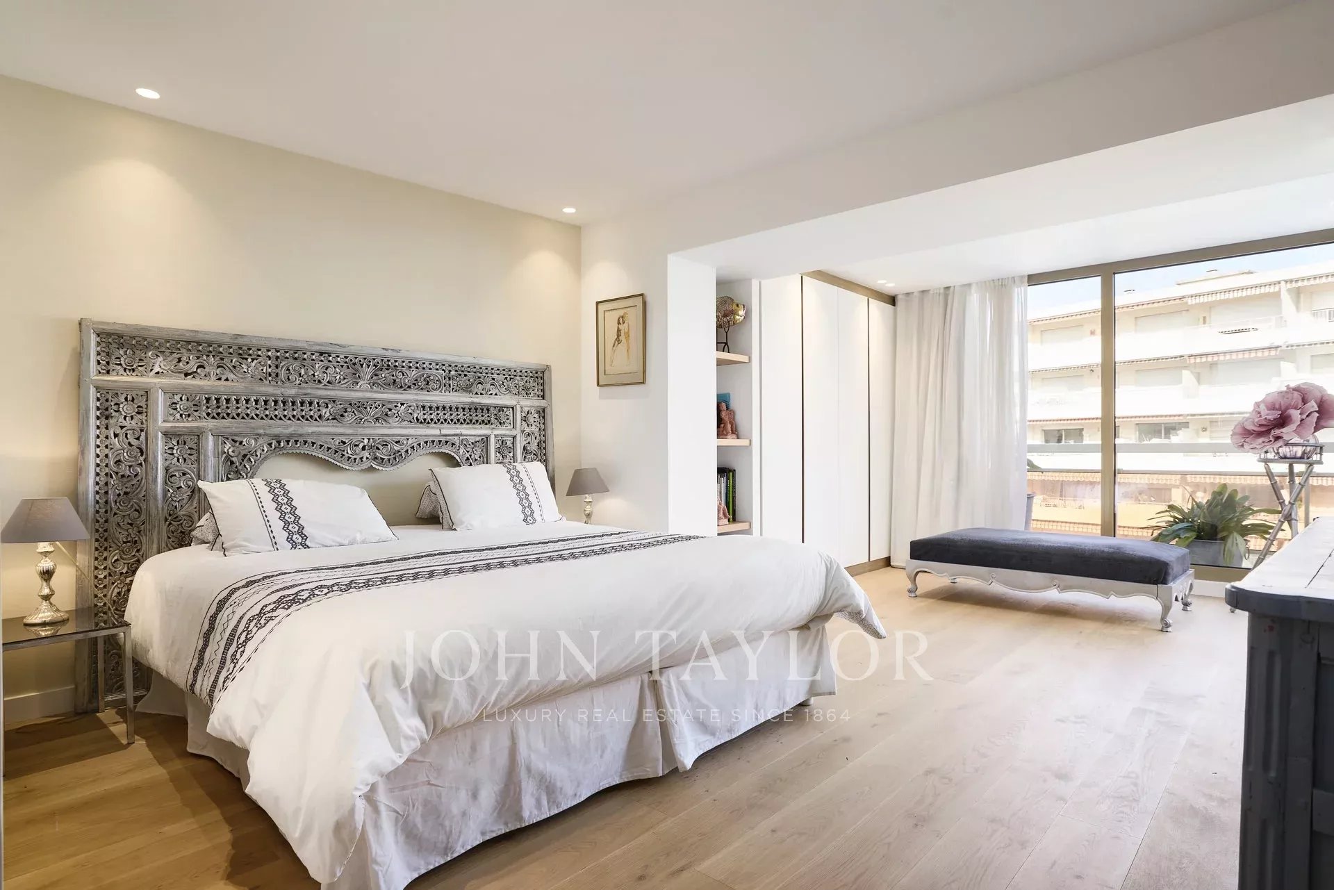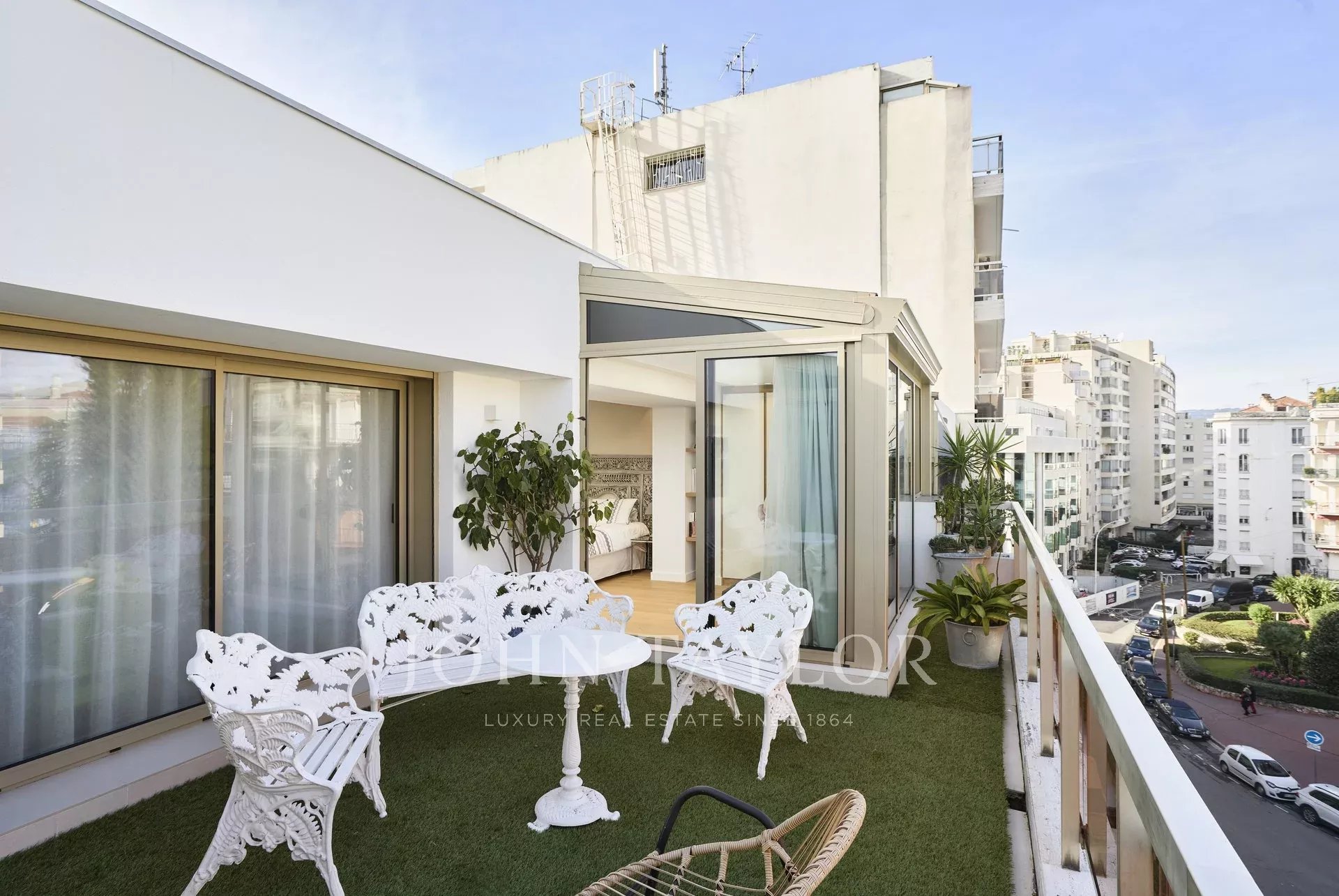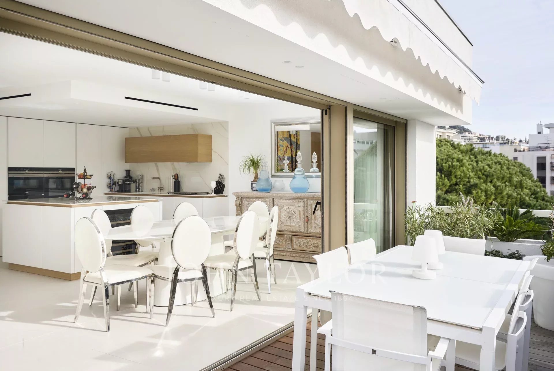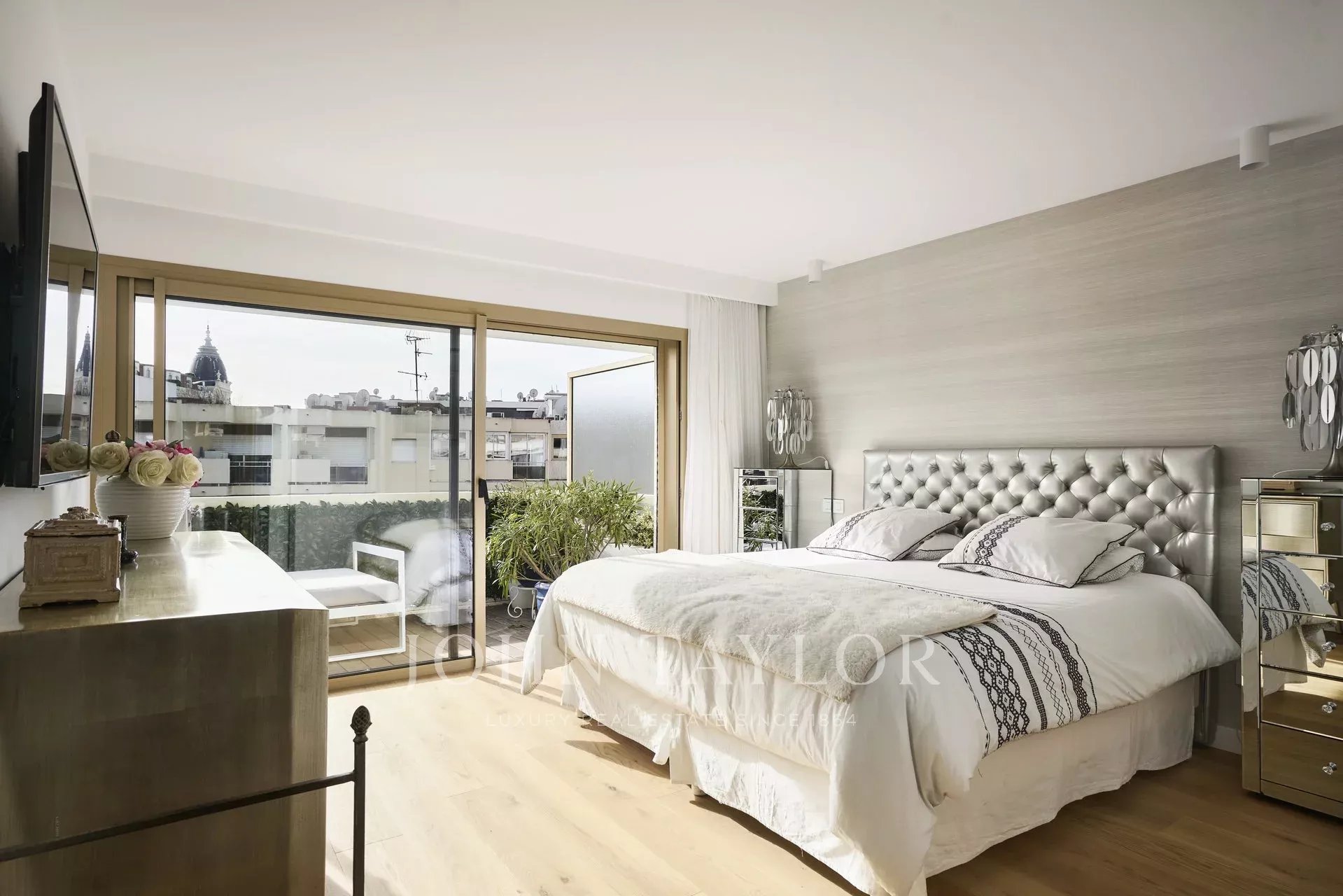 Exposé plein sud, appartement contemporain entièrement climatisé de 165 m2 habitables au dernier étage (5ème)d’une résidence centre ville, à quelques minutes à pied des plages et du Palais des Festivals.