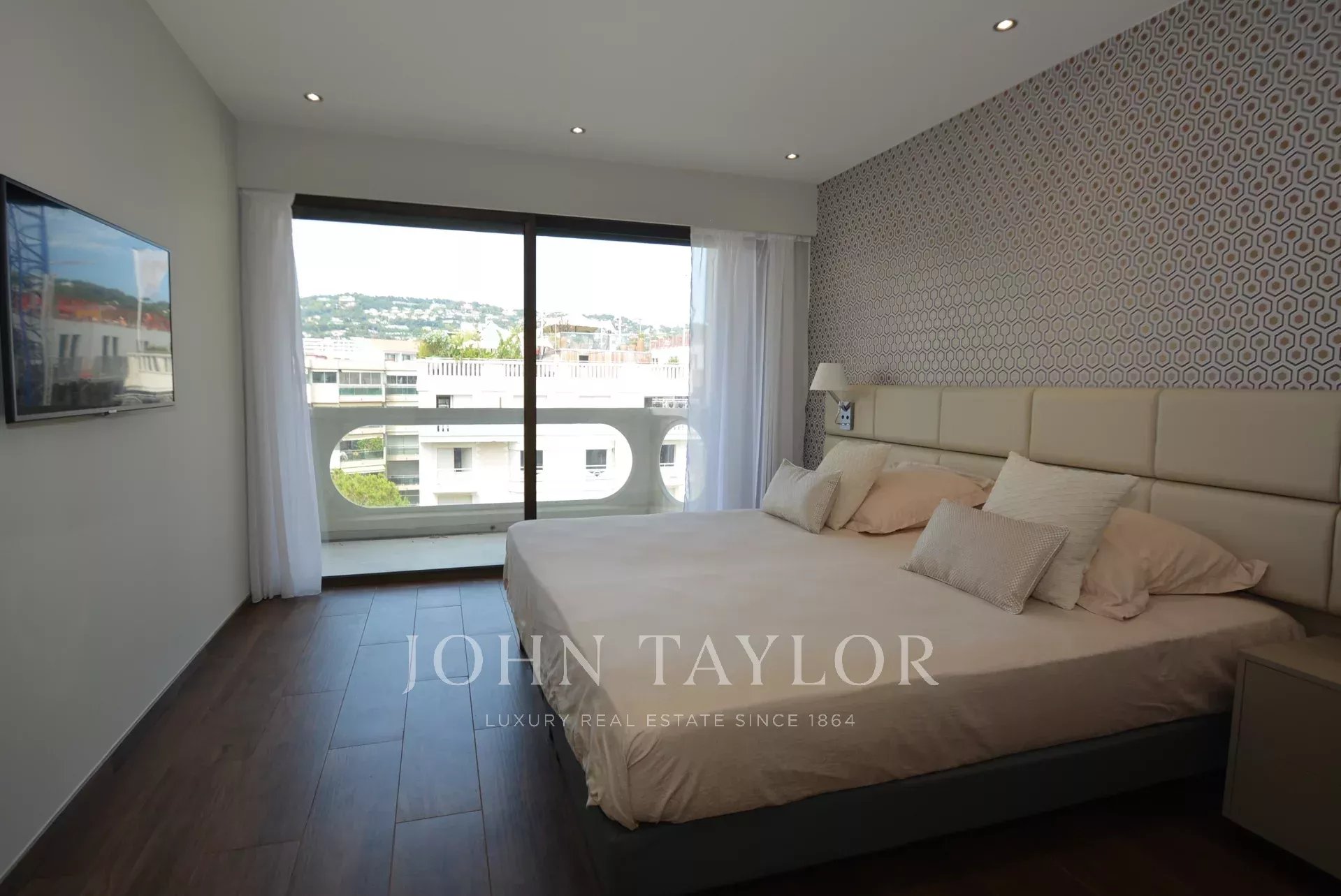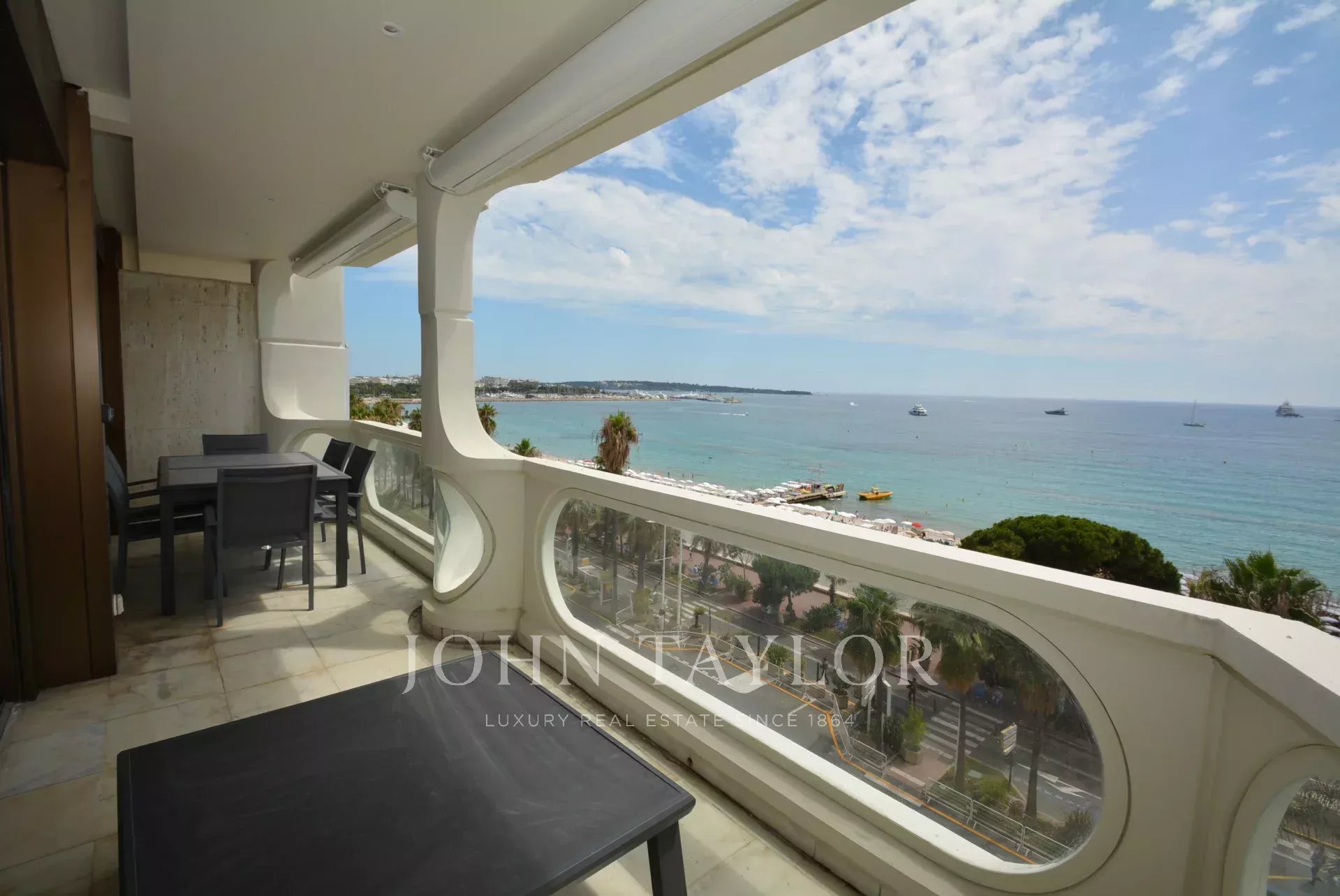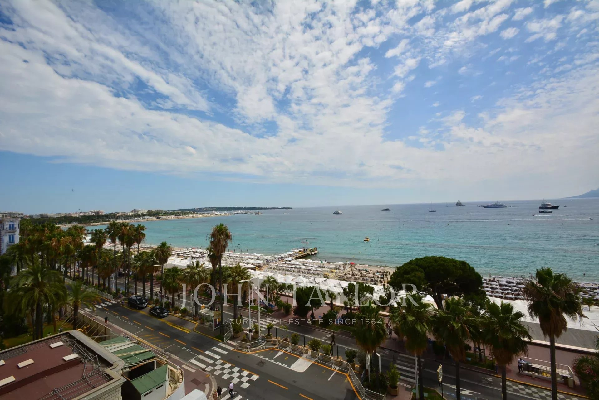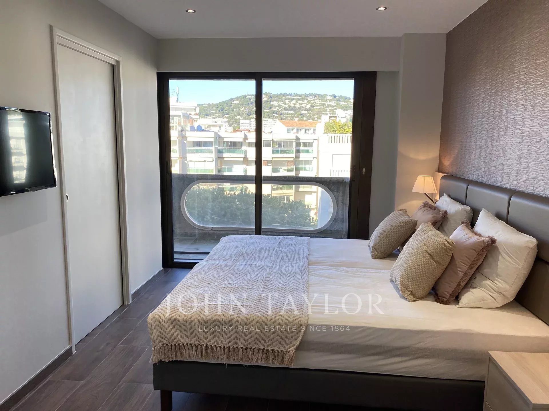 Exposé Sud et au 6ème étage d'une résidence recherchée de la Croisette avec gardien, appartement traversant, entièrement rénové et climatisé jouissant d'une vue sur la Croisette et la Baie de Cannes.
