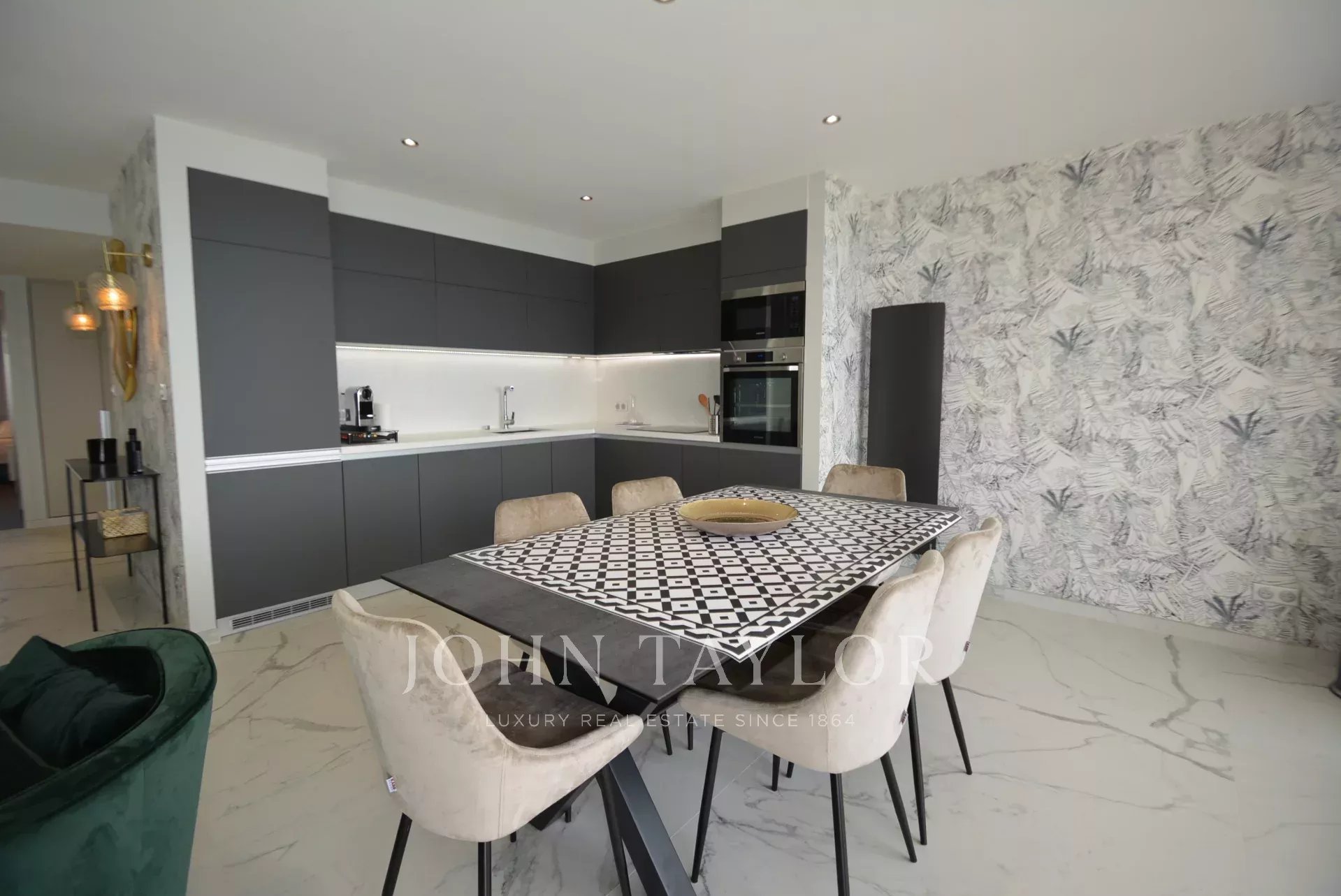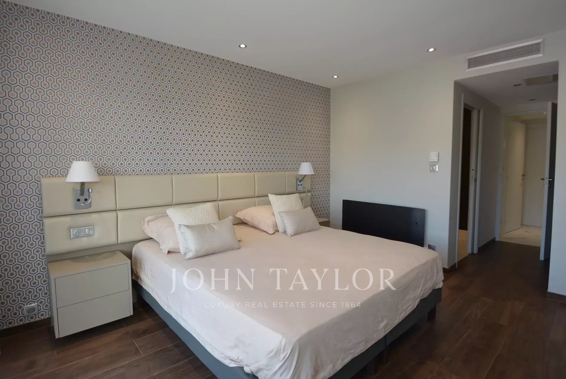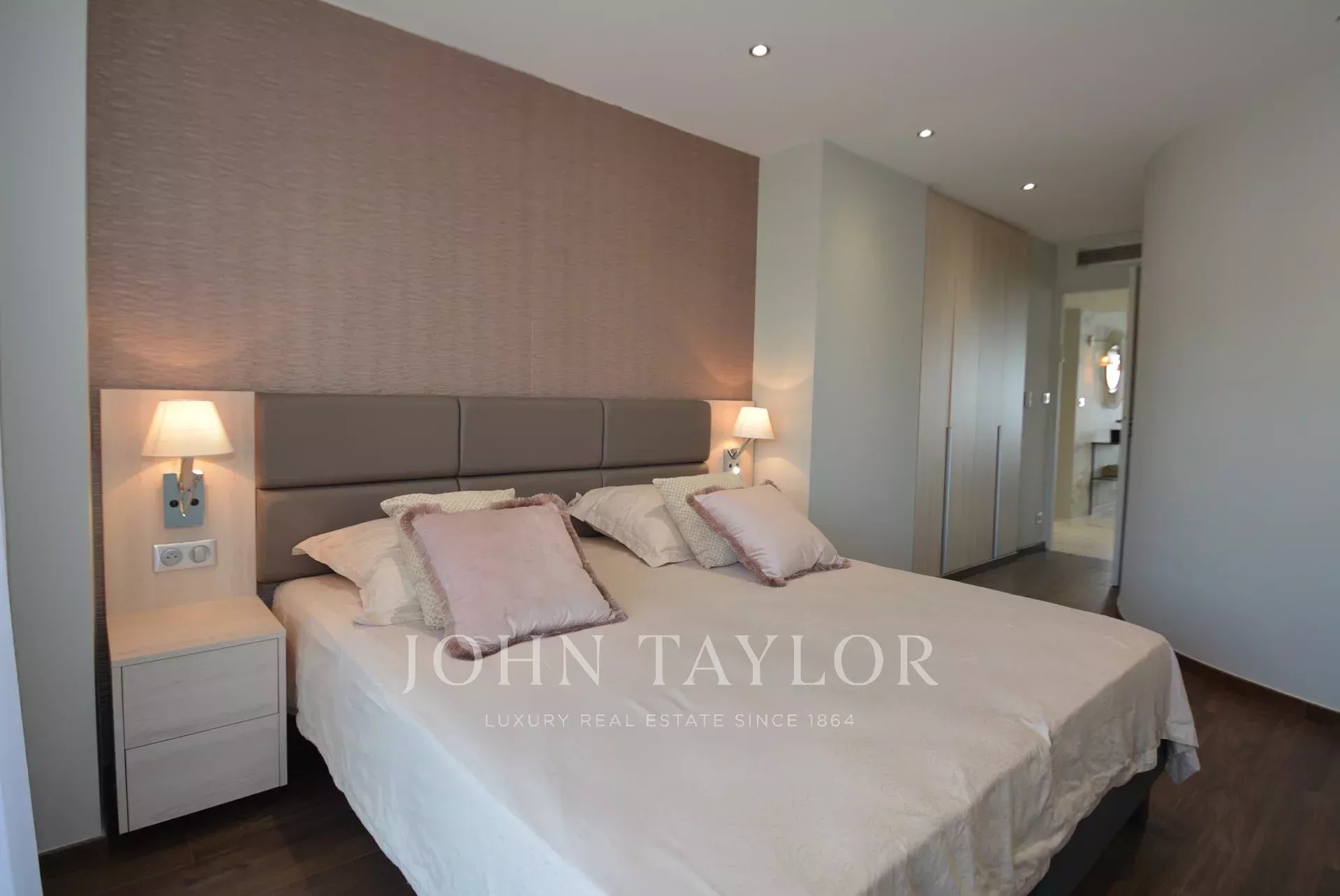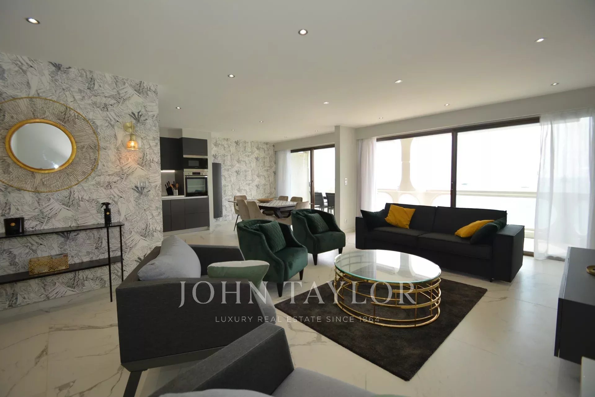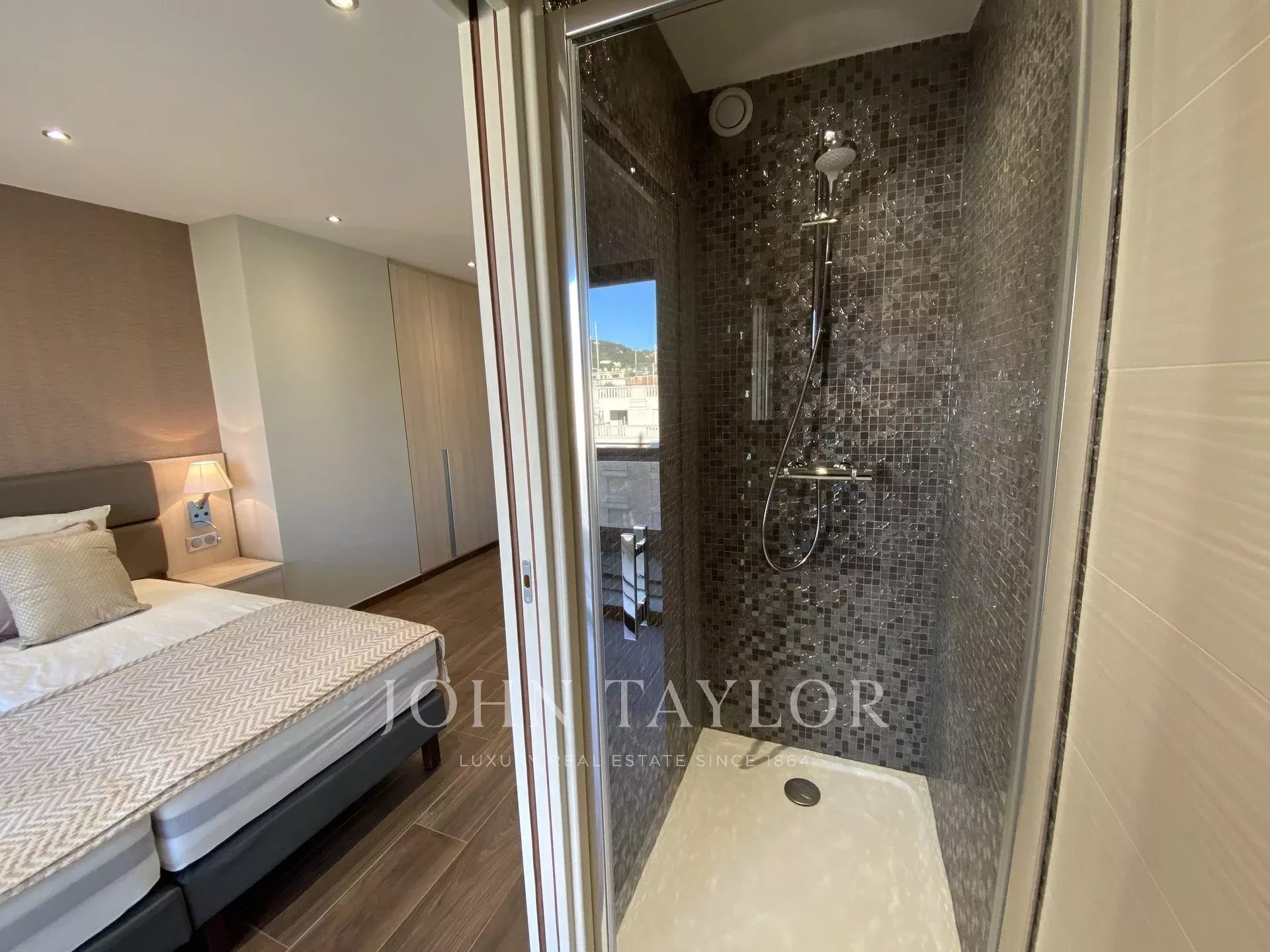 Exposé Sud et au 6ème étage d'une résidence recherchée de la Croisette avec gardien, appartement traversant, entièrement rénové et climatisé jouissant d'une vue sur la Croisette et la Baie de Cannes.