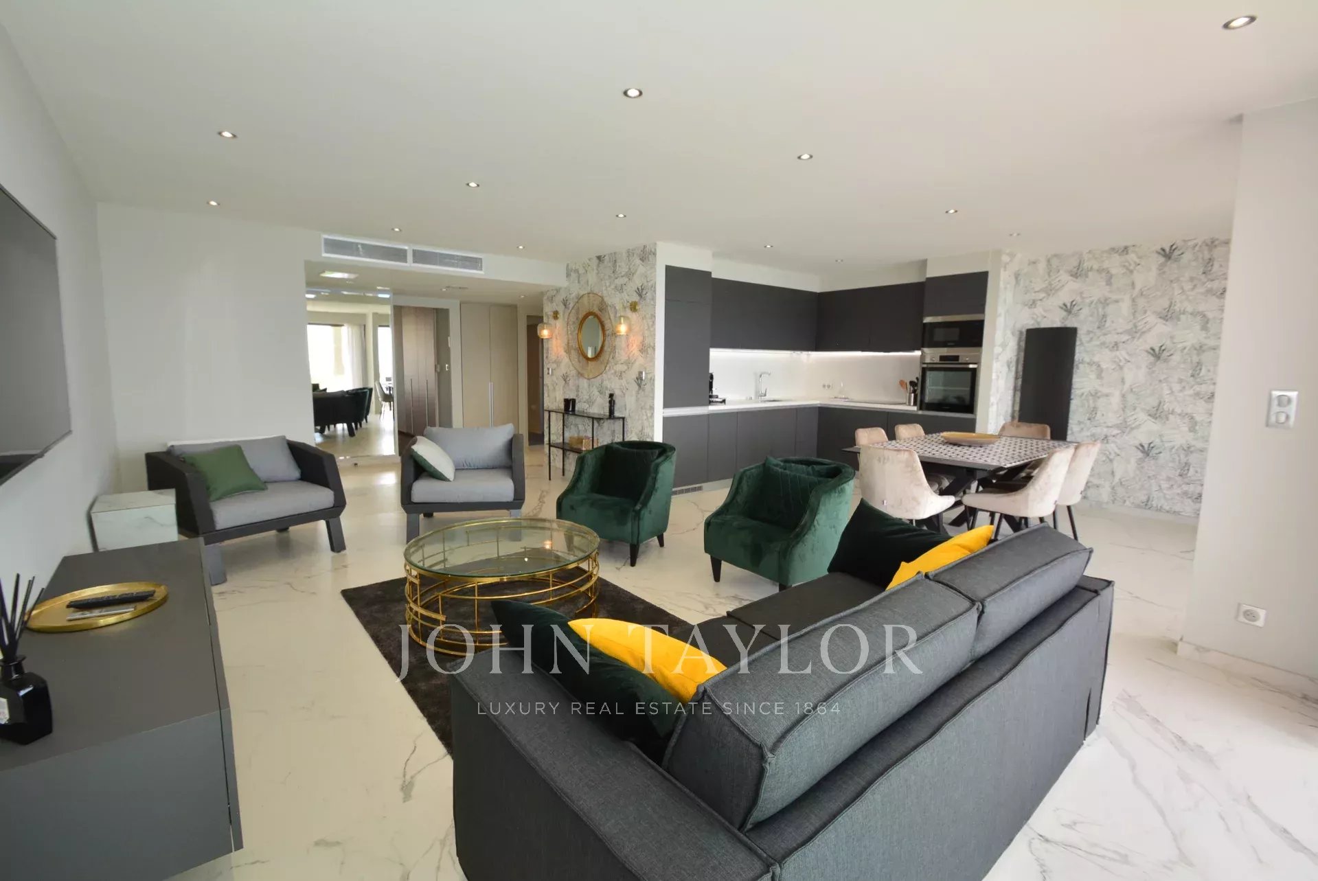 Hall d’entrée donnant sur la pièce de réception s'ouvrant sur la terrasse principale et comprenant salon (TV), coin repas et cuisine ouverte.