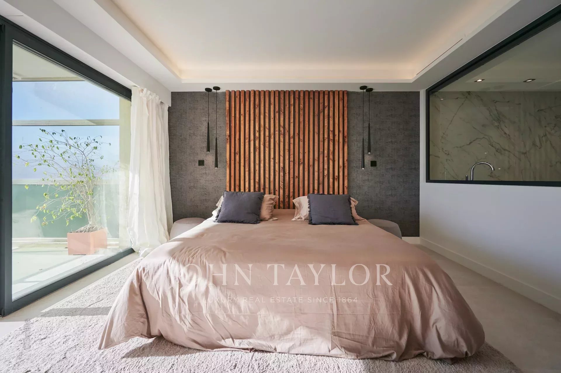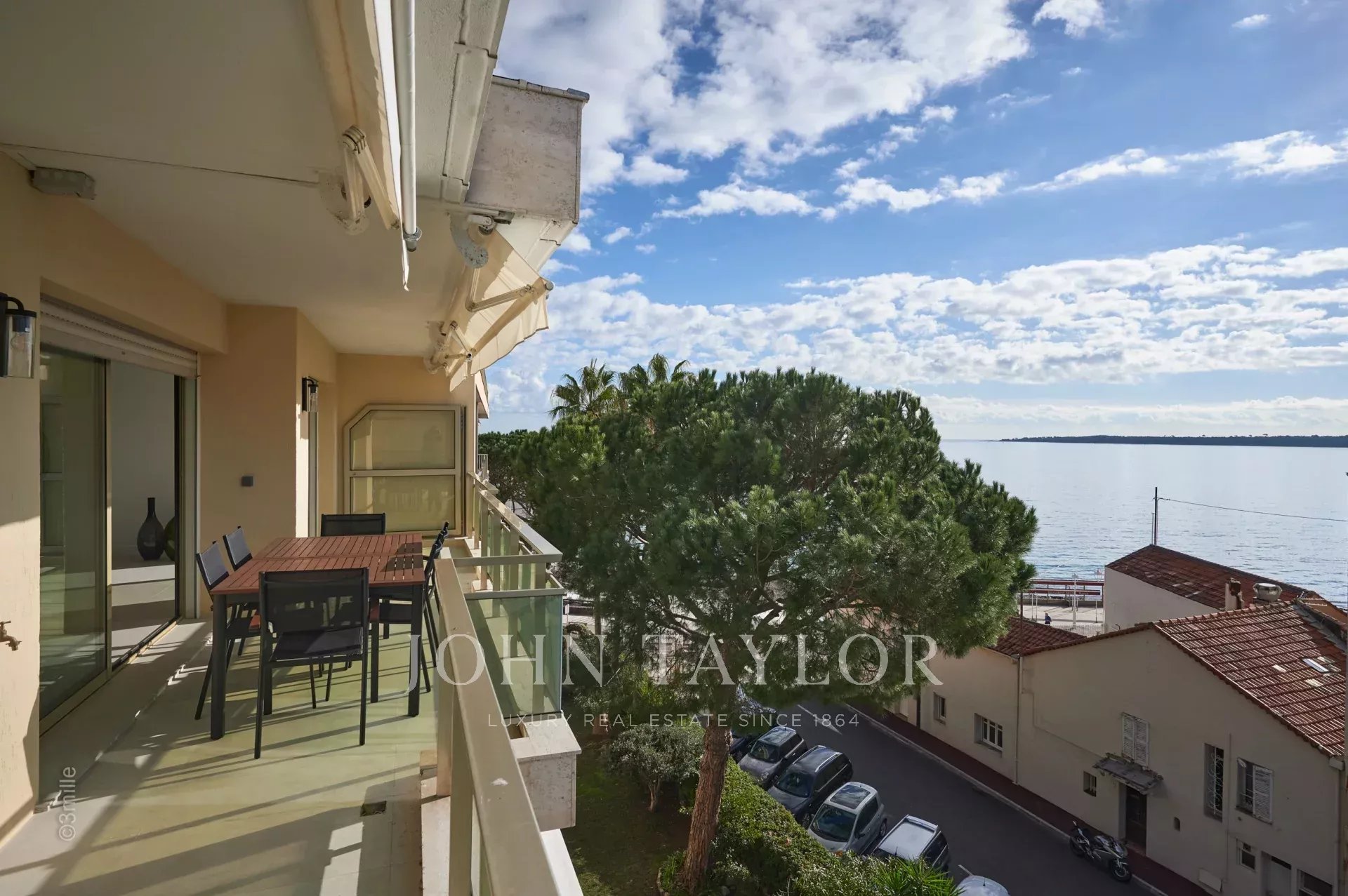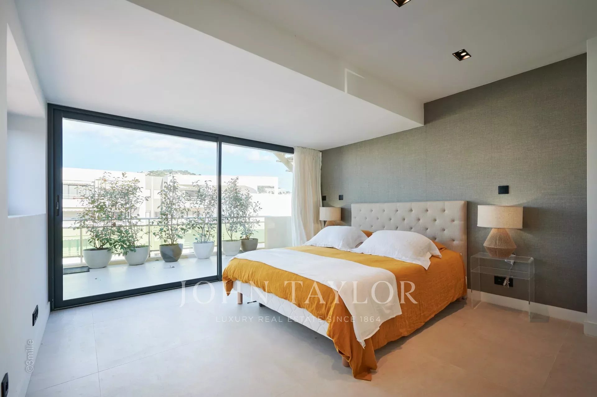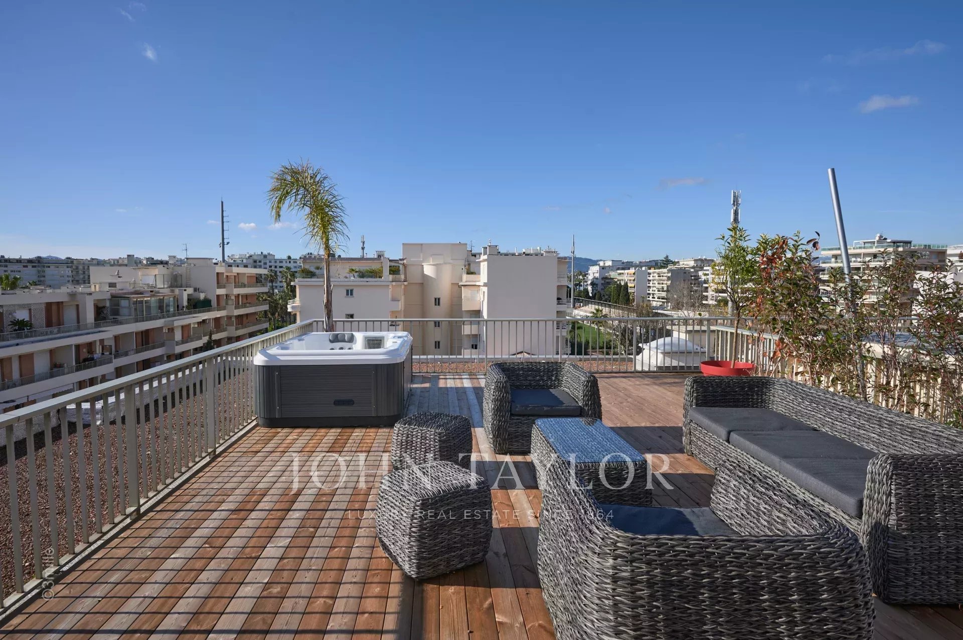 Dans le quartier du Palm Beach proche du port du « Mouré Rouge » et de ses plages, au 4ème et dernier étage, bel appartement d'une superficie habitable de 140 m² environ, agrémenté d’une superbe terrasse sur le toit d’environ 130 m² avec salon d’été, barbecue et jacuzzi, offrant de superbes vues sur la baie de Cannes, les îles de Lérins (accès depuis la terrasse arrière de l’appartement)