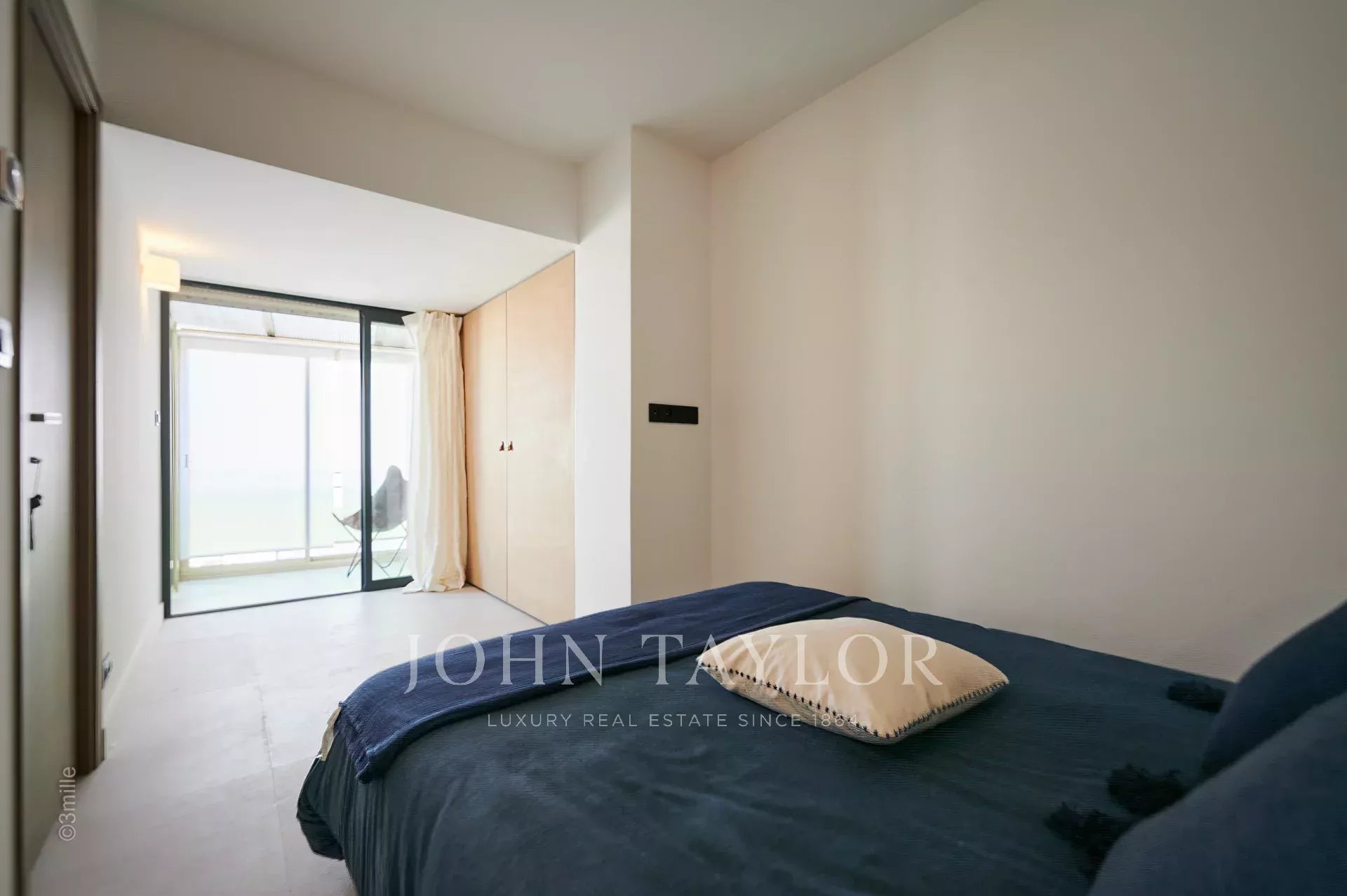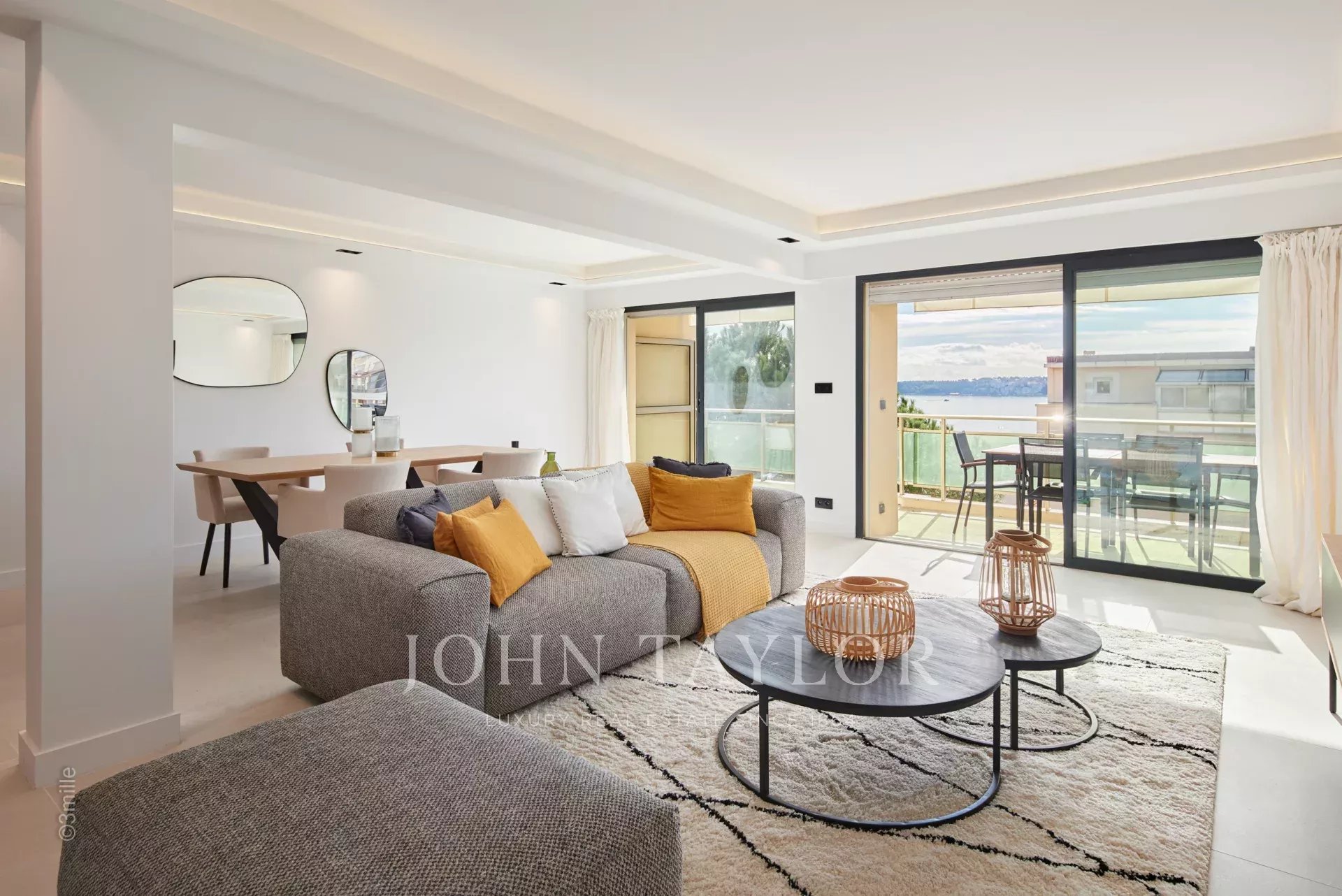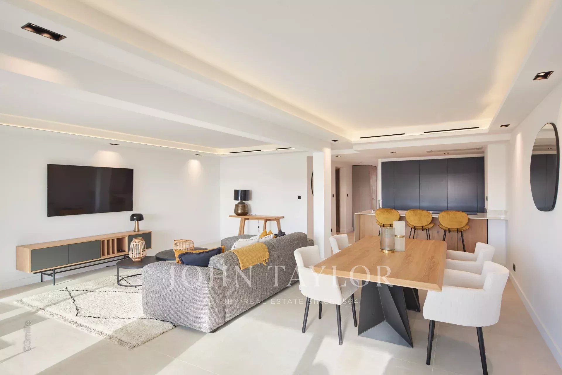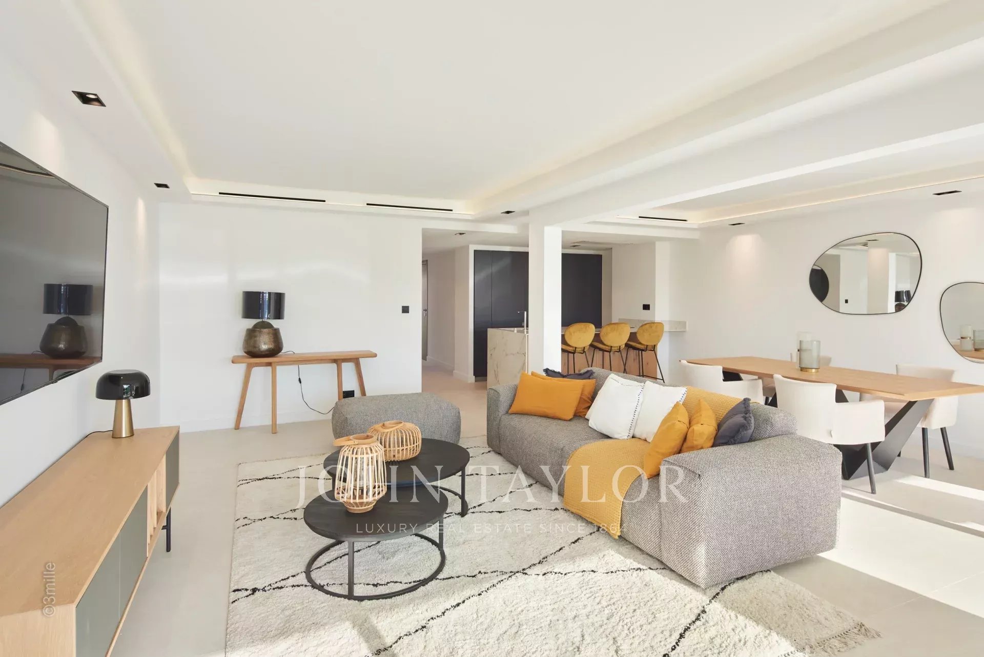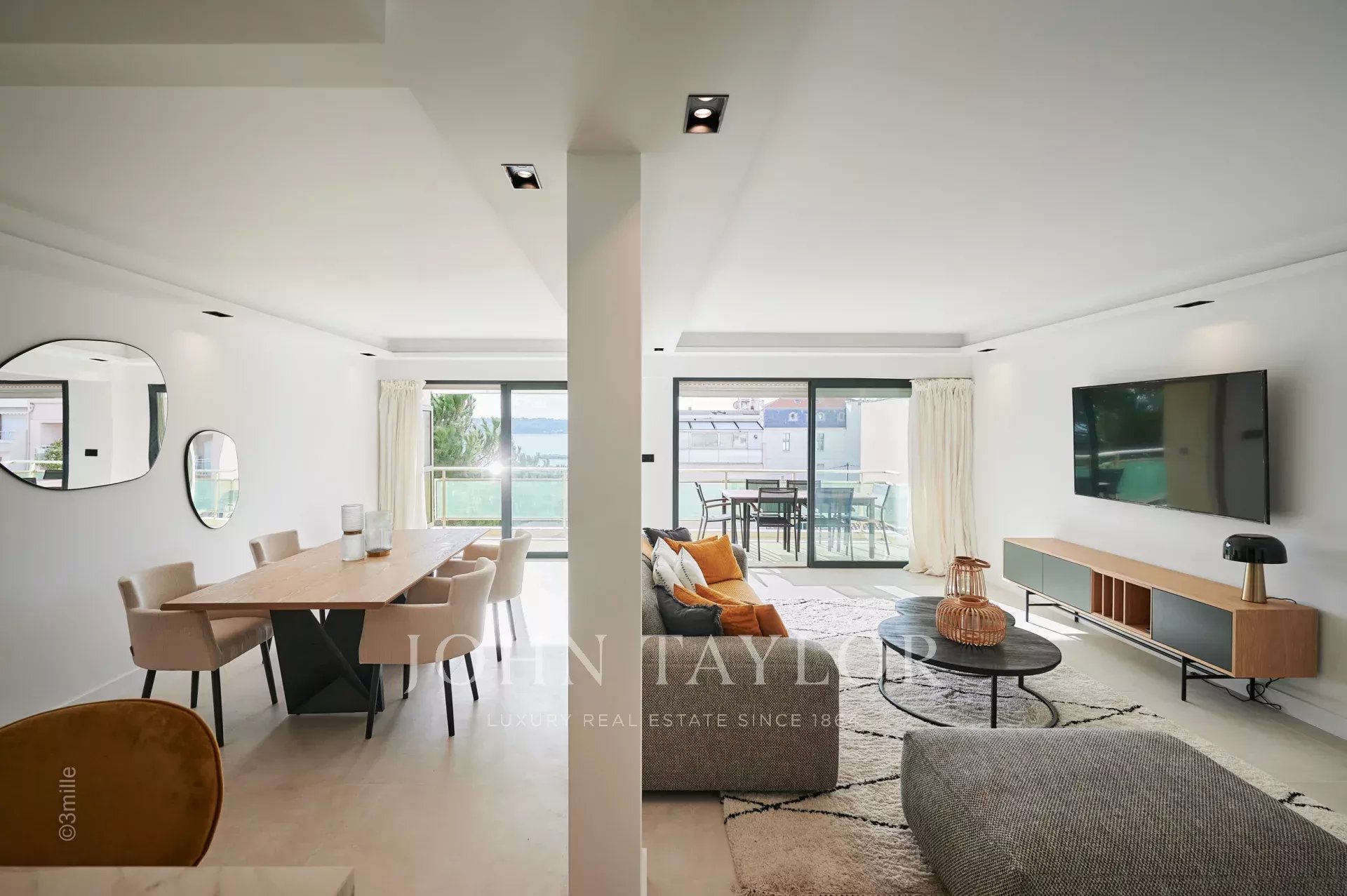 Entrée menant sur un double séjour s’ouvrant sur terrasse et offrant une cuisine ouverte entièrement équipée, un salon avec TV et un coin salle à manger. Aperçu mer.