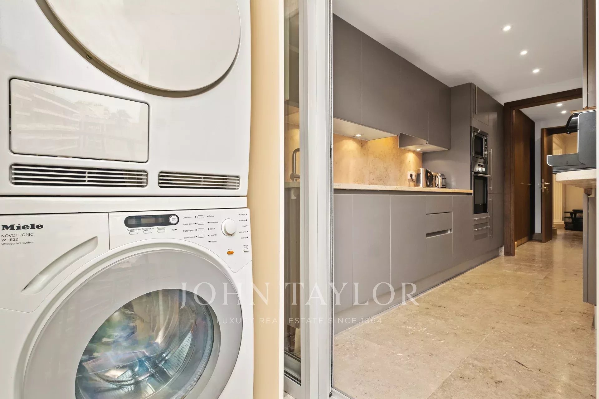 Cuisine équipée (évier avec broyeur) avec accès à une terrasse exposée Nord avec lave-linge et sèche-linge