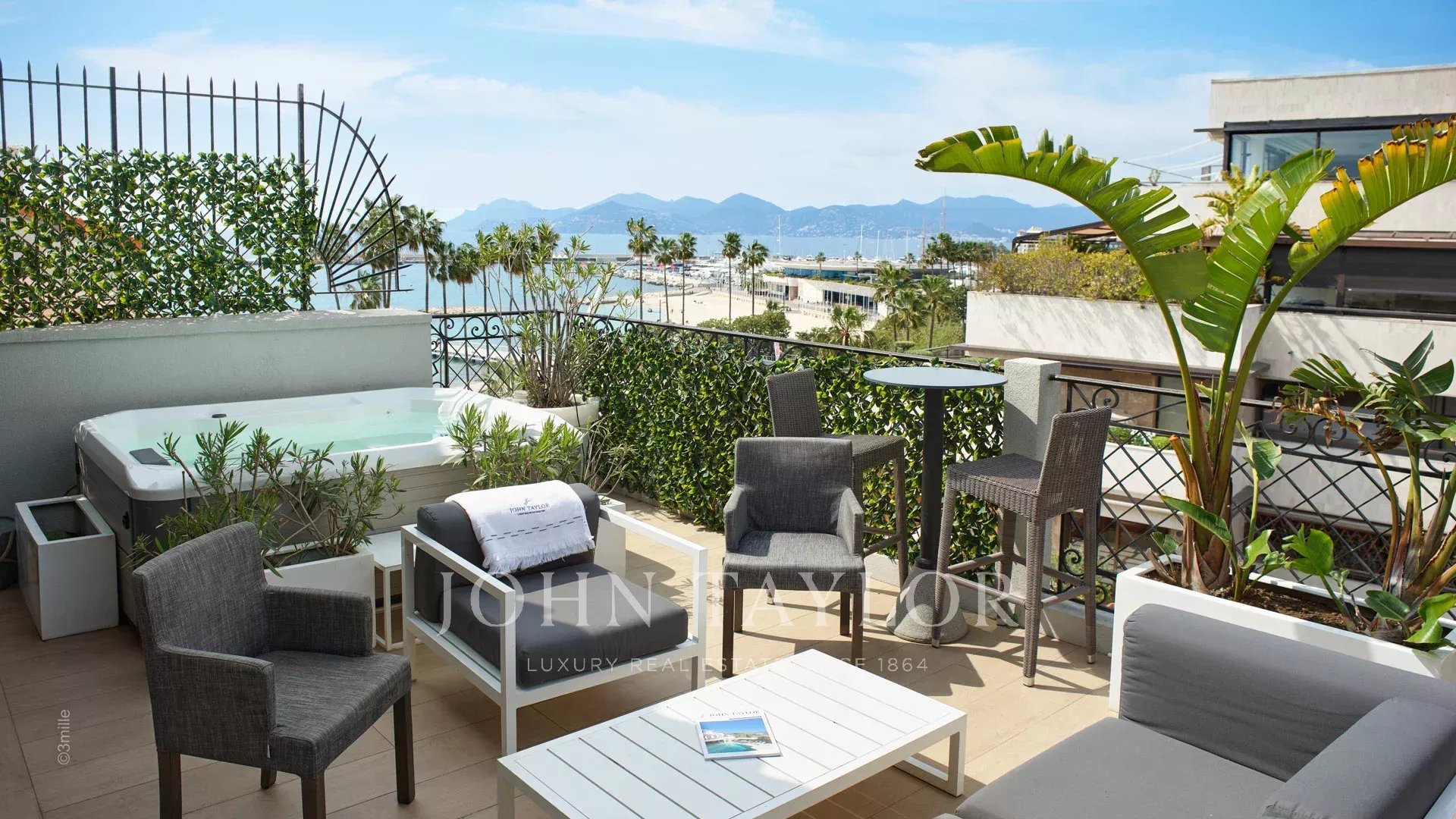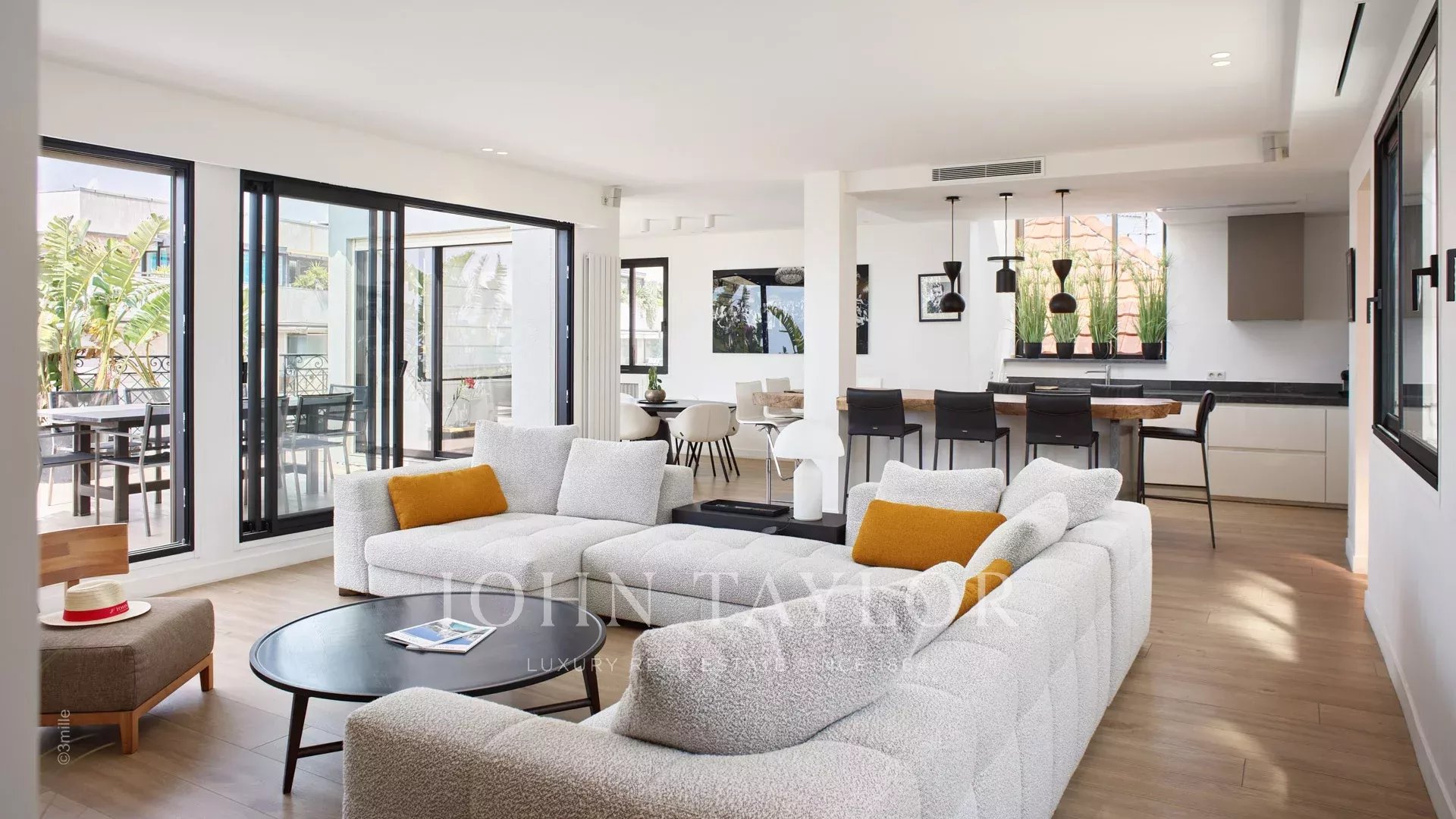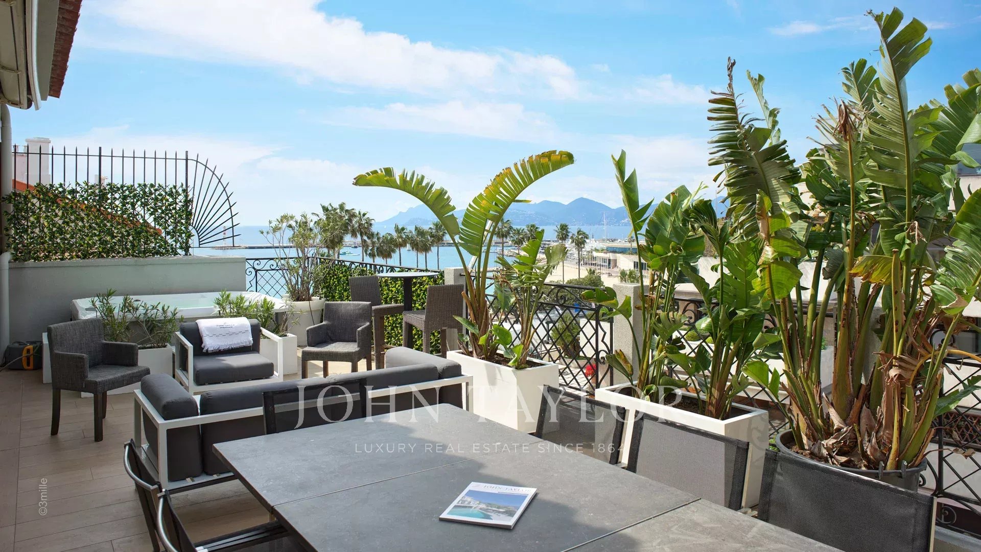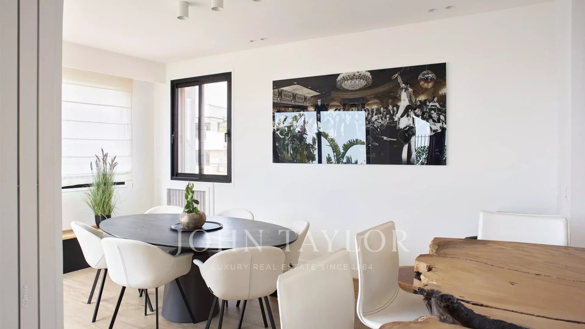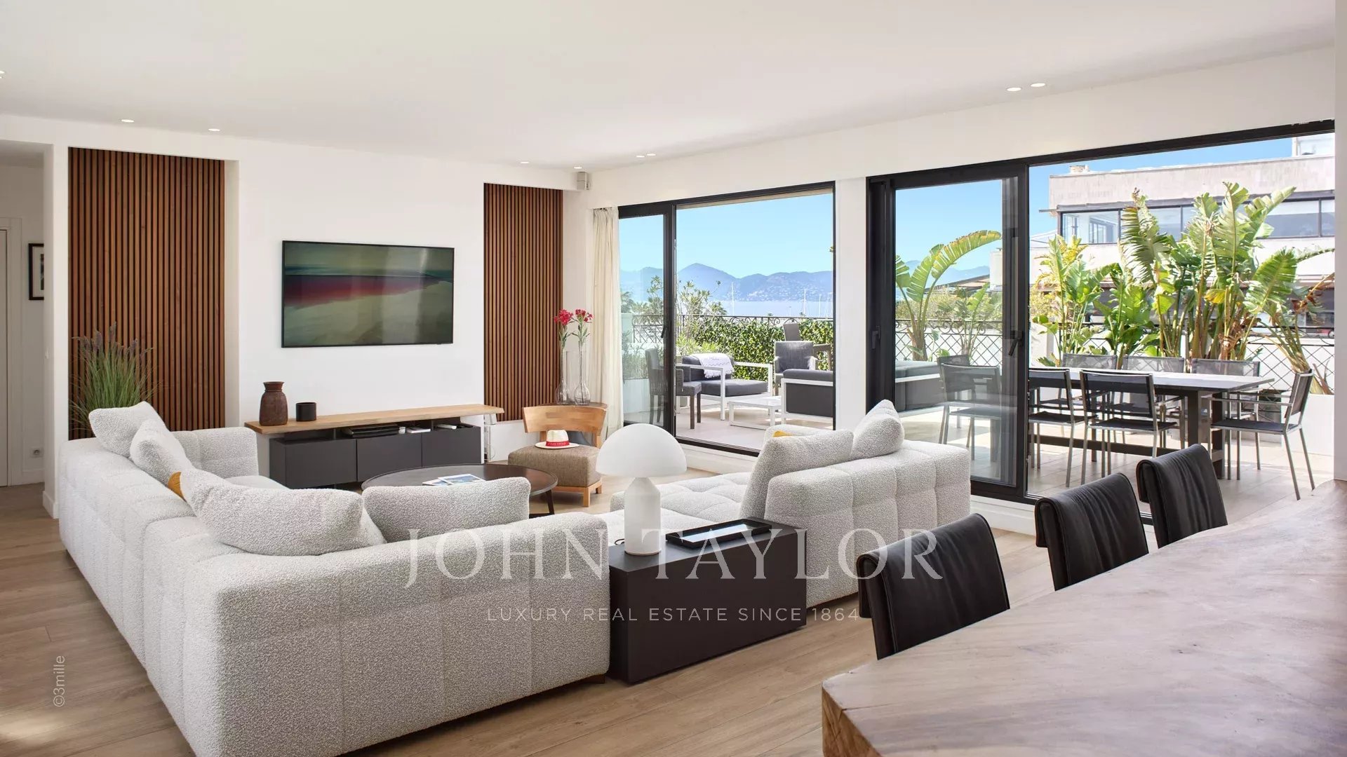 Au calme et idéalement situé proche du Palais des Festivals, superbe appartement contemporain d'environ 130 m2 habitables, entièrement climatisé et rénové avec des prestations de grande qualité, offrant deux grandes terrasses et une jolie vue mer.