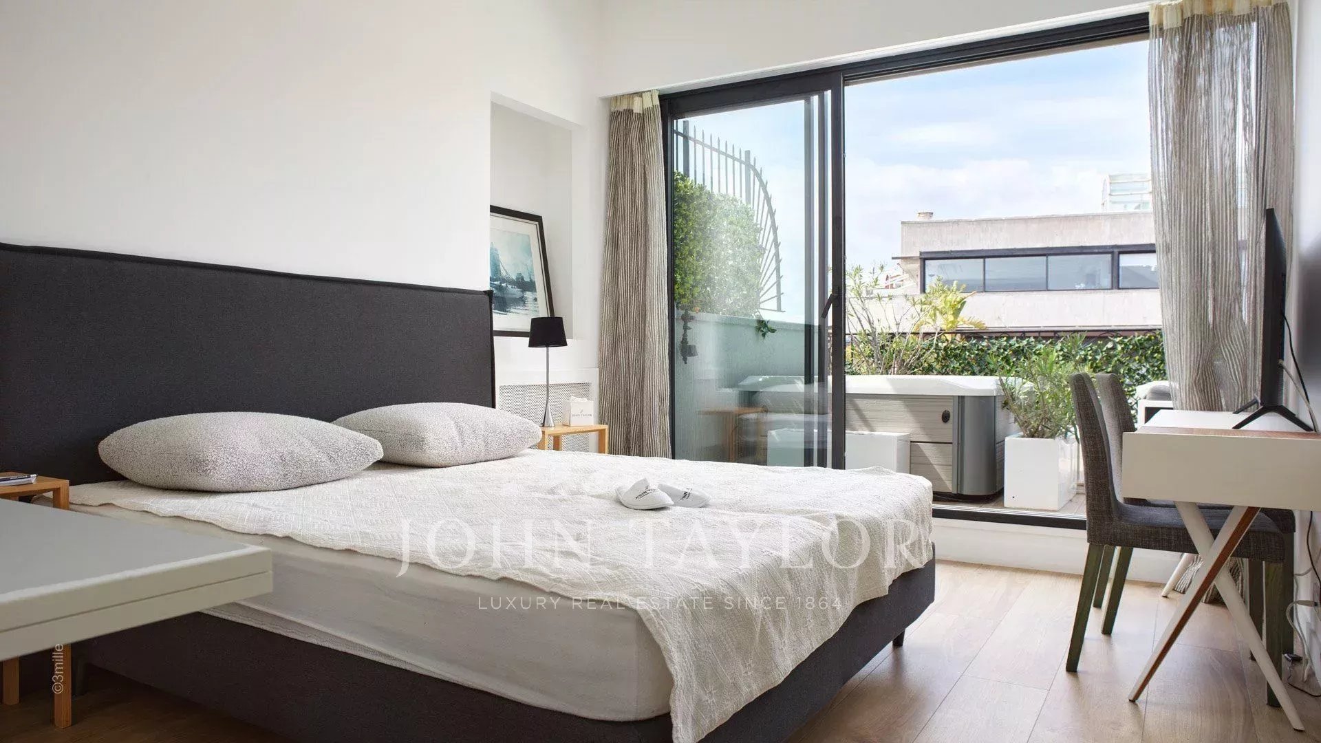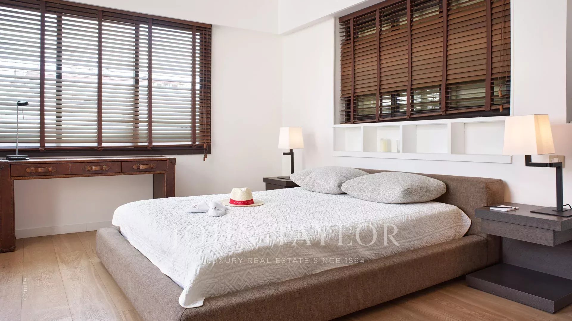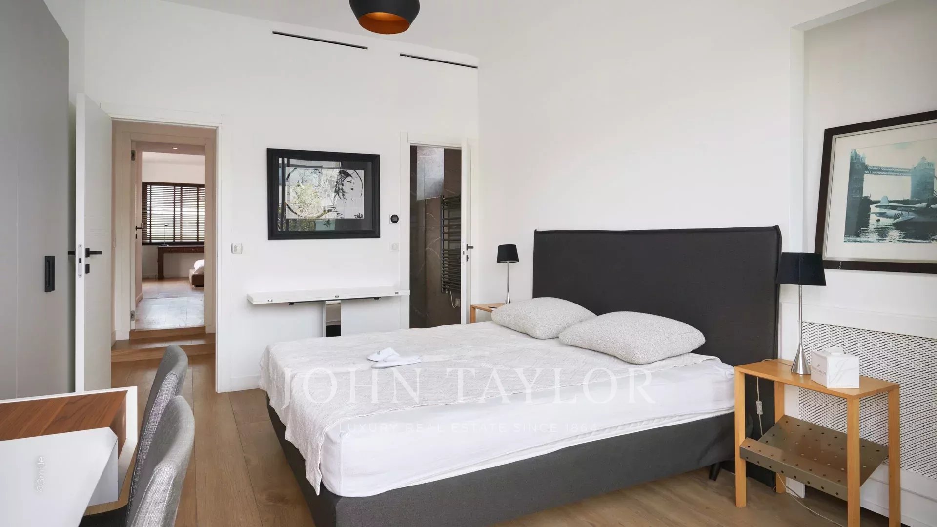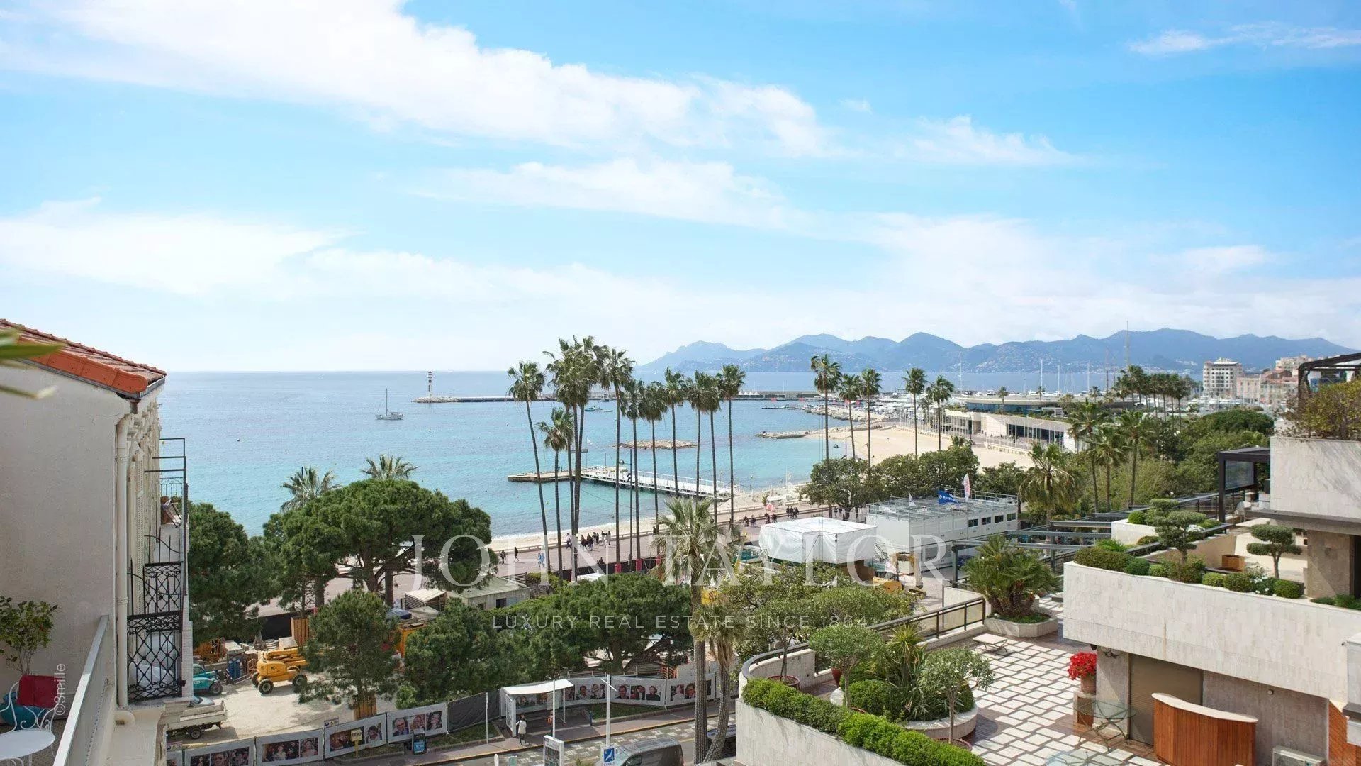 Au calme et idéalement situé proche du Palais des Festivals, superbe appartement contemporain d'environ 130 m2 habitables, entièrement climatisé et rénové avec des prestations de grande qualité, offrant deux grandes terrasses et une jolie vue mer.