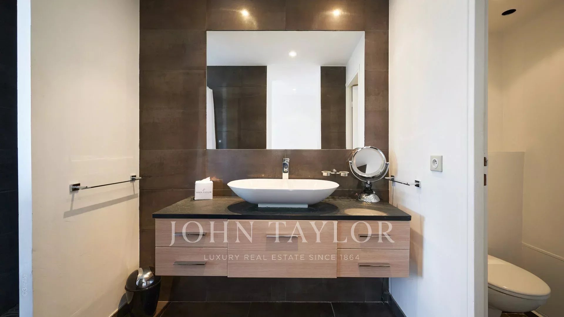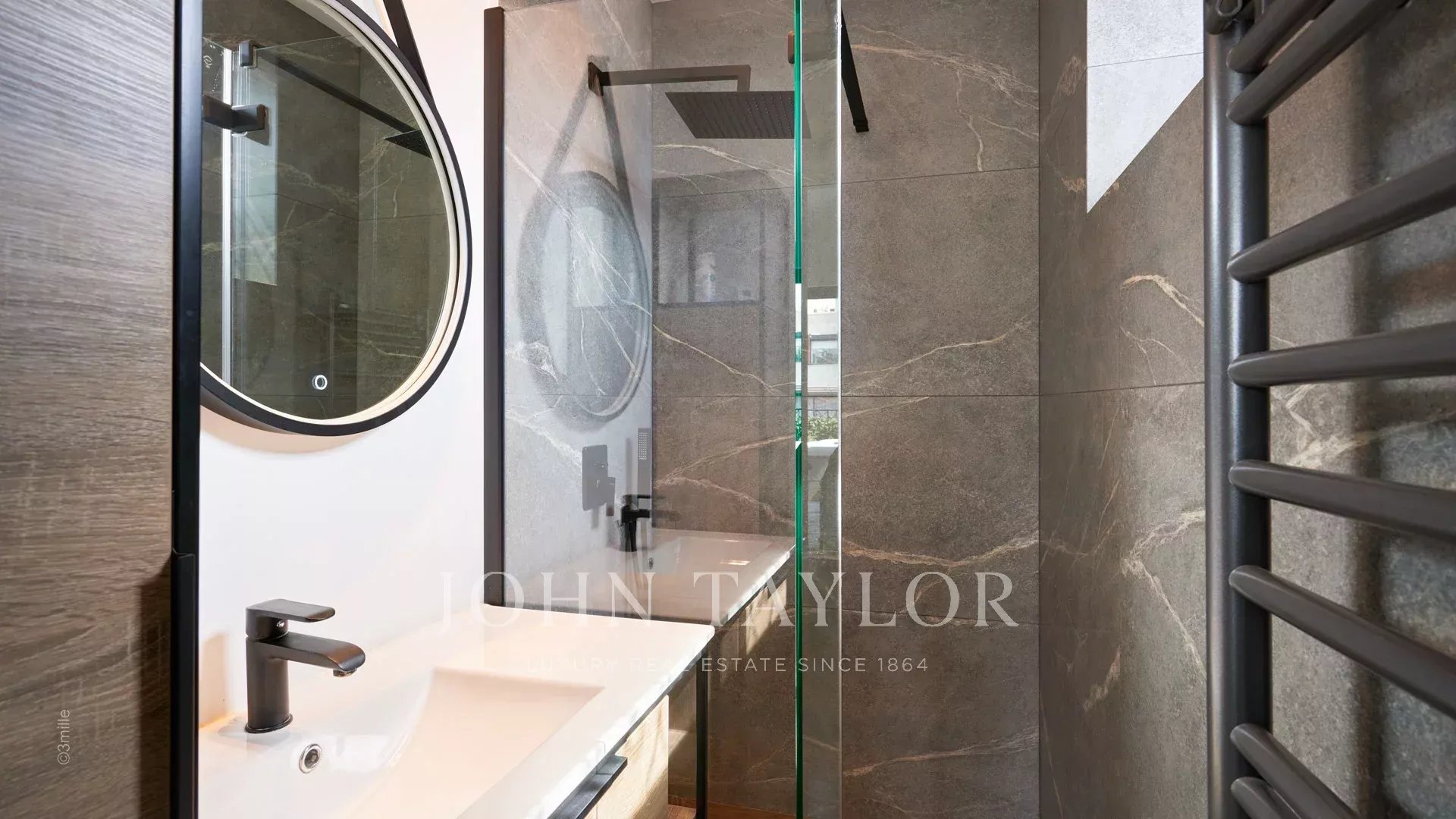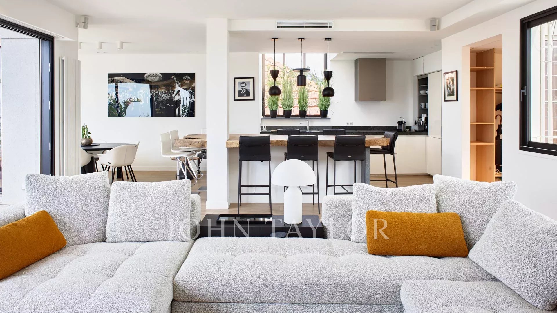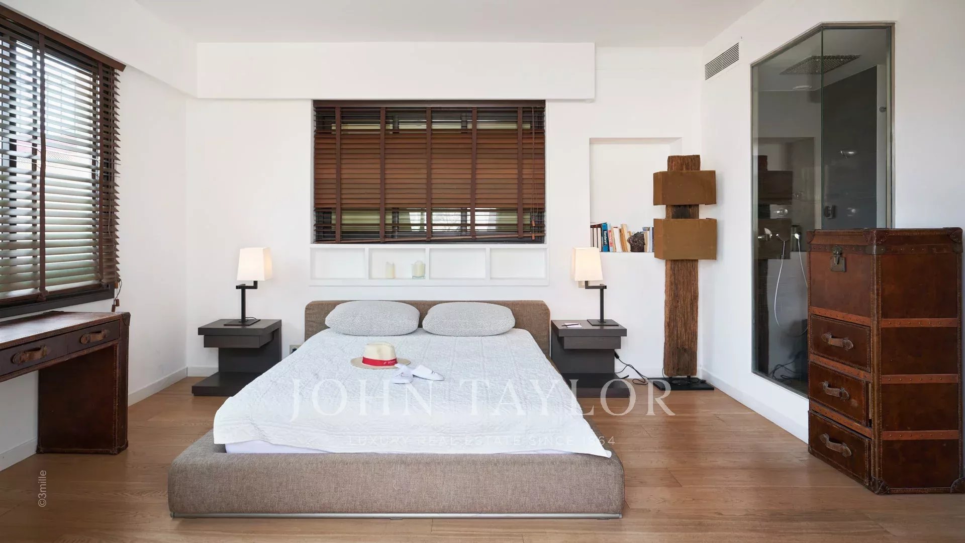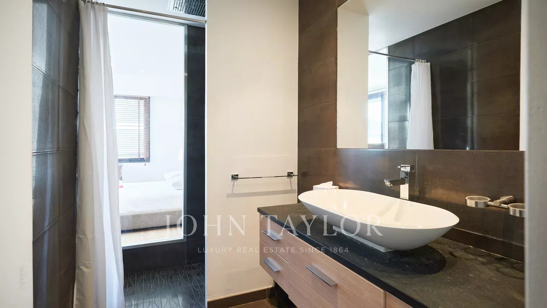 Au calme et idéalement situé proche du Palais des Festivals, superbe appartement contemporain d'environ 130 m2 habitables, entièrement climatisé et rénové avec des prestations de grande qualité, offrant deux grandes terrasses et une jolie vue mer.