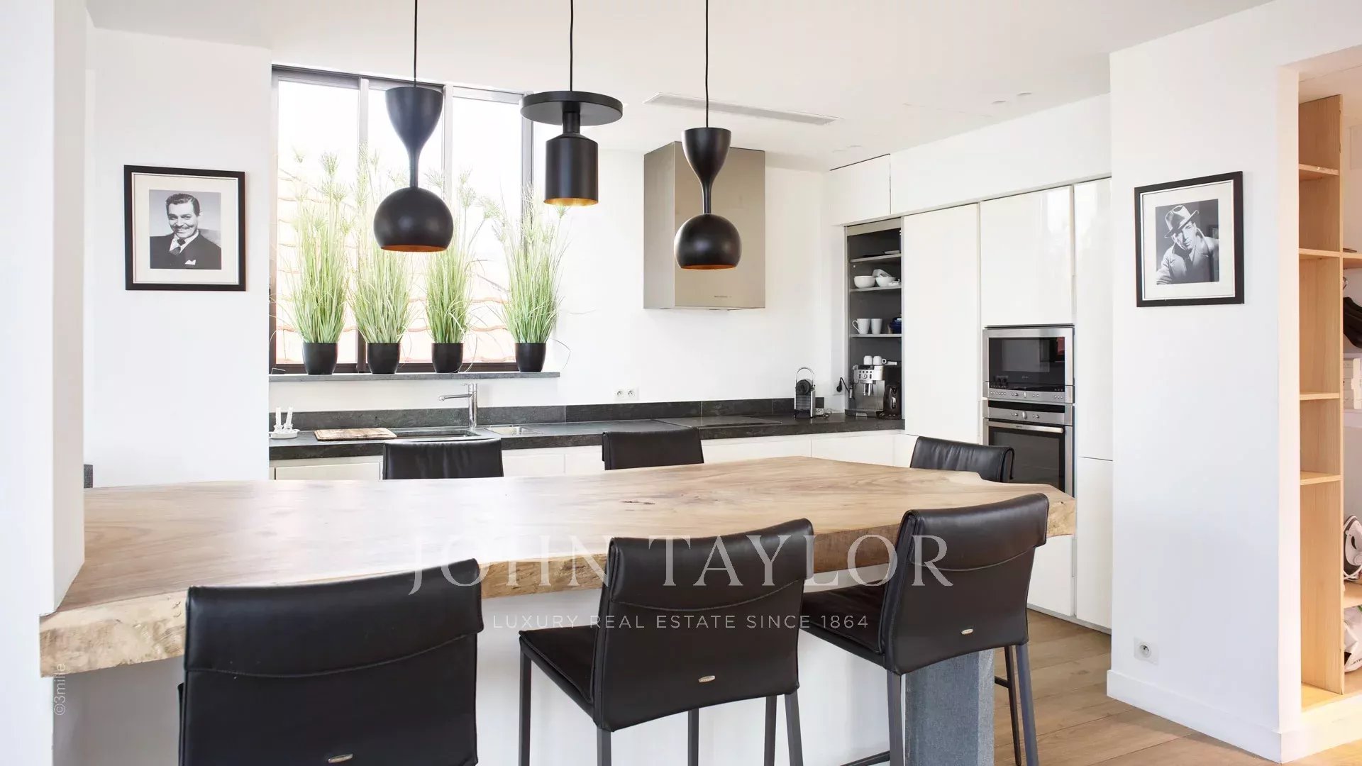Cuisine équipée ouverte s’ouvrant sur la terrasse et la pièce de réception.