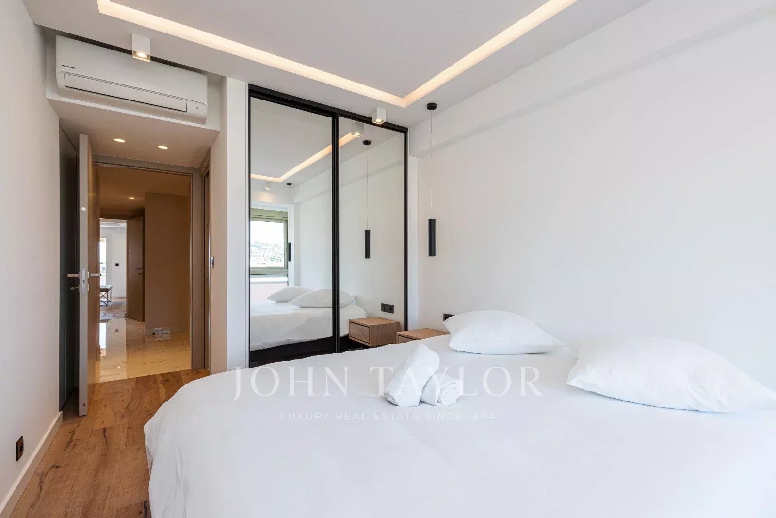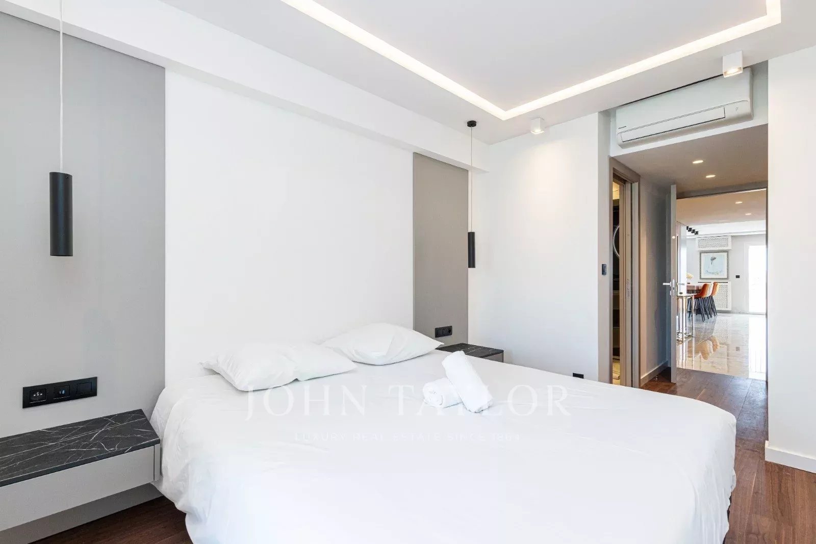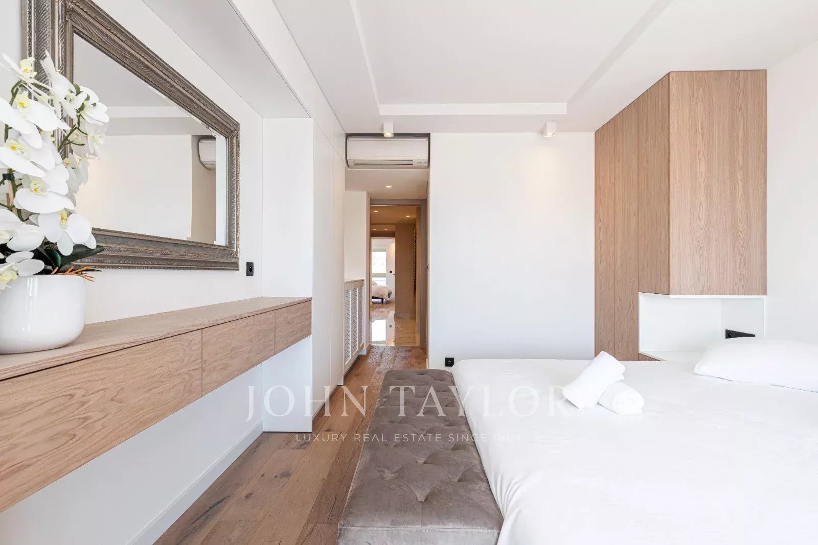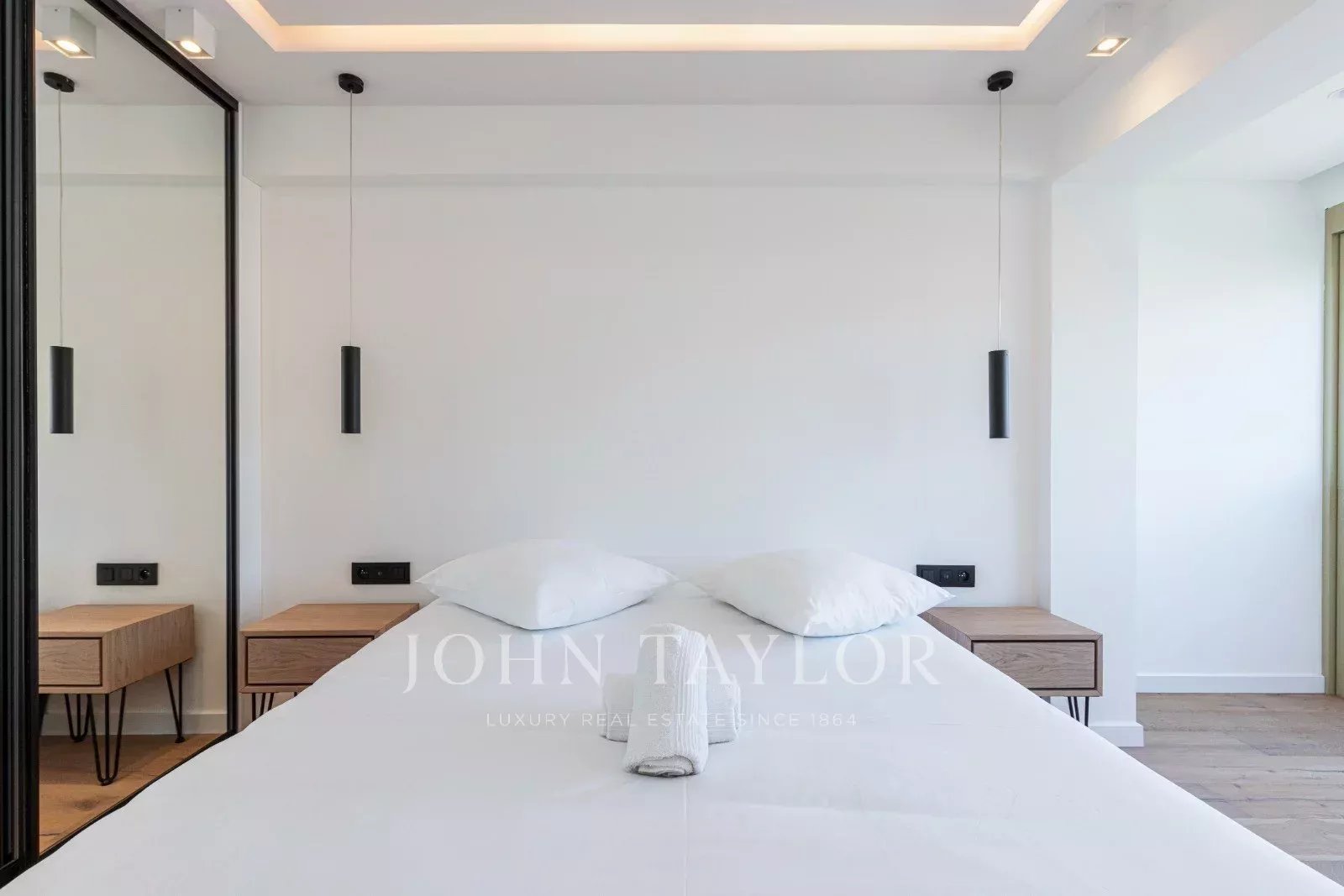 Idéalement situé au cœur du centre ville de Cannes, derrière la rue de d'Antibes et à quelques pas de la Croisette, vaste appartement de style contemporain de 4 chambres d'environ 150 m² entièrement rénové et meublé avec soins et terrasse.