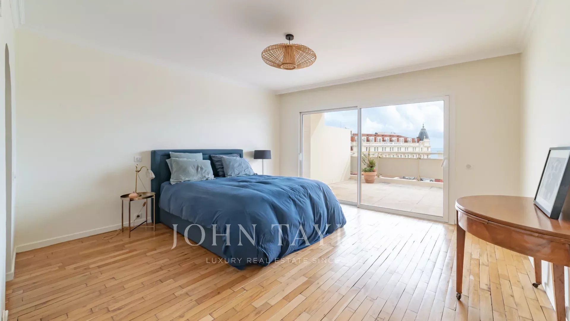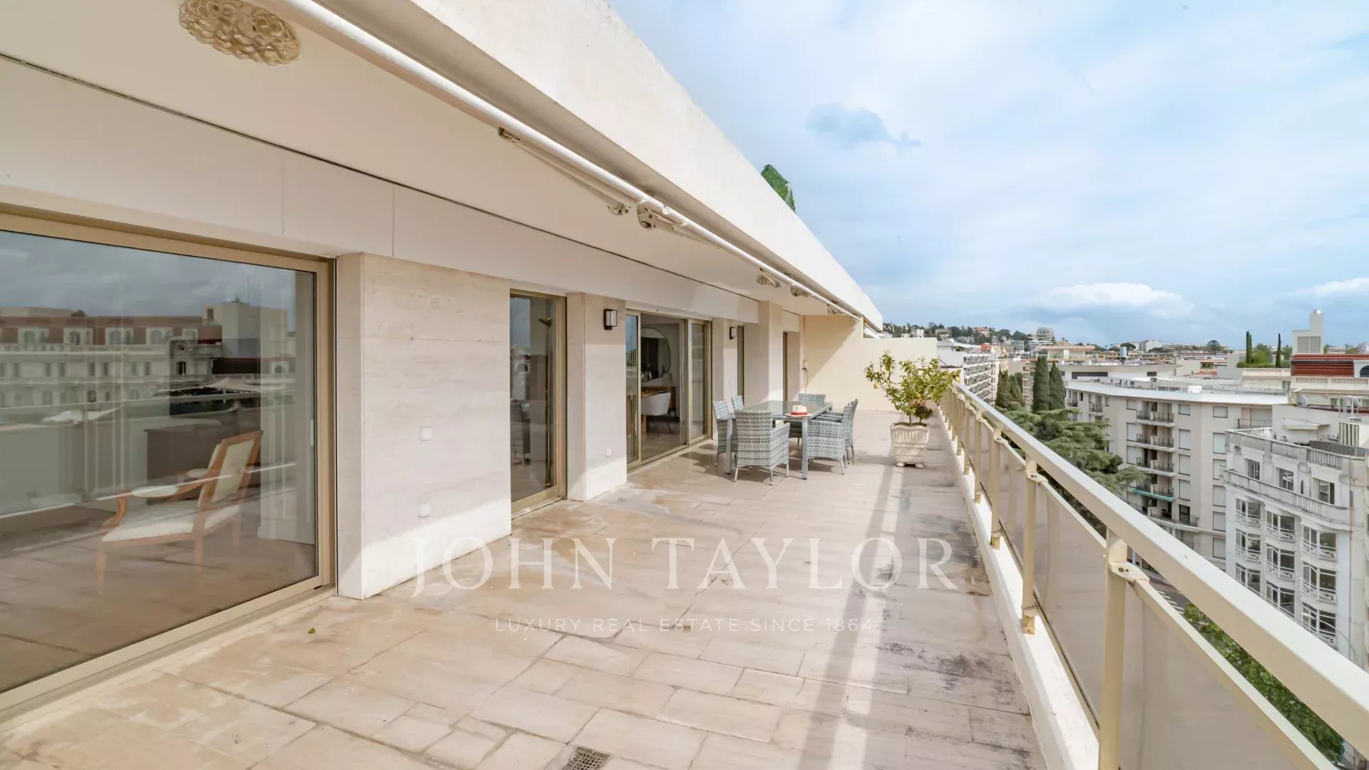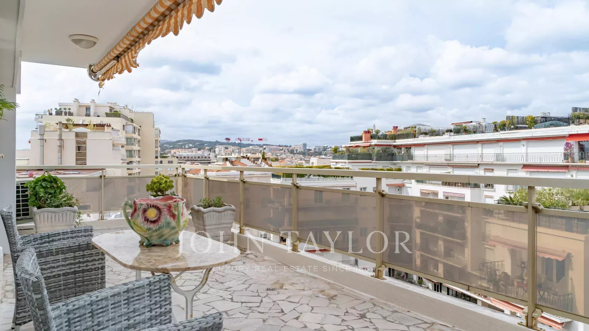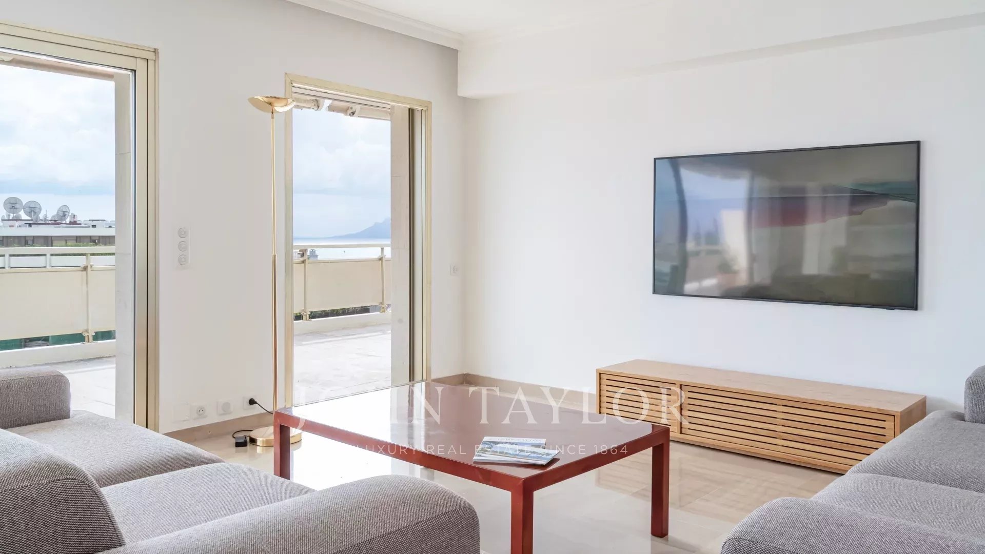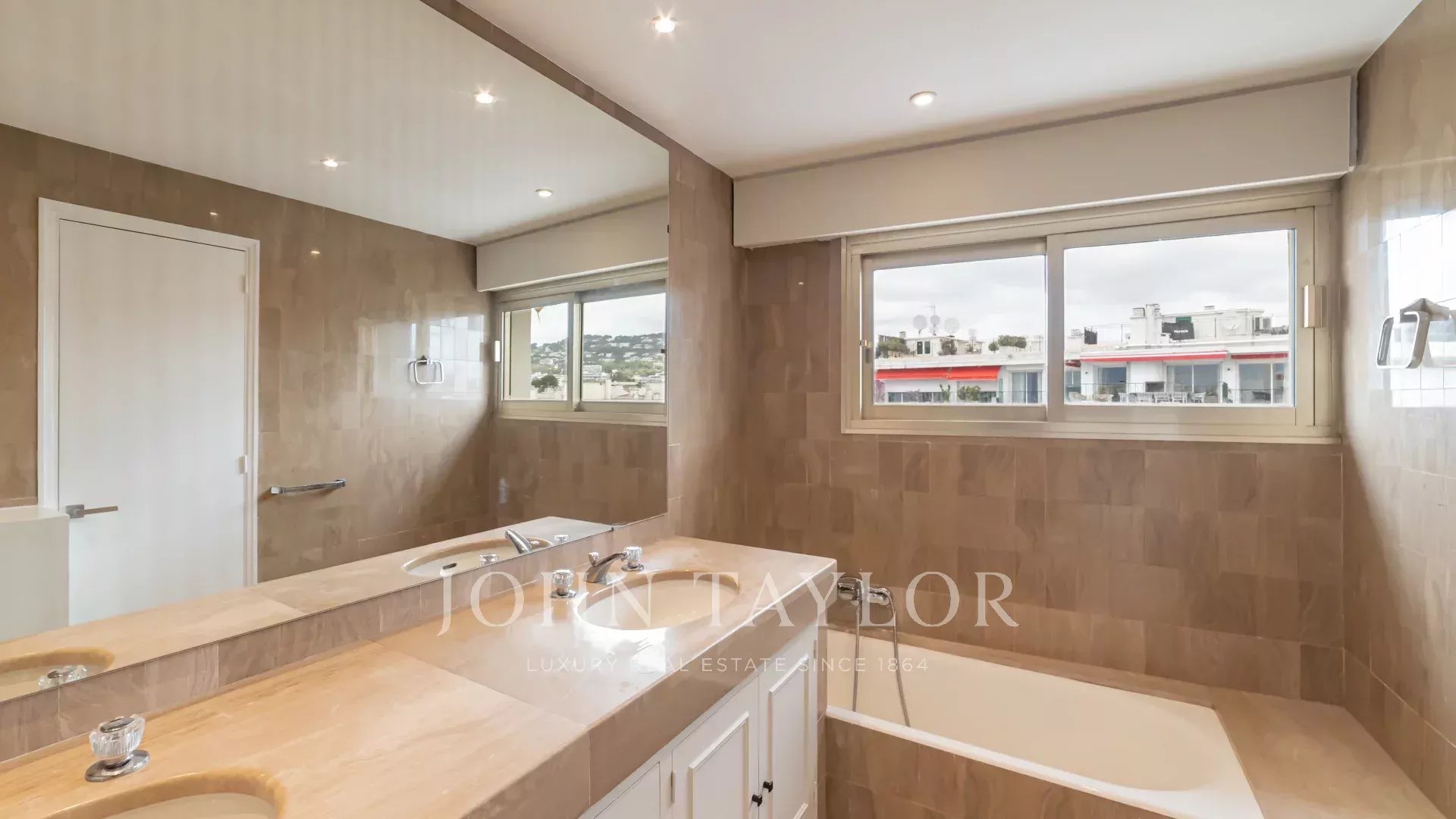 Exposé plein sud, appartement entièrement climatisé de 140 m2 habitables au dernier étage (8ème) d’une résidence centre ville, à quelques minutes à pied des plages et du Palais des Festivals.