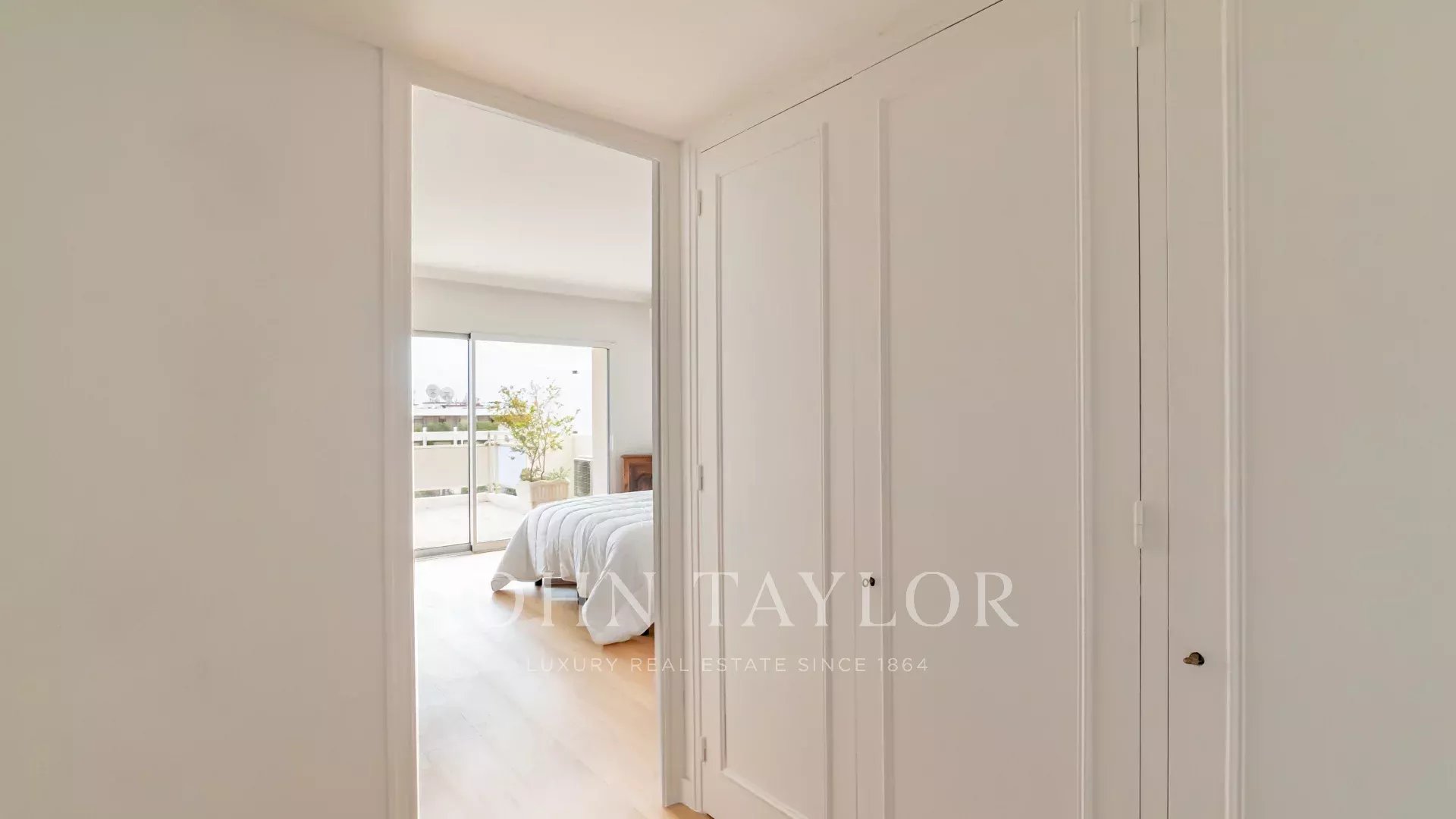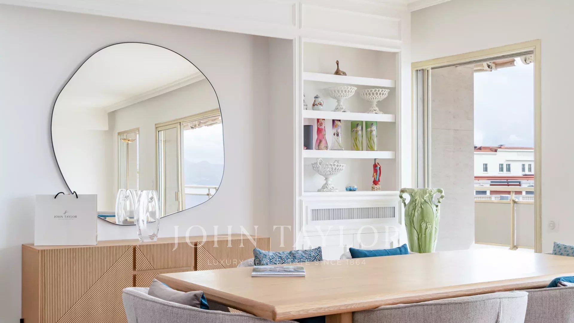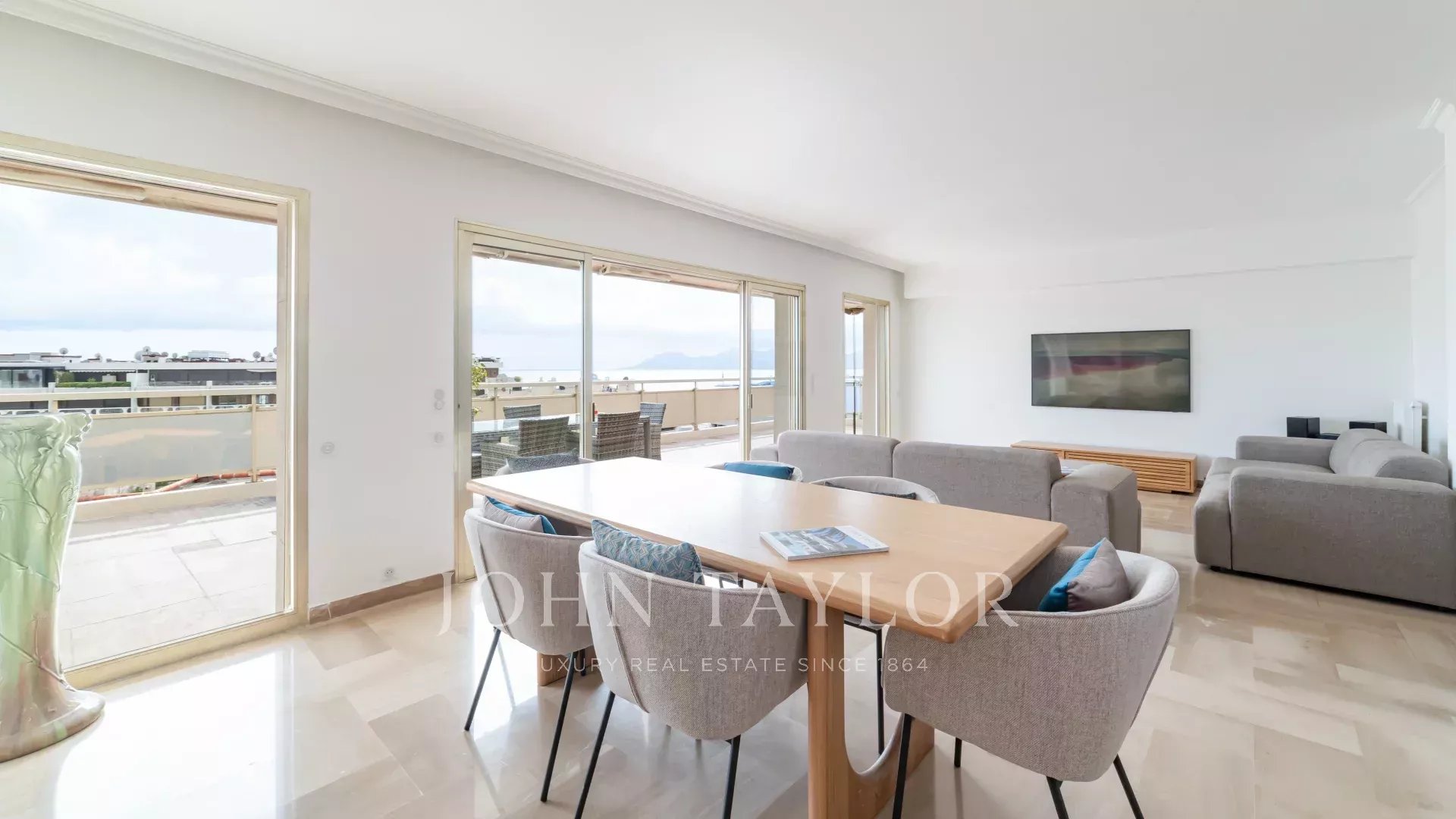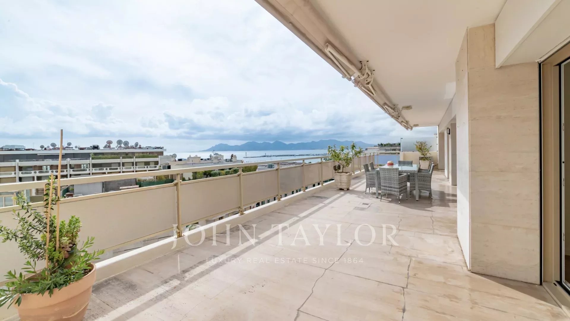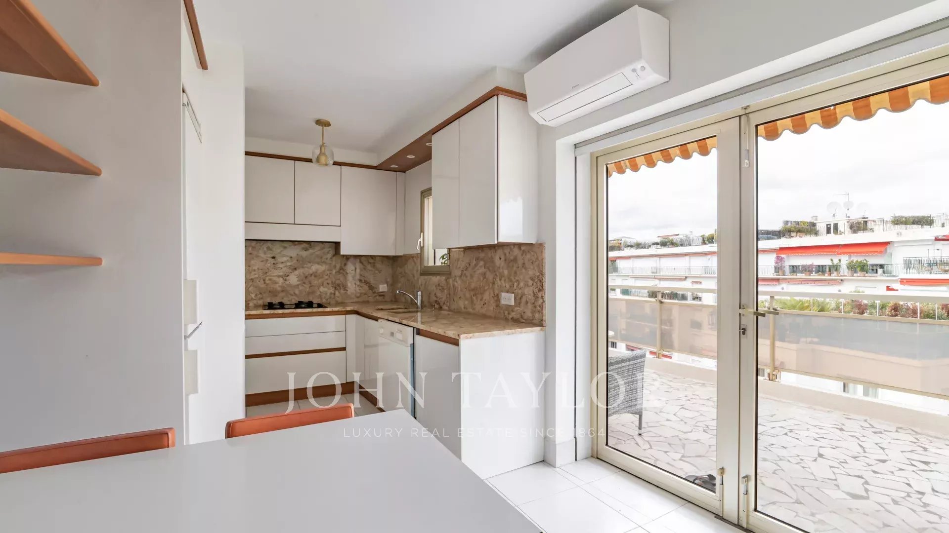 Exposé plein sud, appartement entièrement climatisé de 140 m2 habitables au dernier étage (8ème) d’une résidence centre ville, à quelques minutes à pied des plages et du Palais des Festivals.