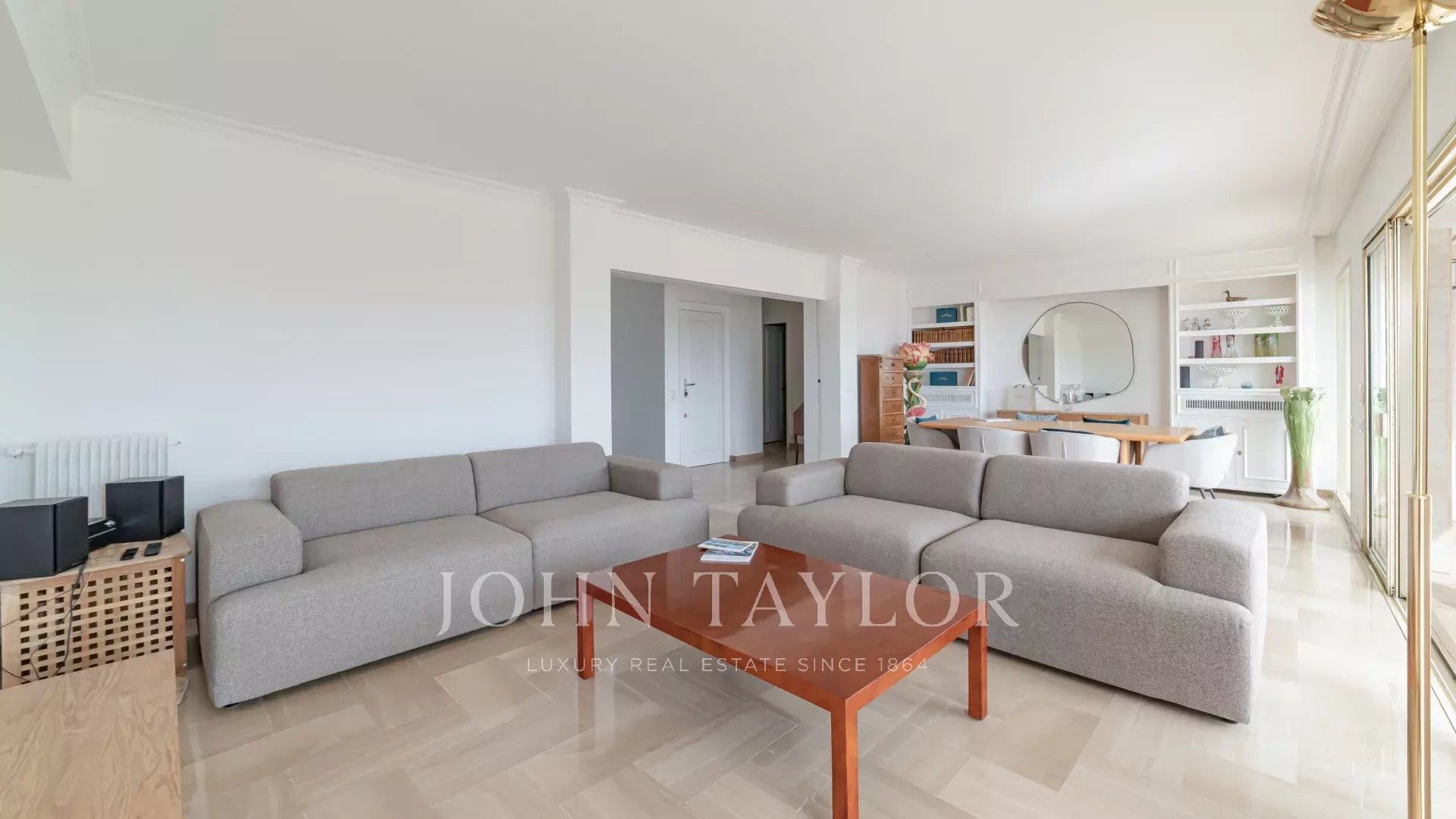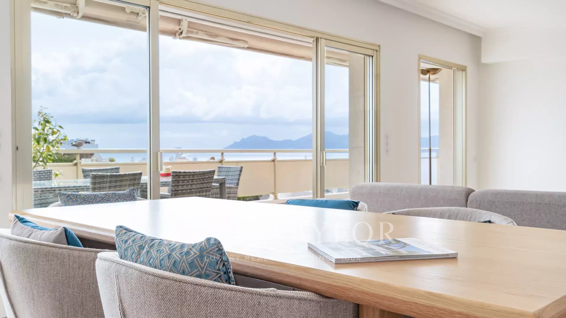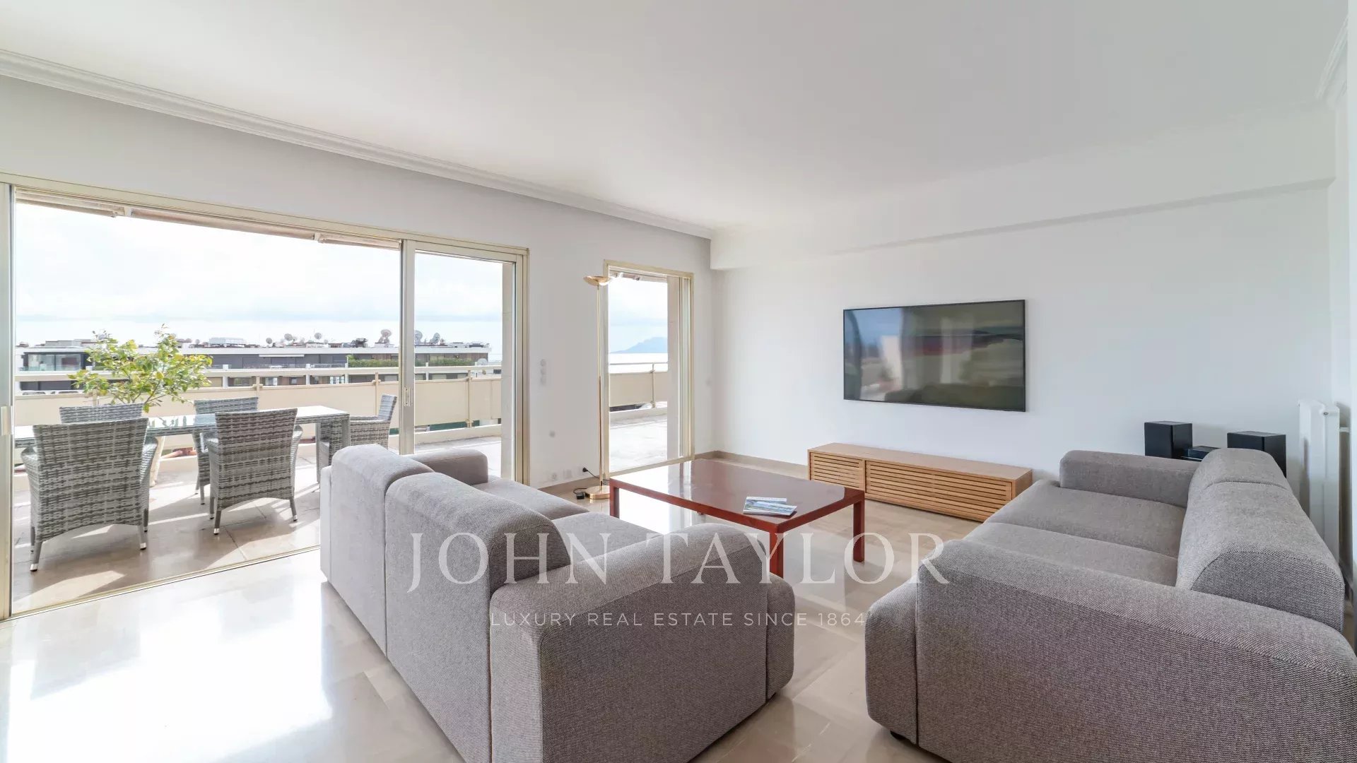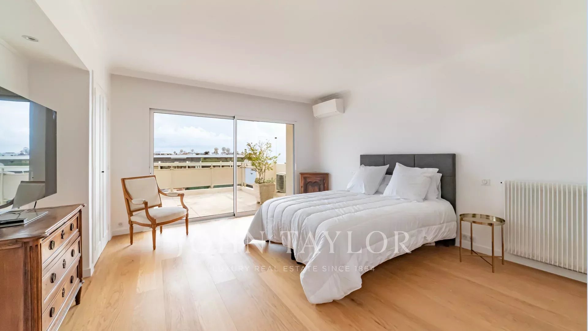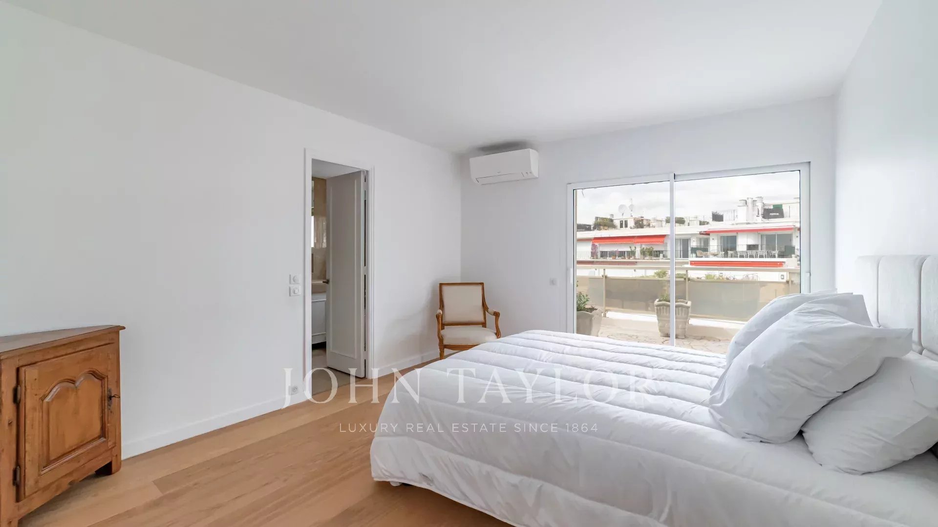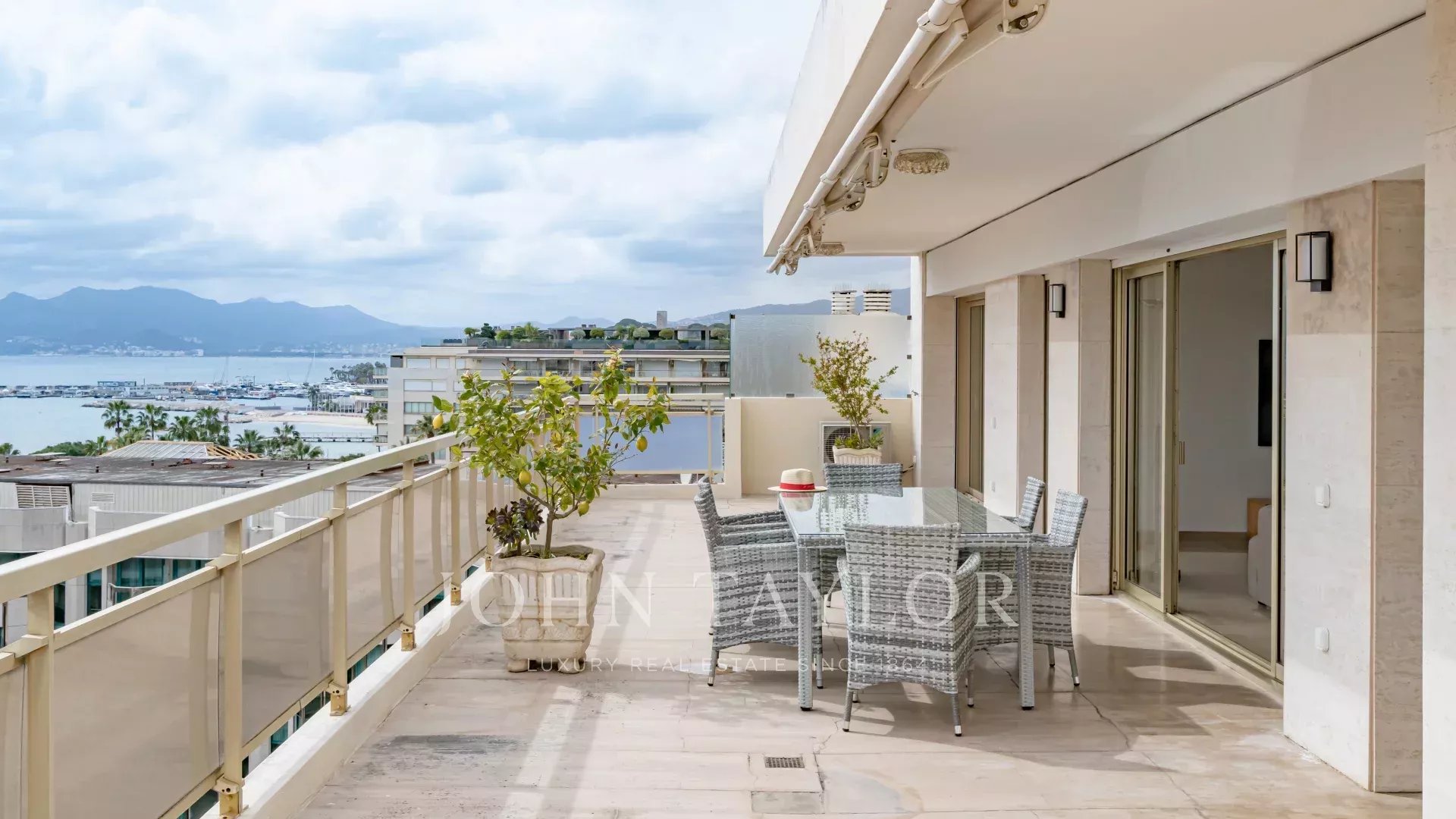 Exposé plein sud, appartement entièrement climatisé de 140 m2 habitables au dernier étage (8ème) d’une résidence centre ville, à quelques minutes à pied des plages et du Palais des Festivals.