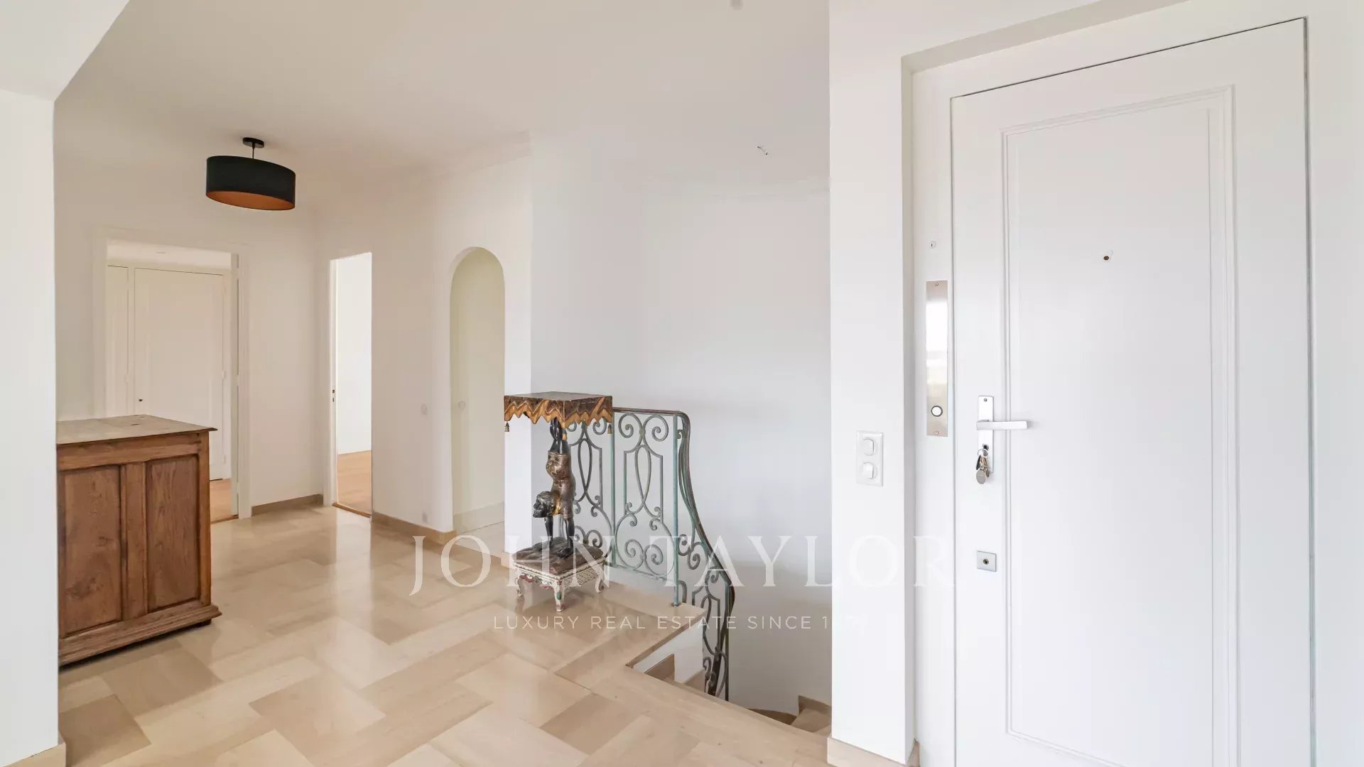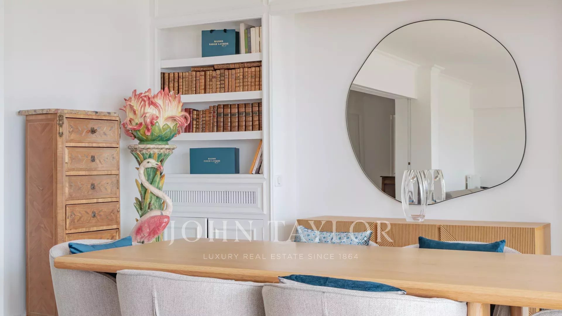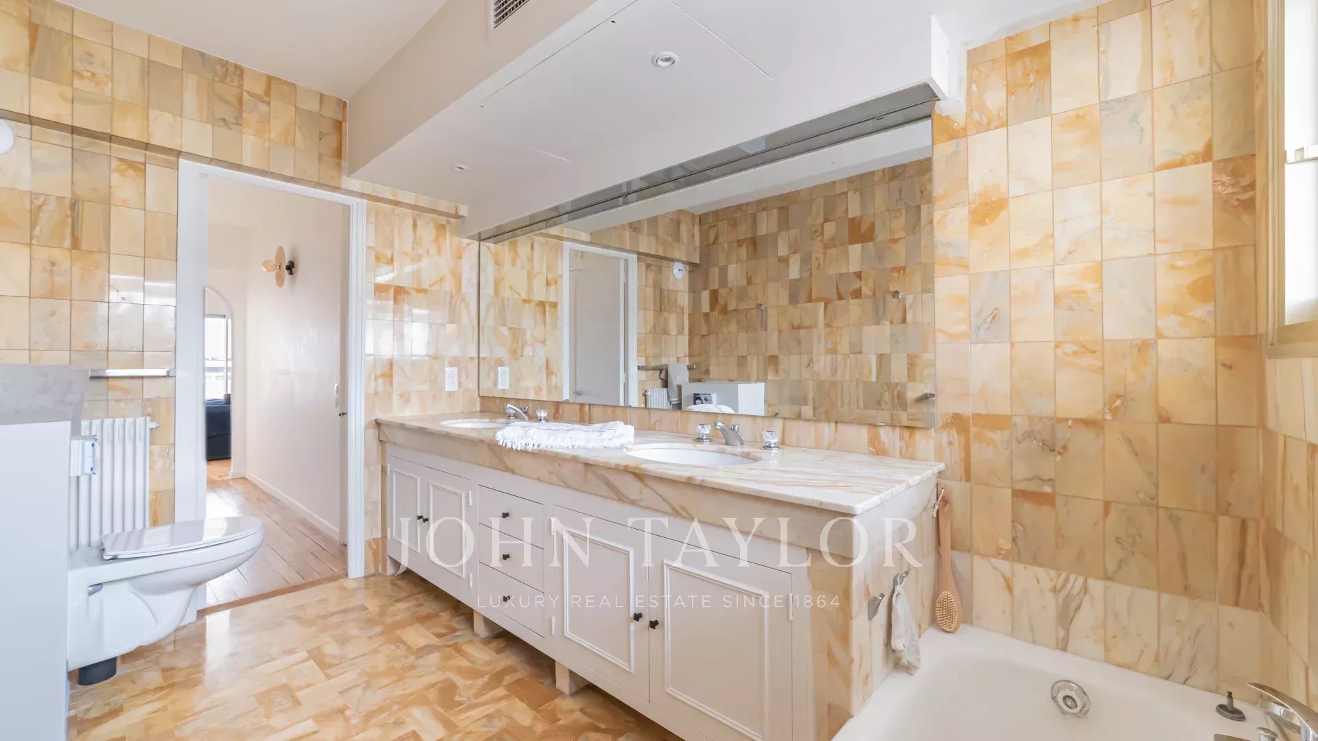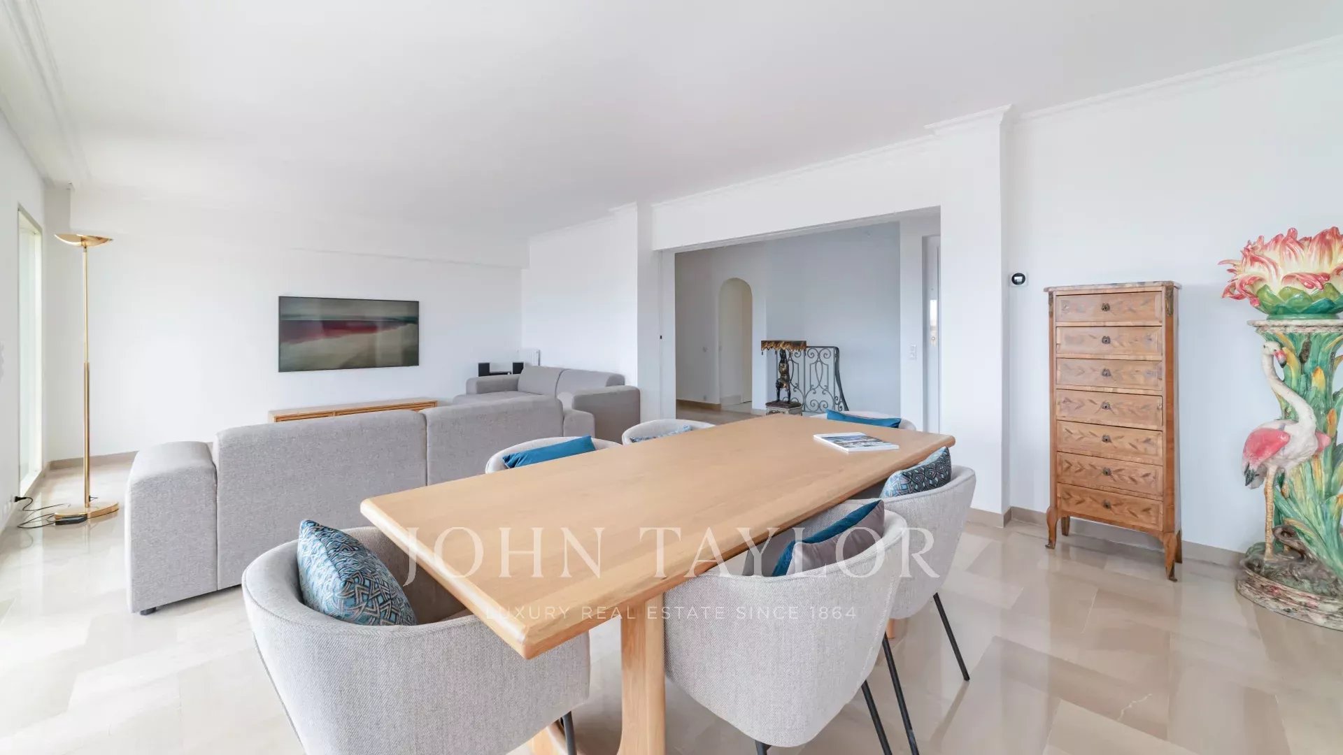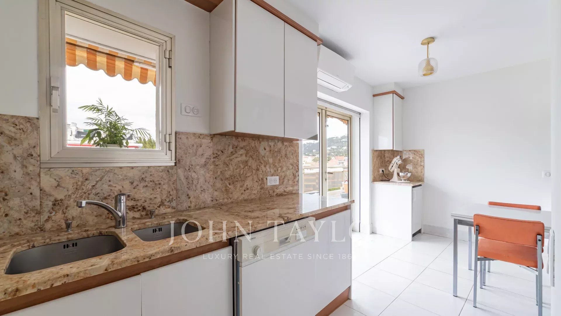 Exposé plein sud, appartement entièrement climatisé de 140 m2 habitables au dernier étage (8ème) d’une résidence centre ville, à quelques minutes à pied des plages et du Palais des Festivals.