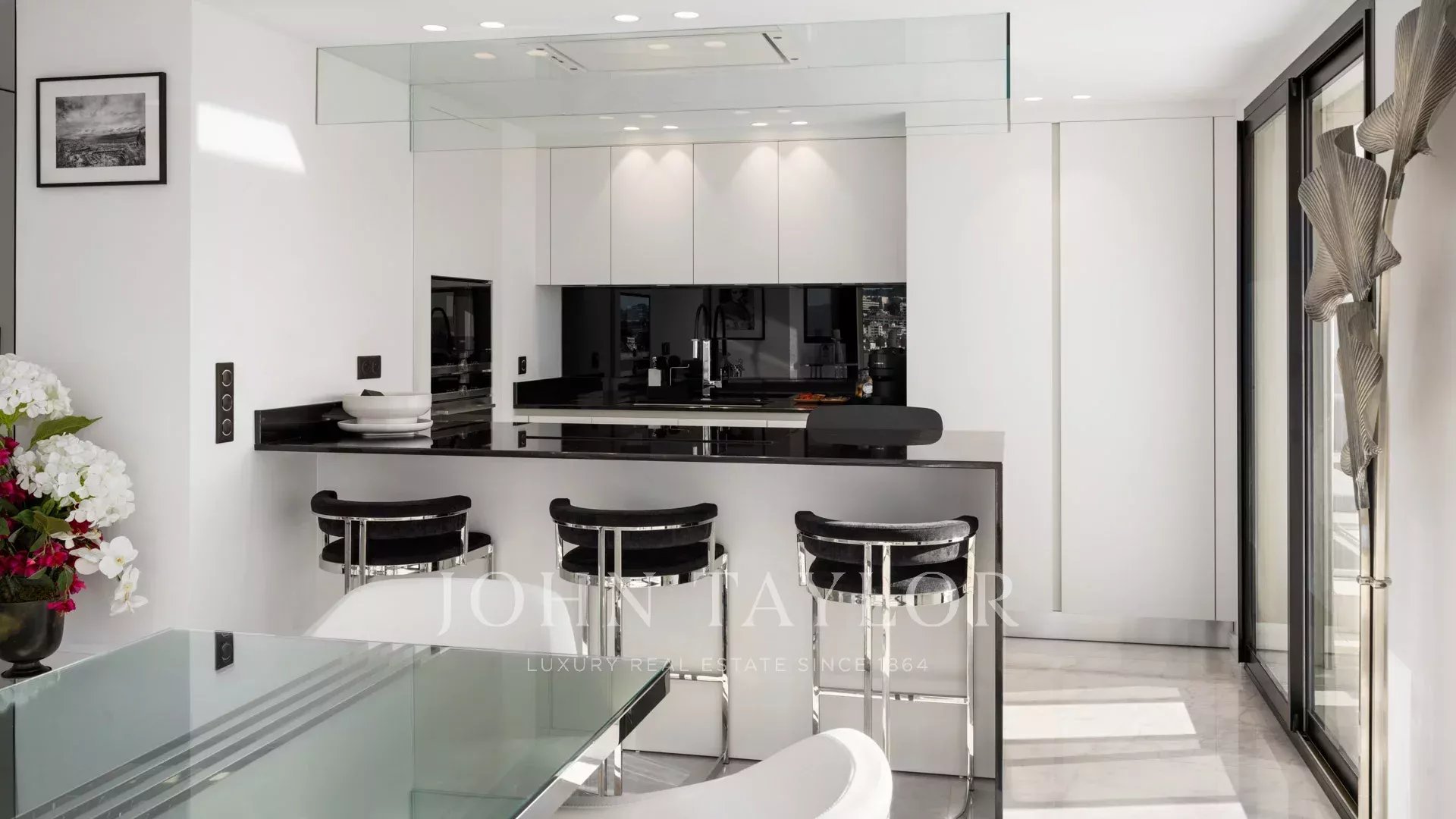 Entrée menant à un spacieux salon avec espace salle à manger ainsi qu'une cuisine américaine parfaitement équipée (Nespresso, bouilloire, grille-pain, cave à vin.)