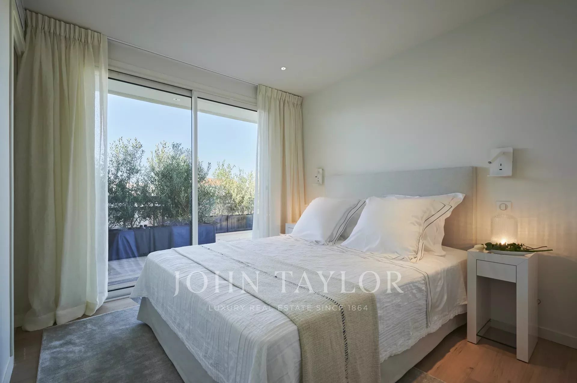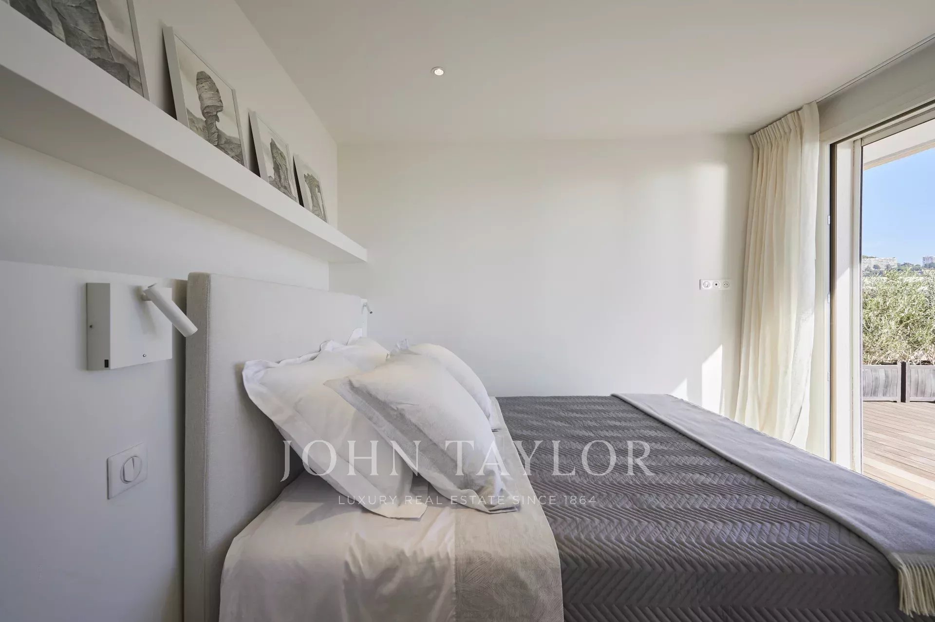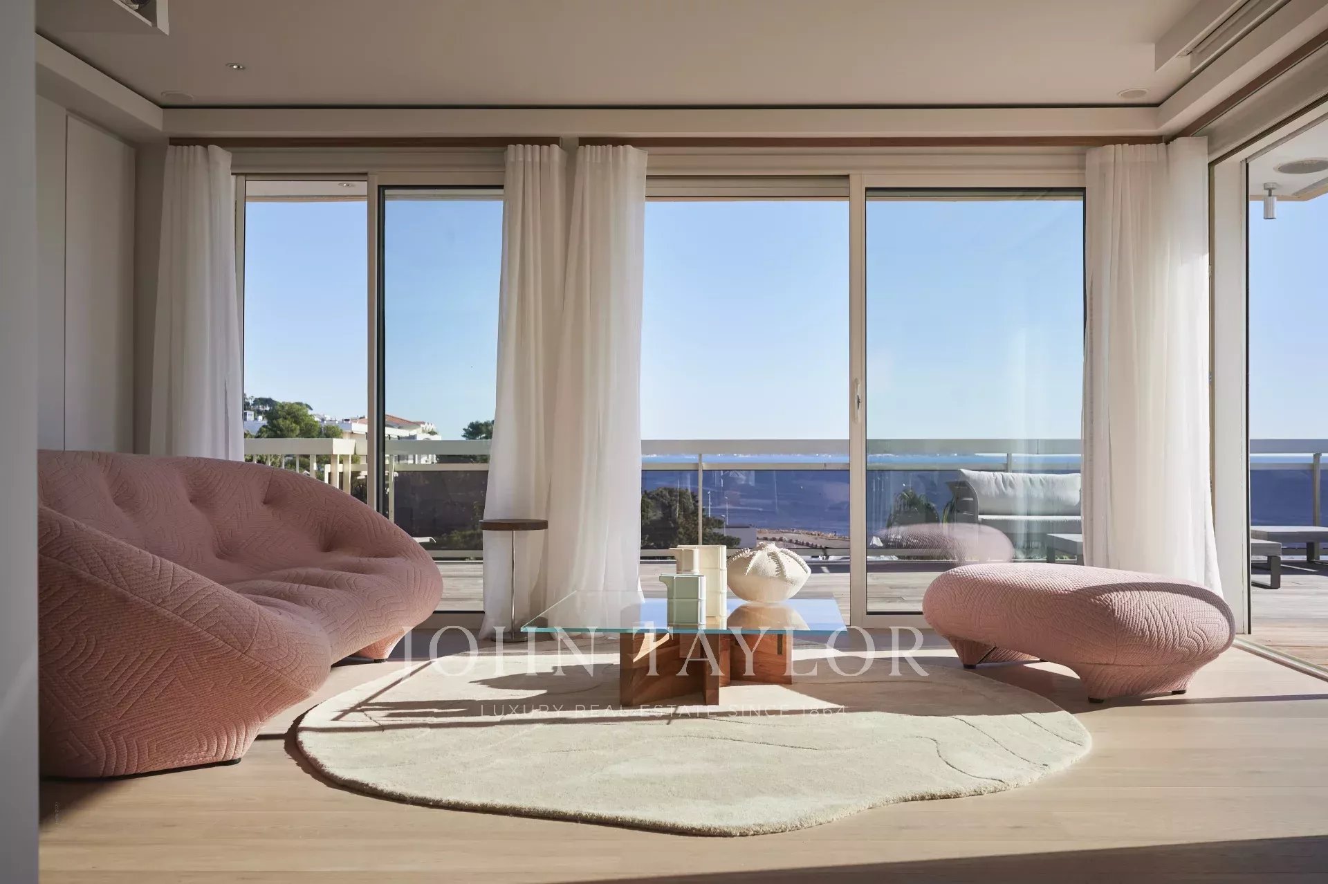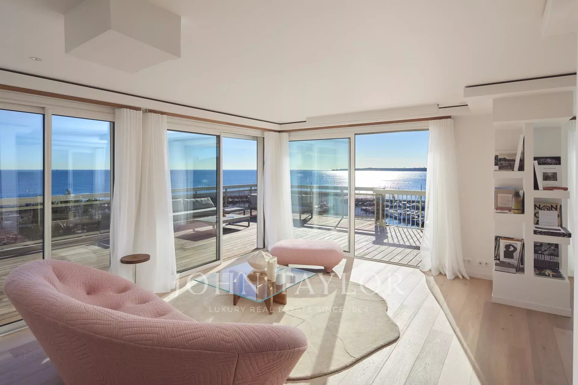 Dans le quartier du Palm Beach proche du port du « Mouré Rouge » et de ses plages, au 5ème et dernier étage d’une résidence, bel appartement d'une superficie habitable de 91m² environ, agrémenté d’une terrasse de 154 m2 offrant de superbes vues sur les îles de Lérins et le Cap d'Antibes.