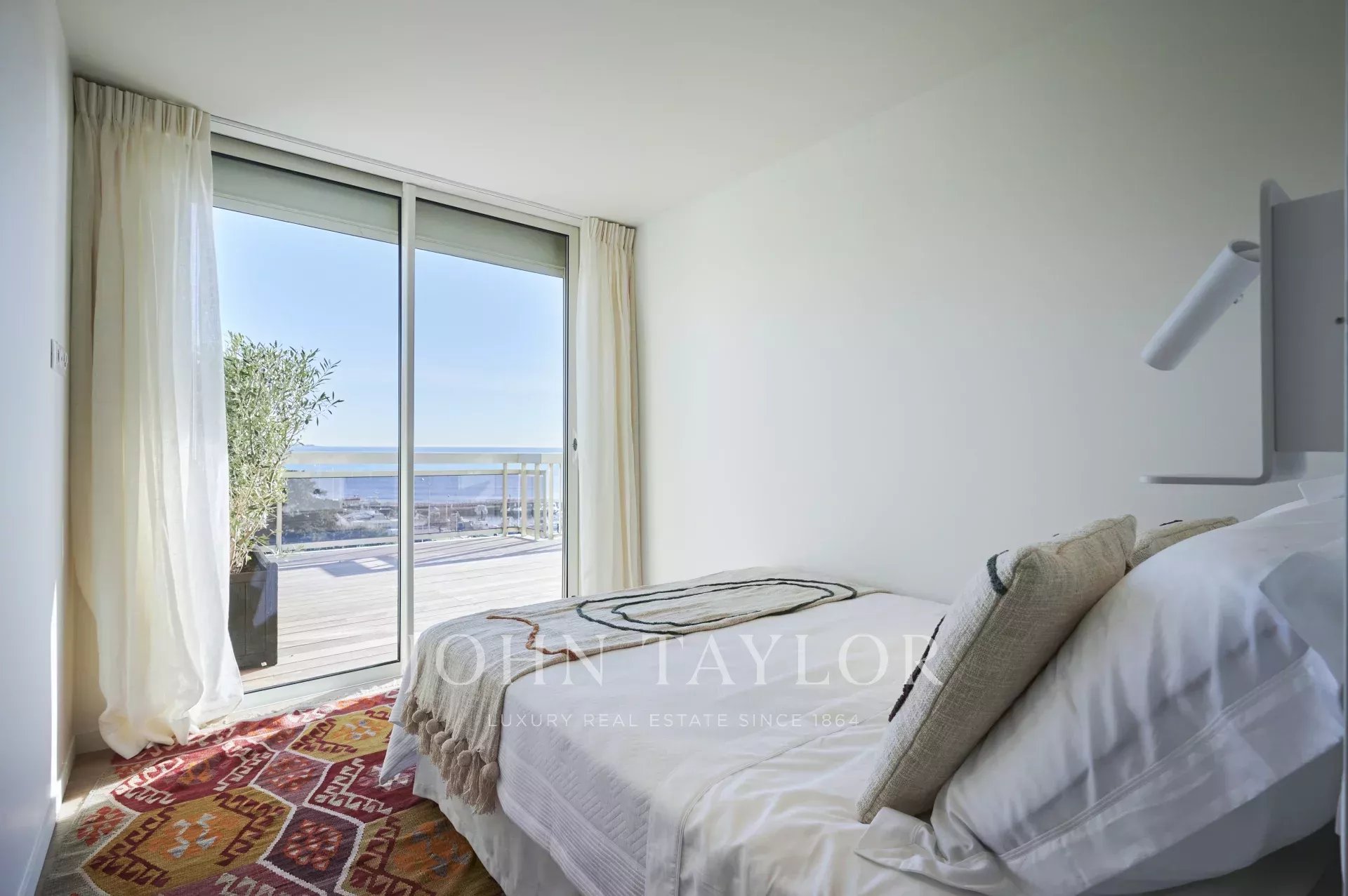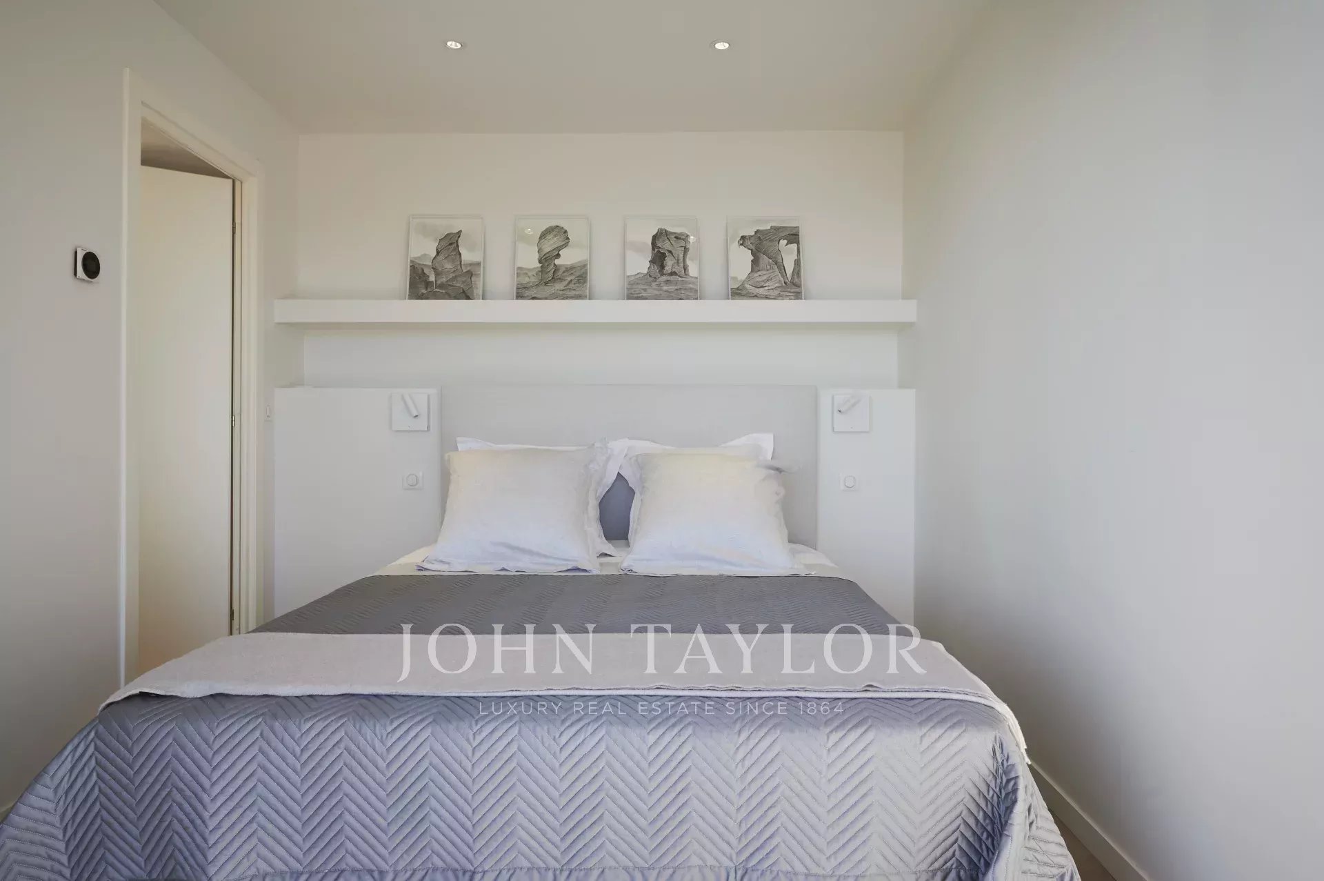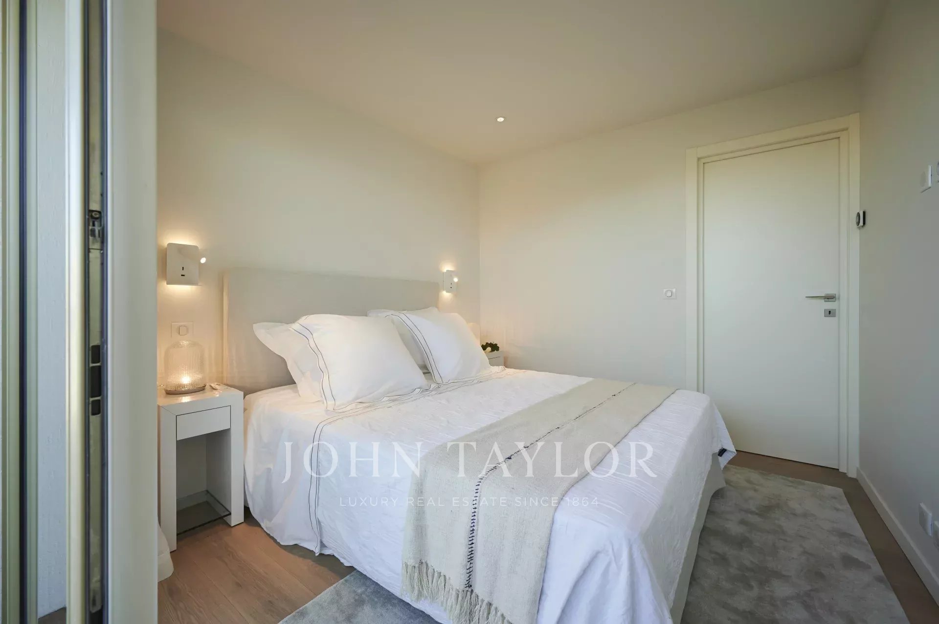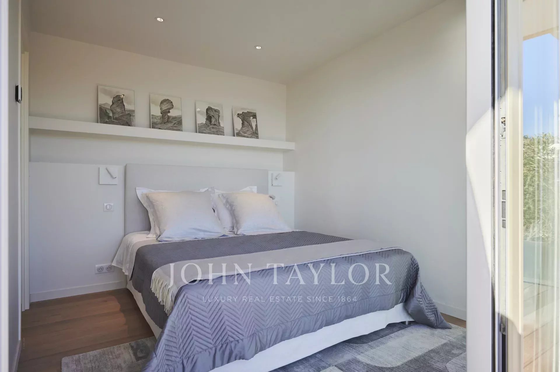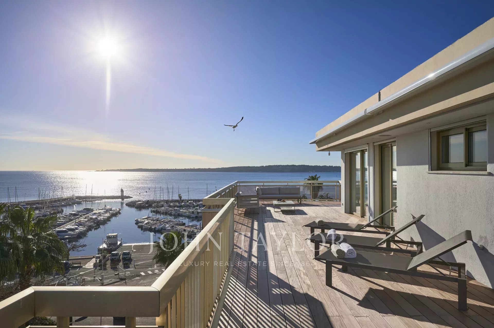 Dans le quartier du Palm Beach proche du port du « Mouré Rouge » et de ses plages, au 5ème et dernier étage d’une résidence, bel appartement d'une superficie habitable de 91m² environ, agrémenté d’une terrasse de 154 m2 offrant de superbes vues sur les îles de Lérins et le Cap d'Antibes.