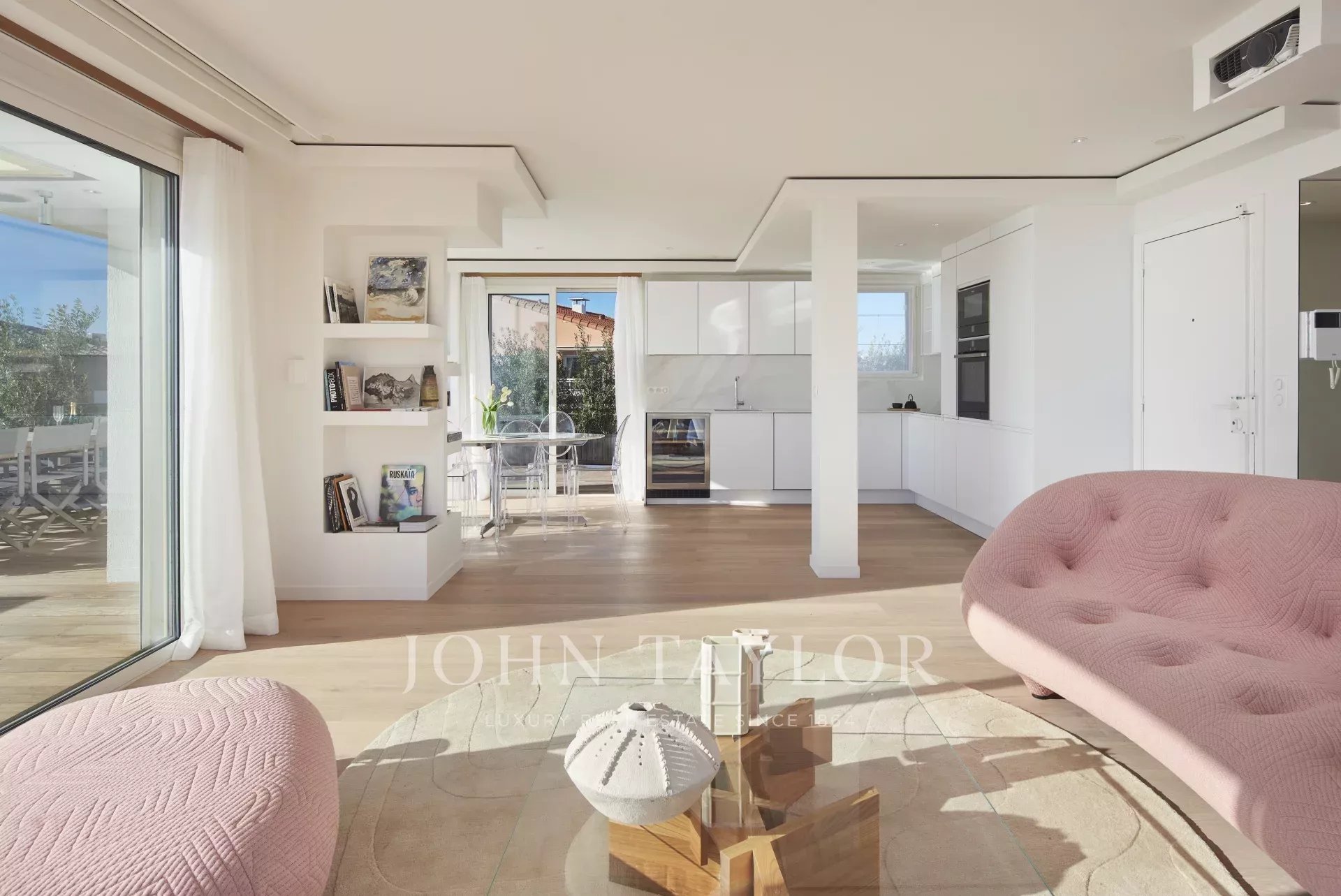 Entrée menant sur une belle réception s’ouvrant sur terrasse et offrant une cuisine ouverte entièrement équipée, un salon et un coin salle à manger.