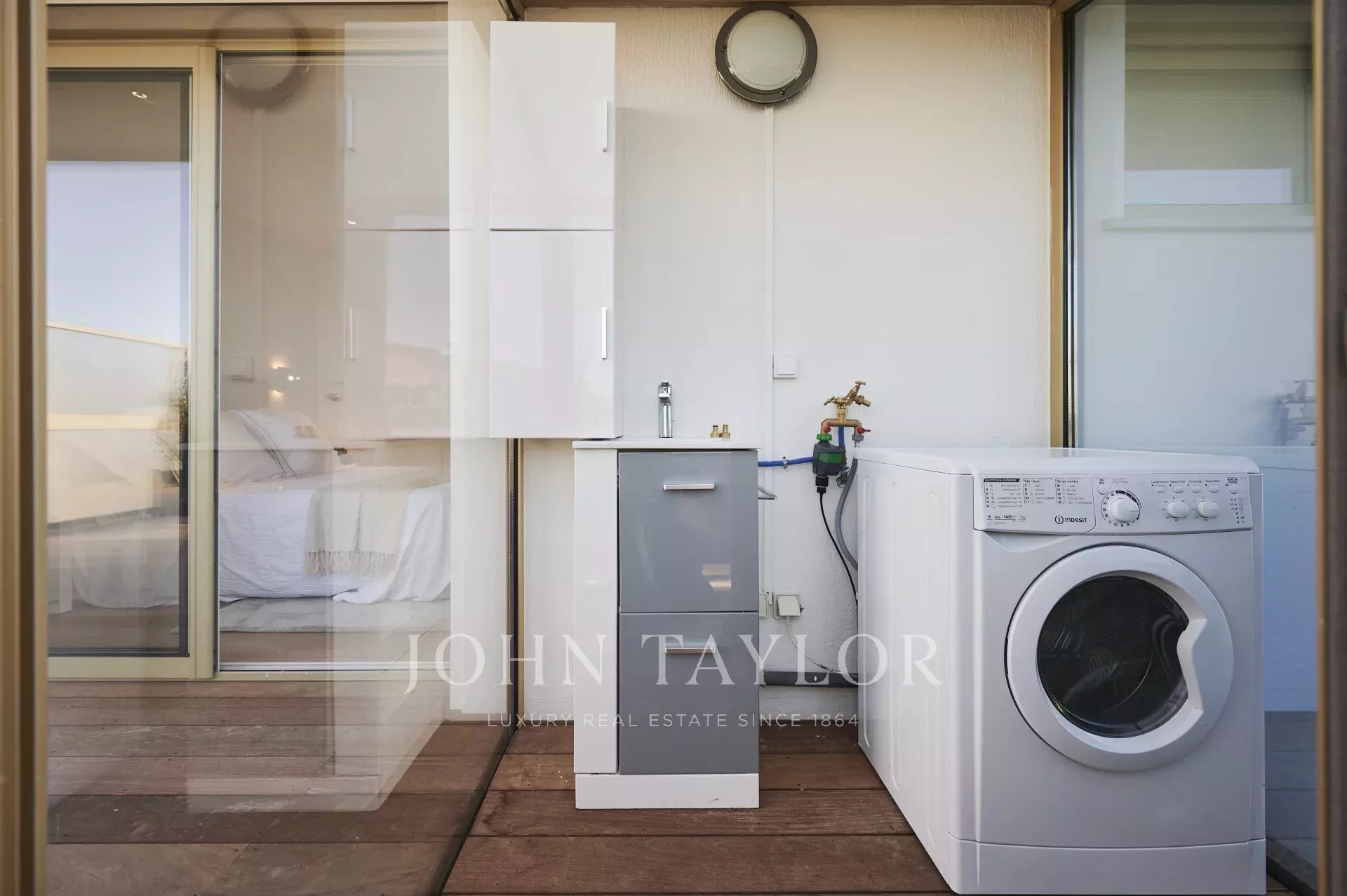 Terrasse aménagée (mobilier extérieur) et équipée d'une plancha - coin buanderie avec lave-linge.