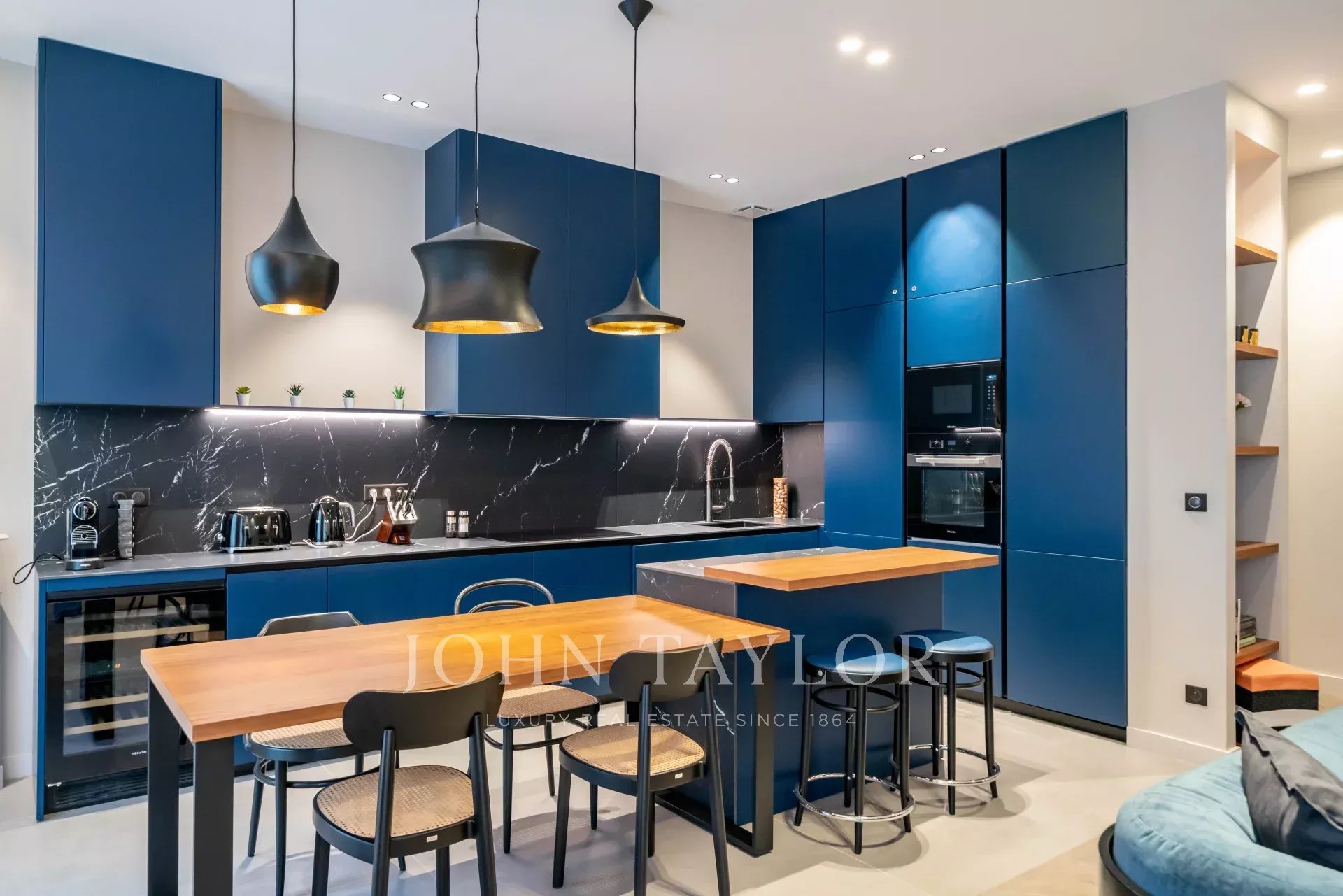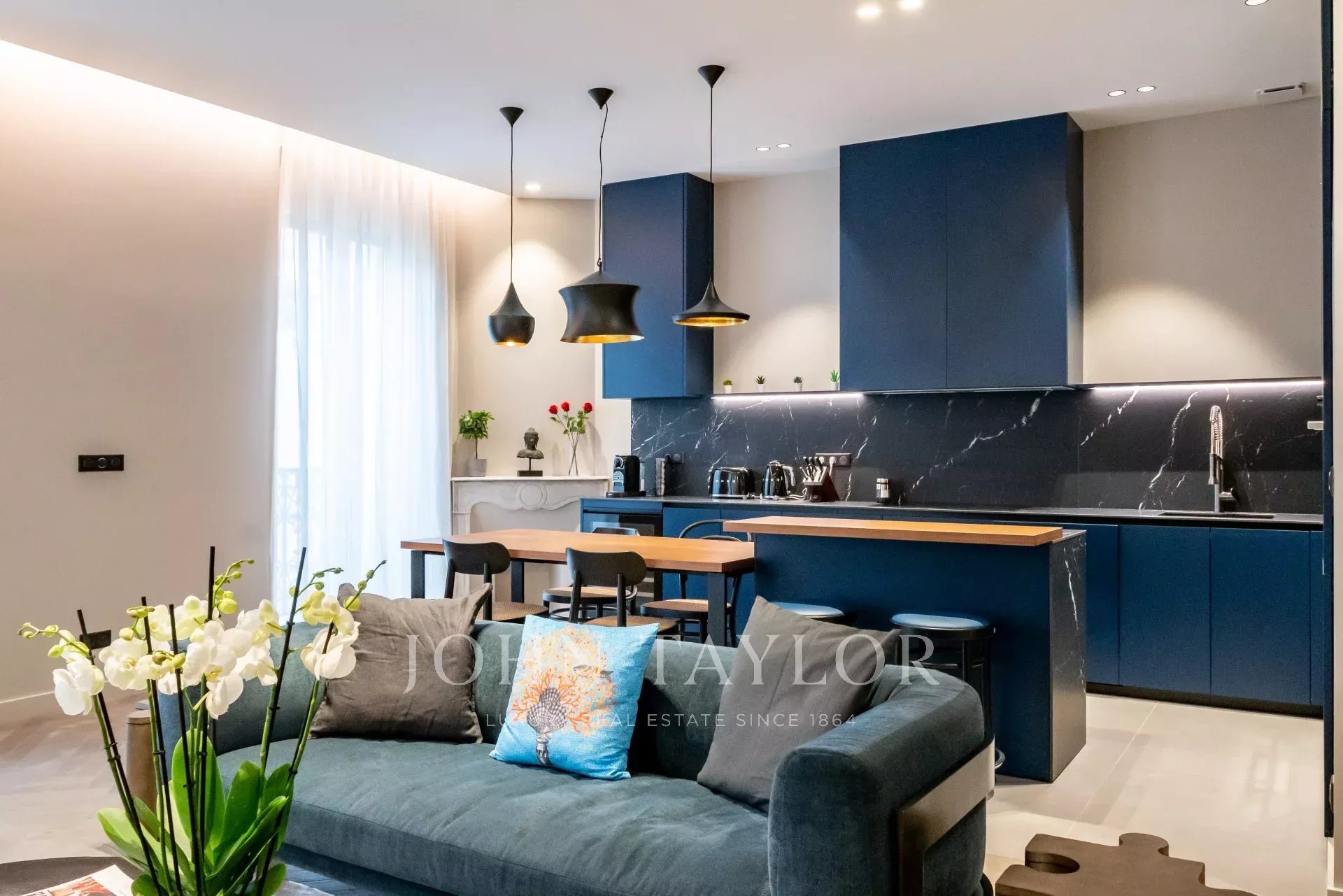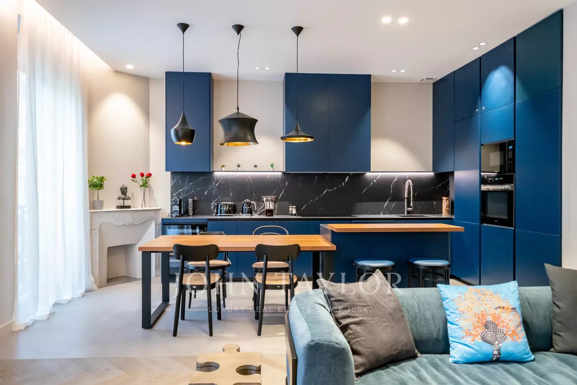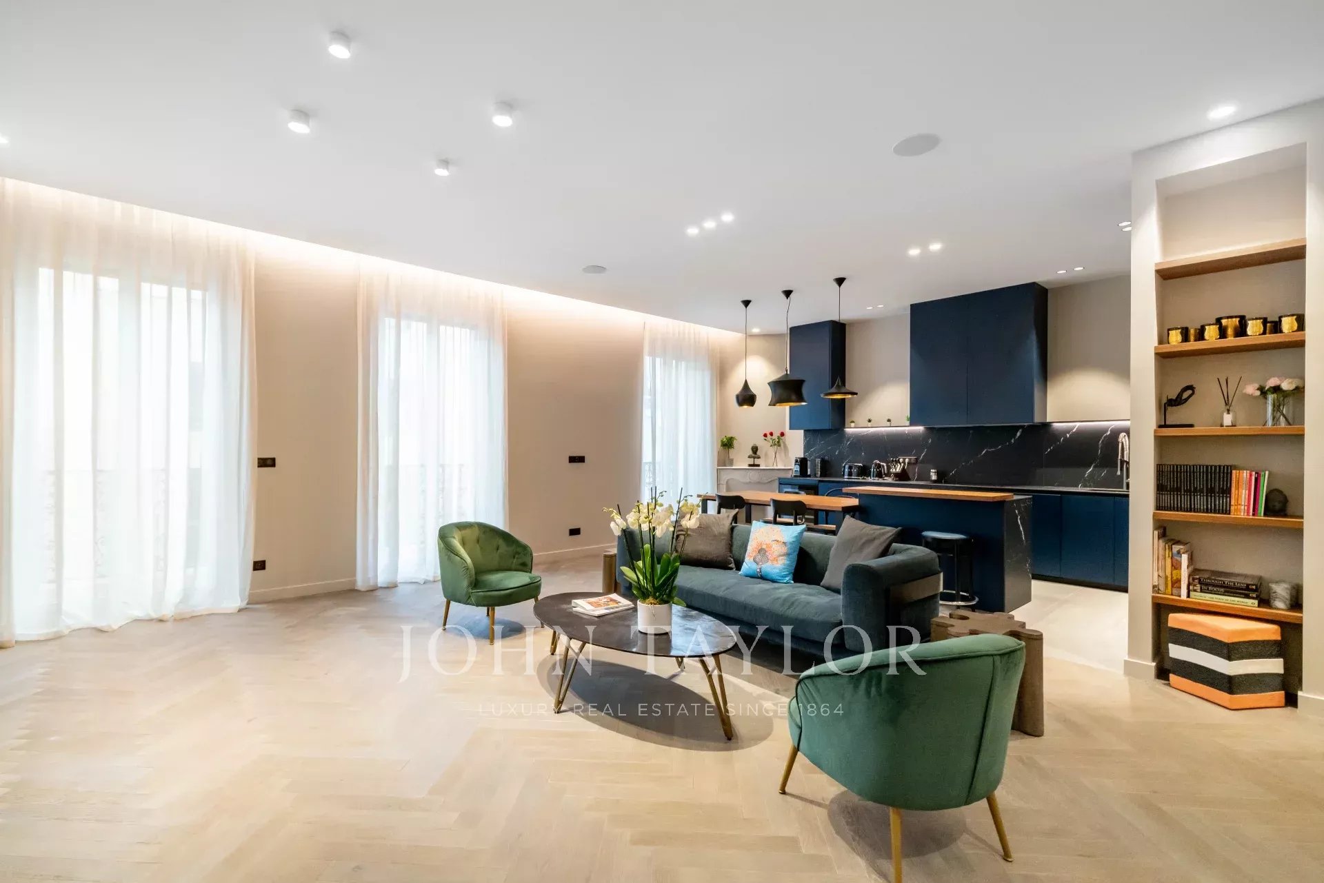 appartement de 3 pièces de 100 m2 entièrement rénovée avec salon, salle à manger ouvert sur cuisine et 2 chambres avec 2 salle de douches.
