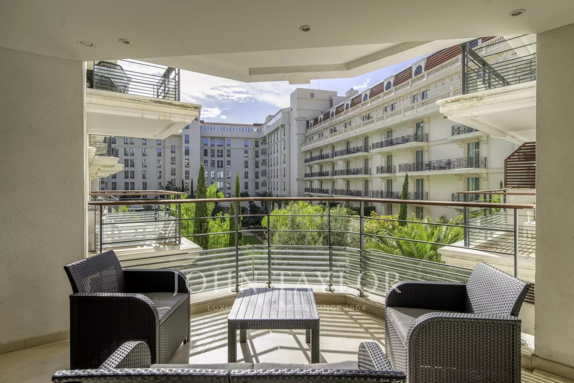 L’appartement, entièrement climatisé, comprend un vaste séjour lumineux avec cuisine ouverte aménagée, donnant sur une agréable terrasse avec vue sur les jardins de l’hôtel Carlton.