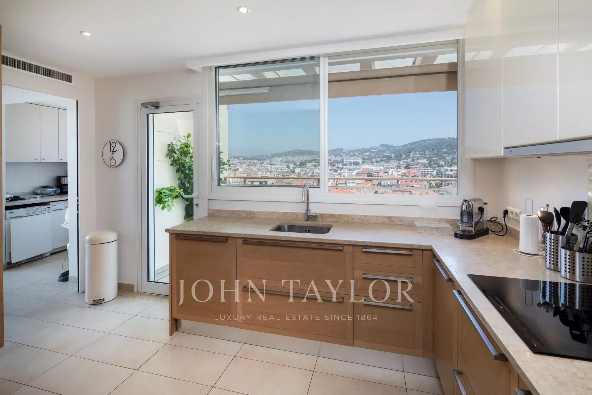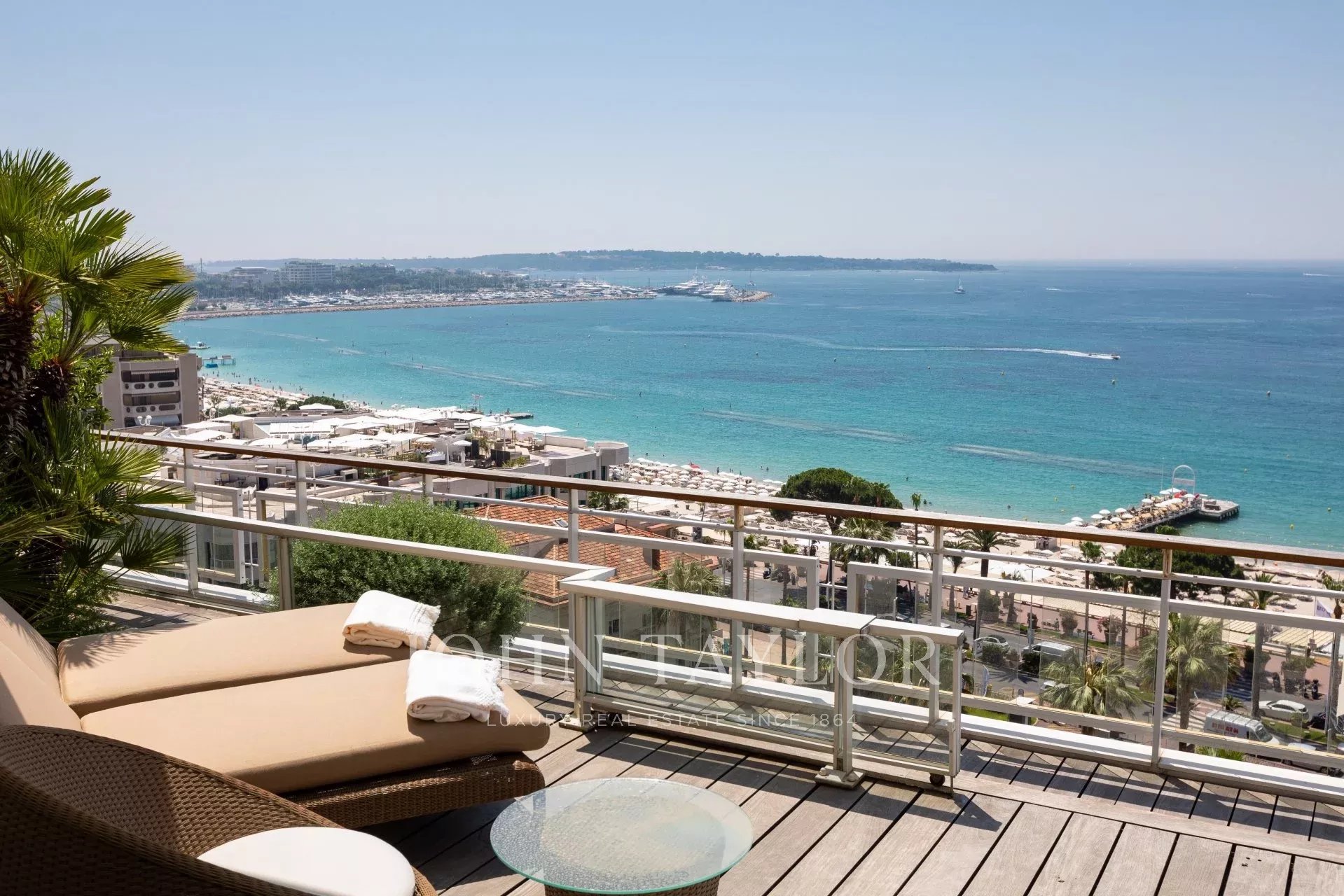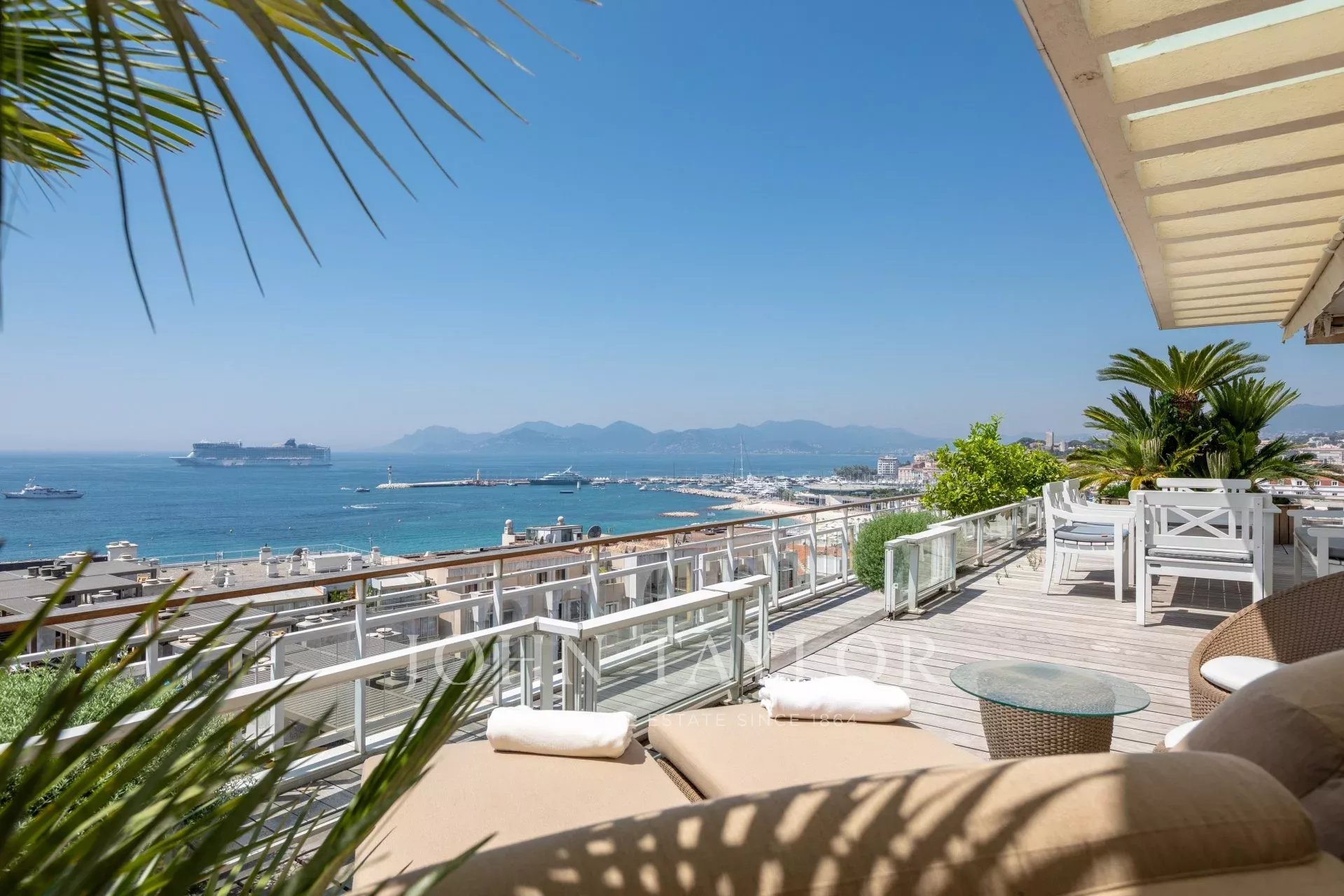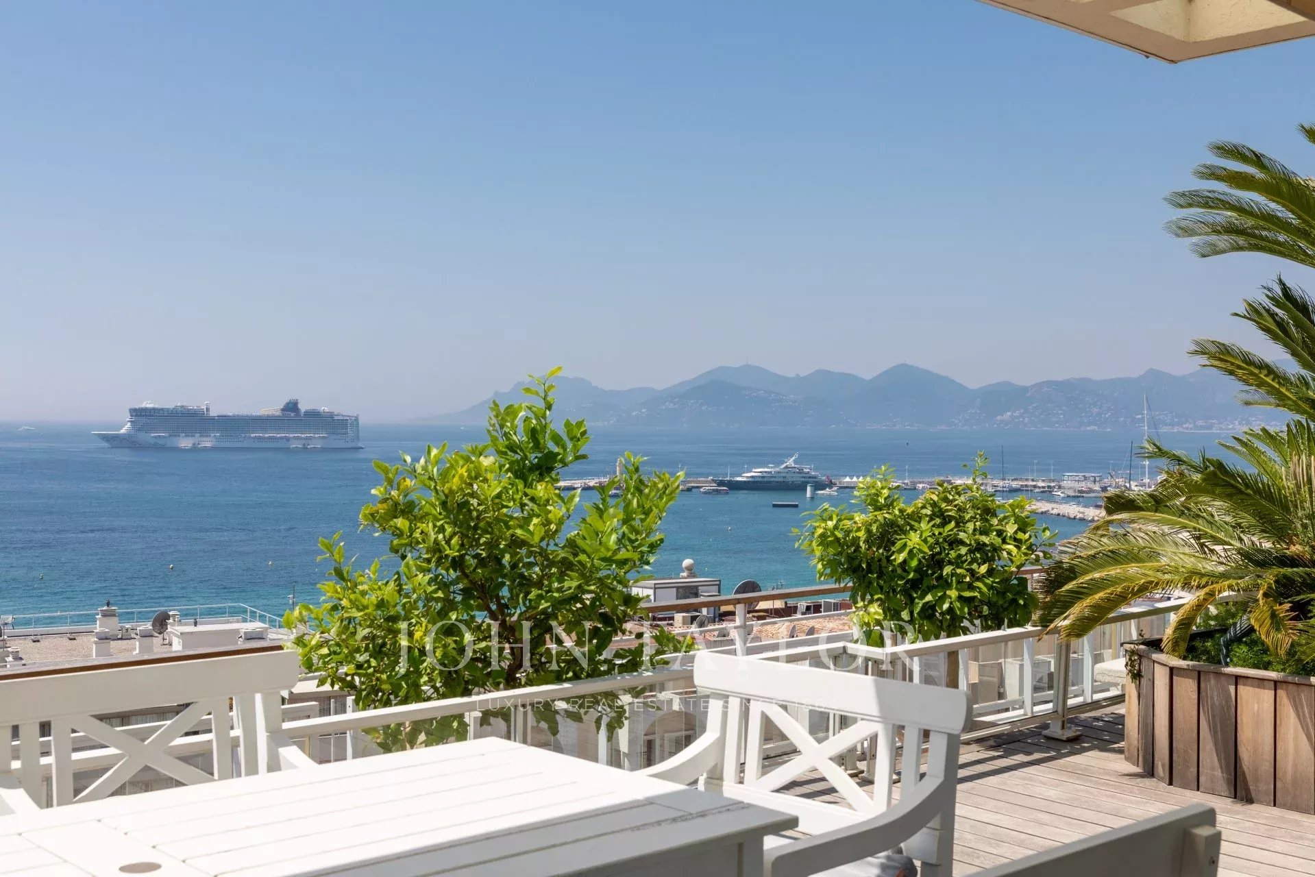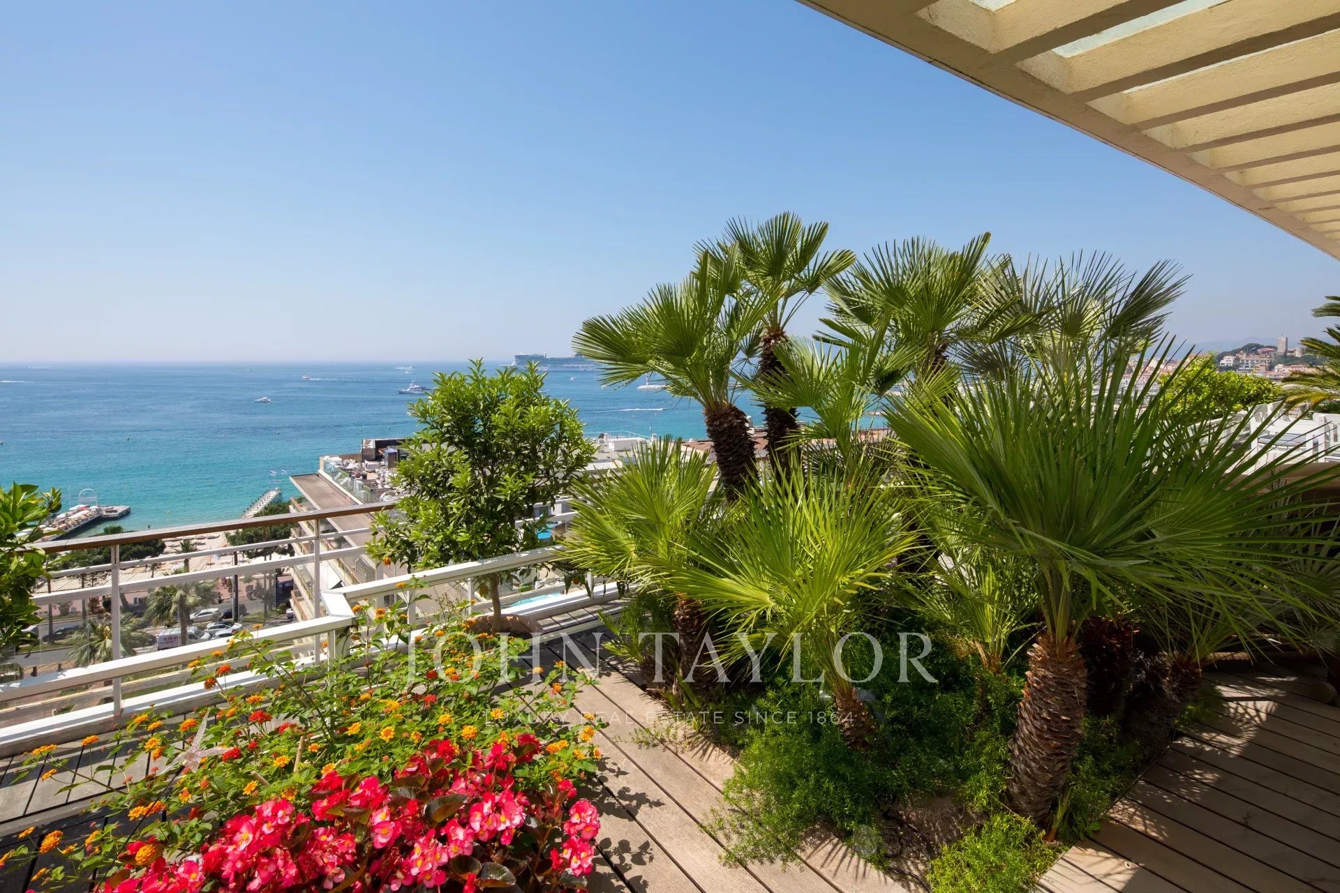 Dans une résidence de standing au coeur de la Croisette, grand appartement de 150 m² avec terrasse de 182 m² bénéficiant d'une vue panoramique sur la Baie de Cannes.