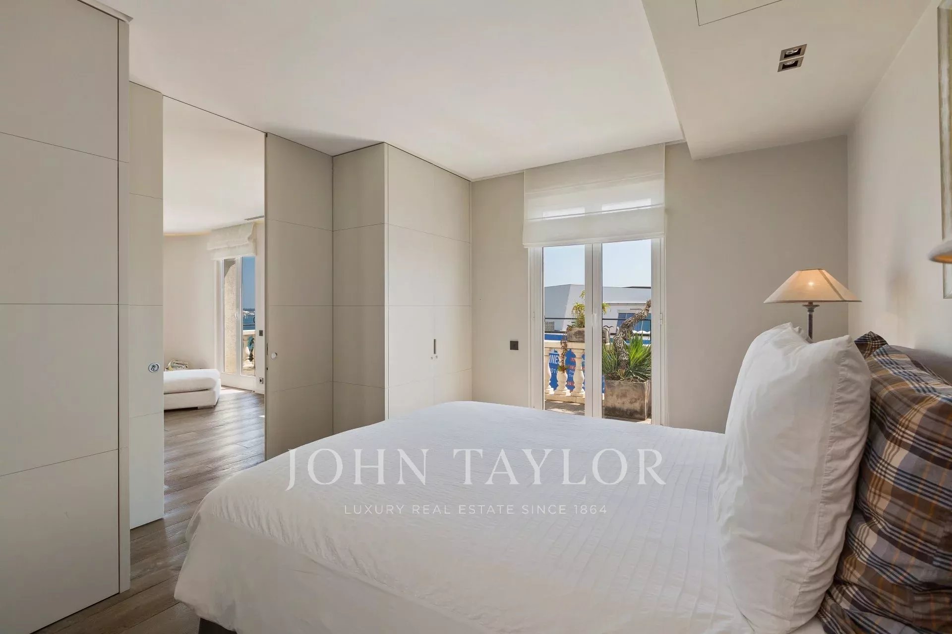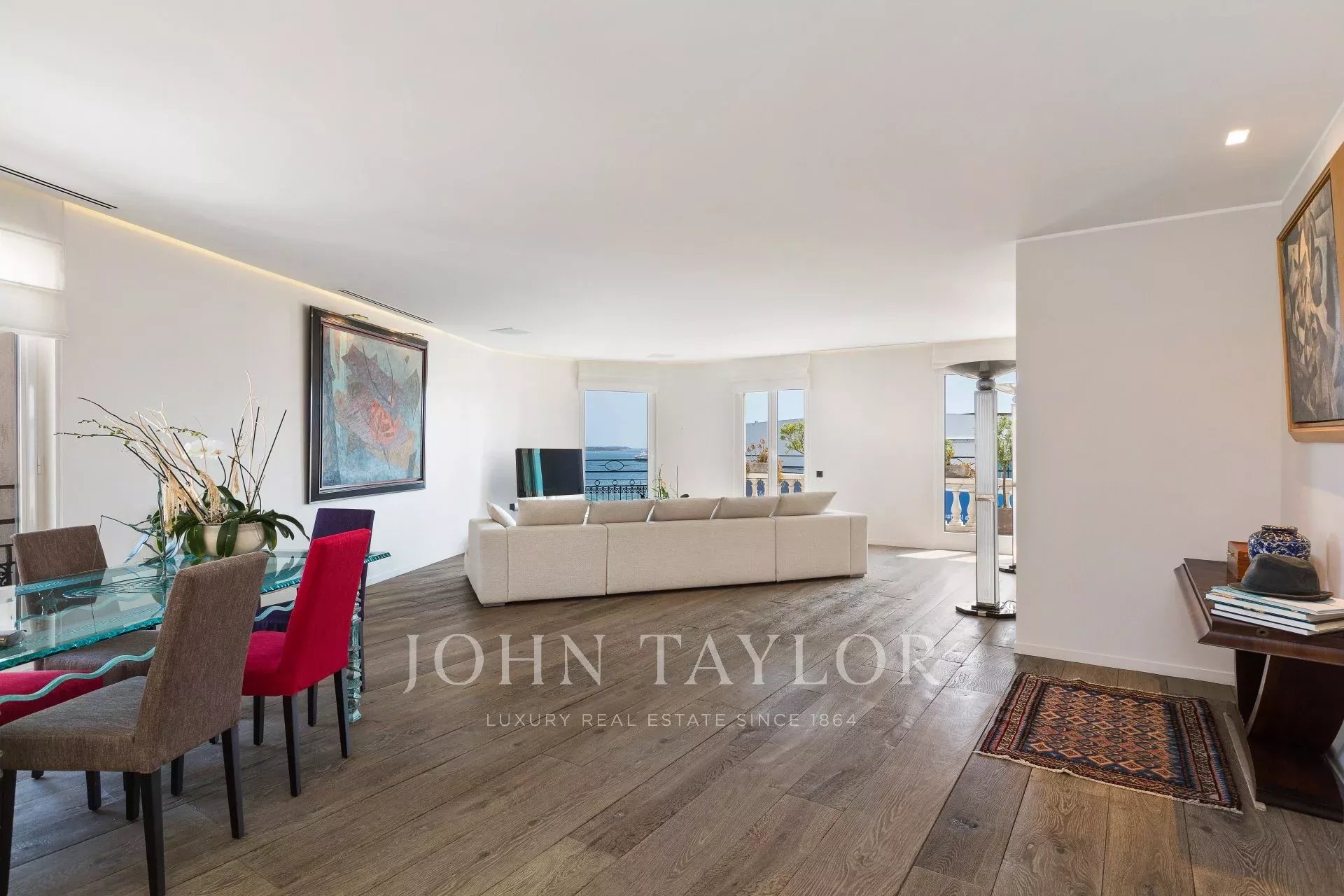Entrée s'ouvrant sur réception de 60 m2 comprenant cuisine américaine, salle à manger et salon, le tout s'ouvrant sur terrasse face à la mer et au Palais des Festivals