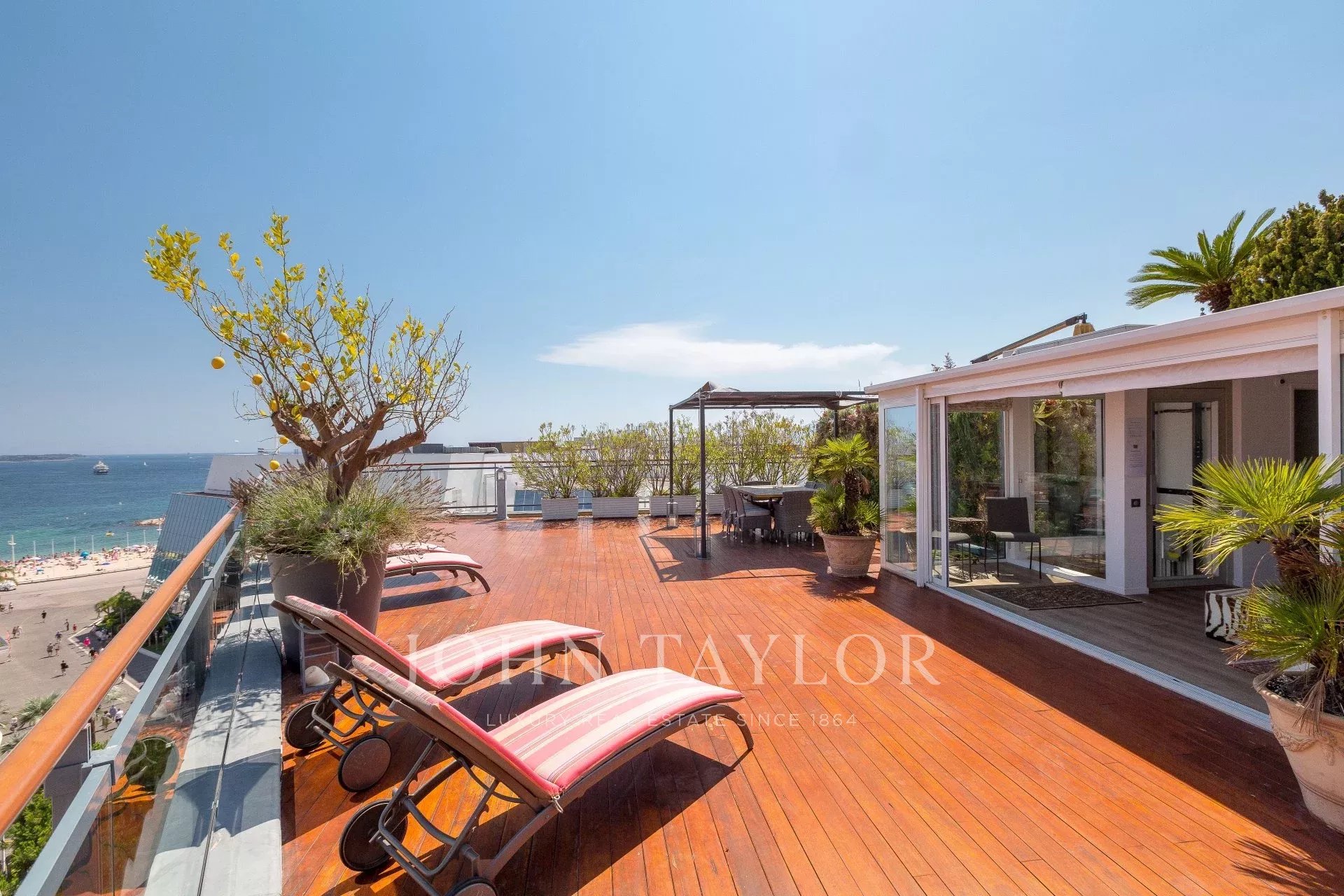 Situé sur Croisette, face aux Palais des Festivals, ce penthouse d'exception séduit par sa large terrasse en teck et sa situation.