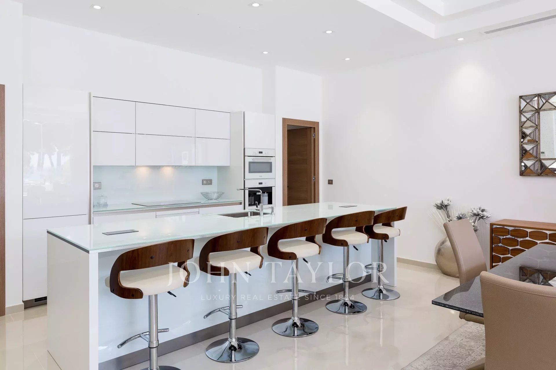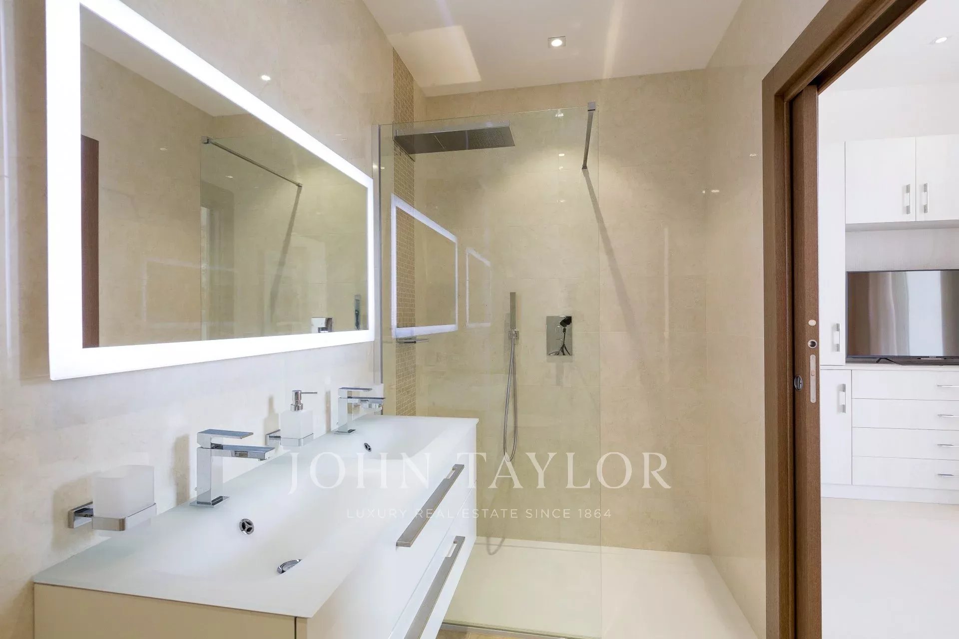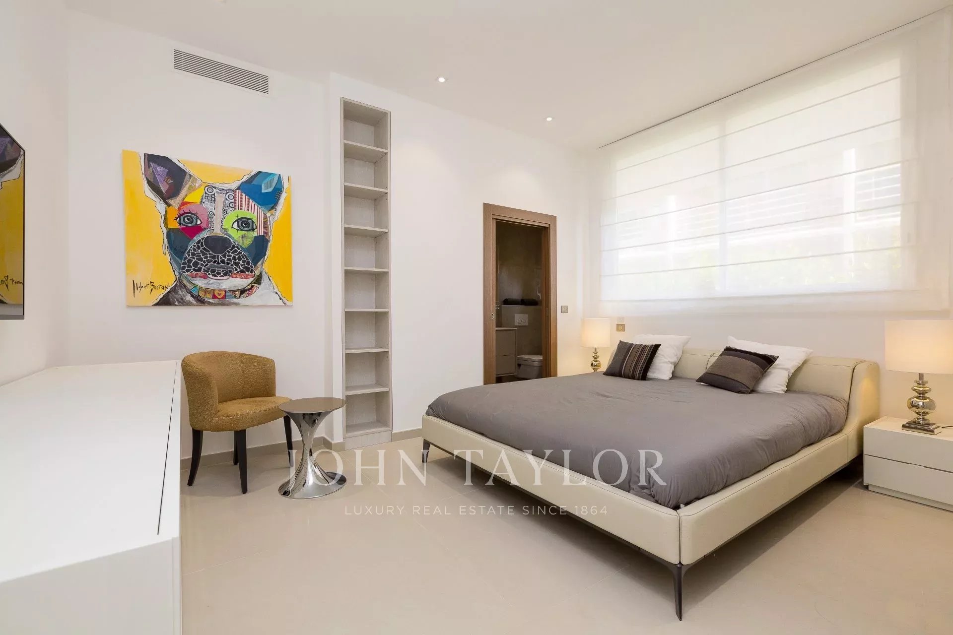 Entièrement climatisé, l'appartement séduit par sa décoration et sa grande terrasse d'environ 110 m2 aménagée avec salon et salle à manger d’été.