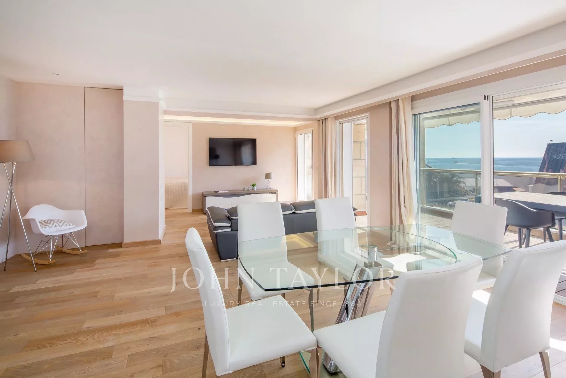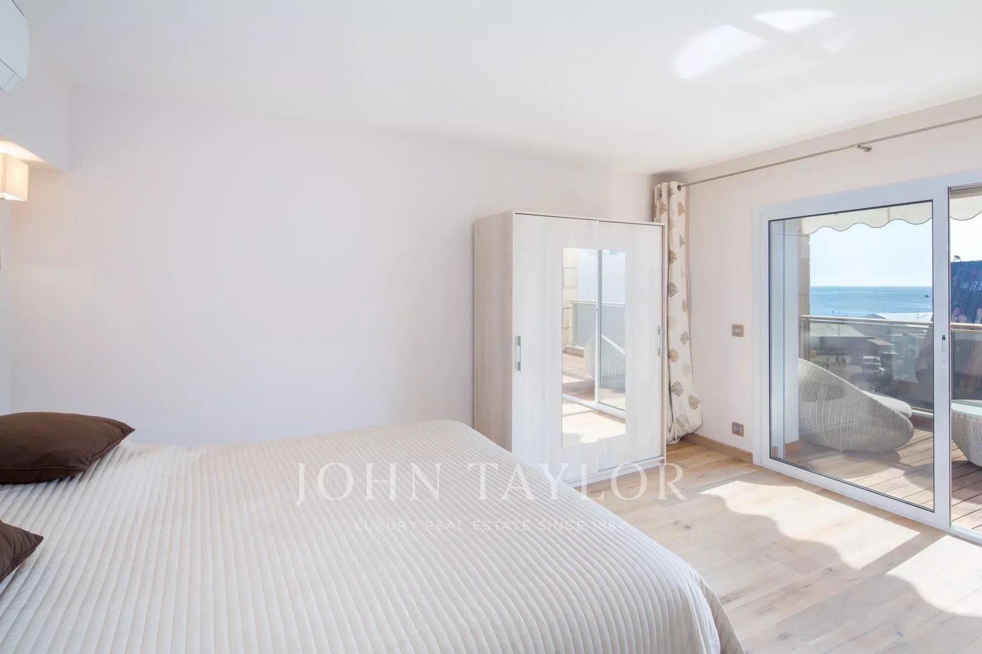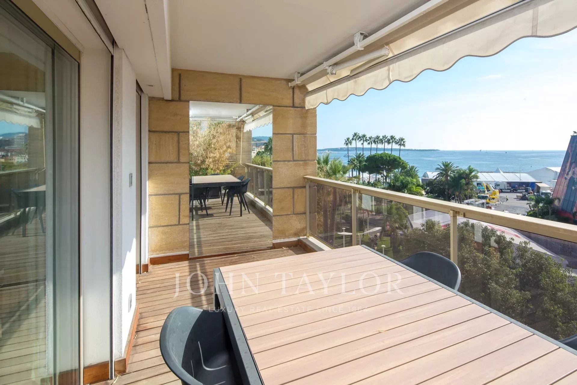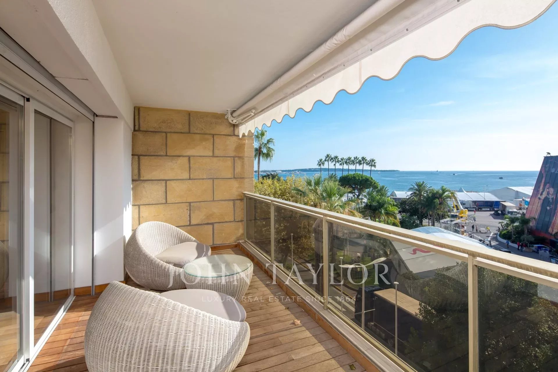 Sur Croisette et face au Palais des Festivals, offrant une superbe vue sur la Baie de Cannes, appartement contemporain entièrement climatisé d'environ 112 m2 habitables. Entièrement rénové, l'appartement séduit par sa décoration contemporaine, ses prestations haut de gamme et ses 2 terrasses d’environ 11 m2 chacune.