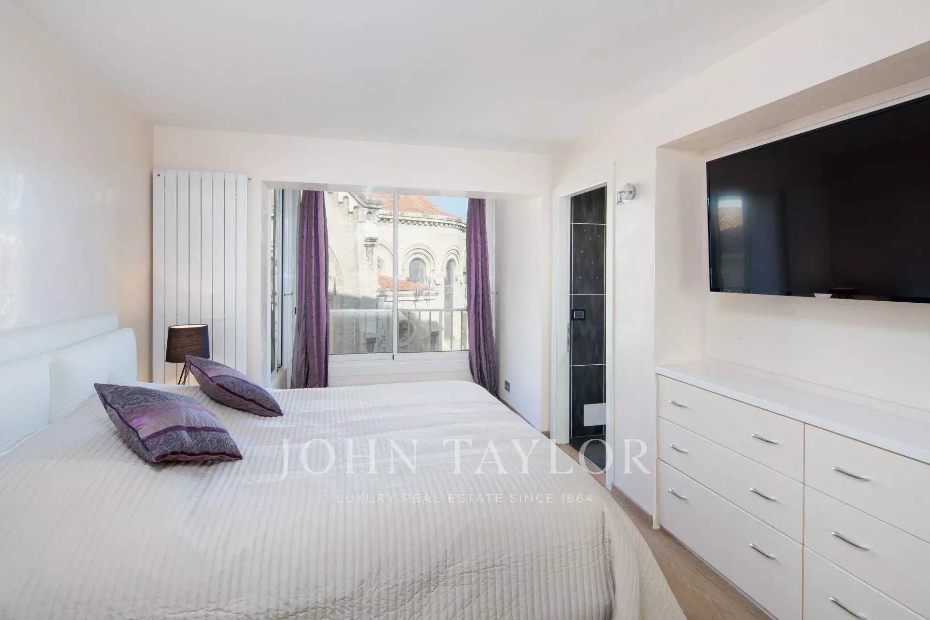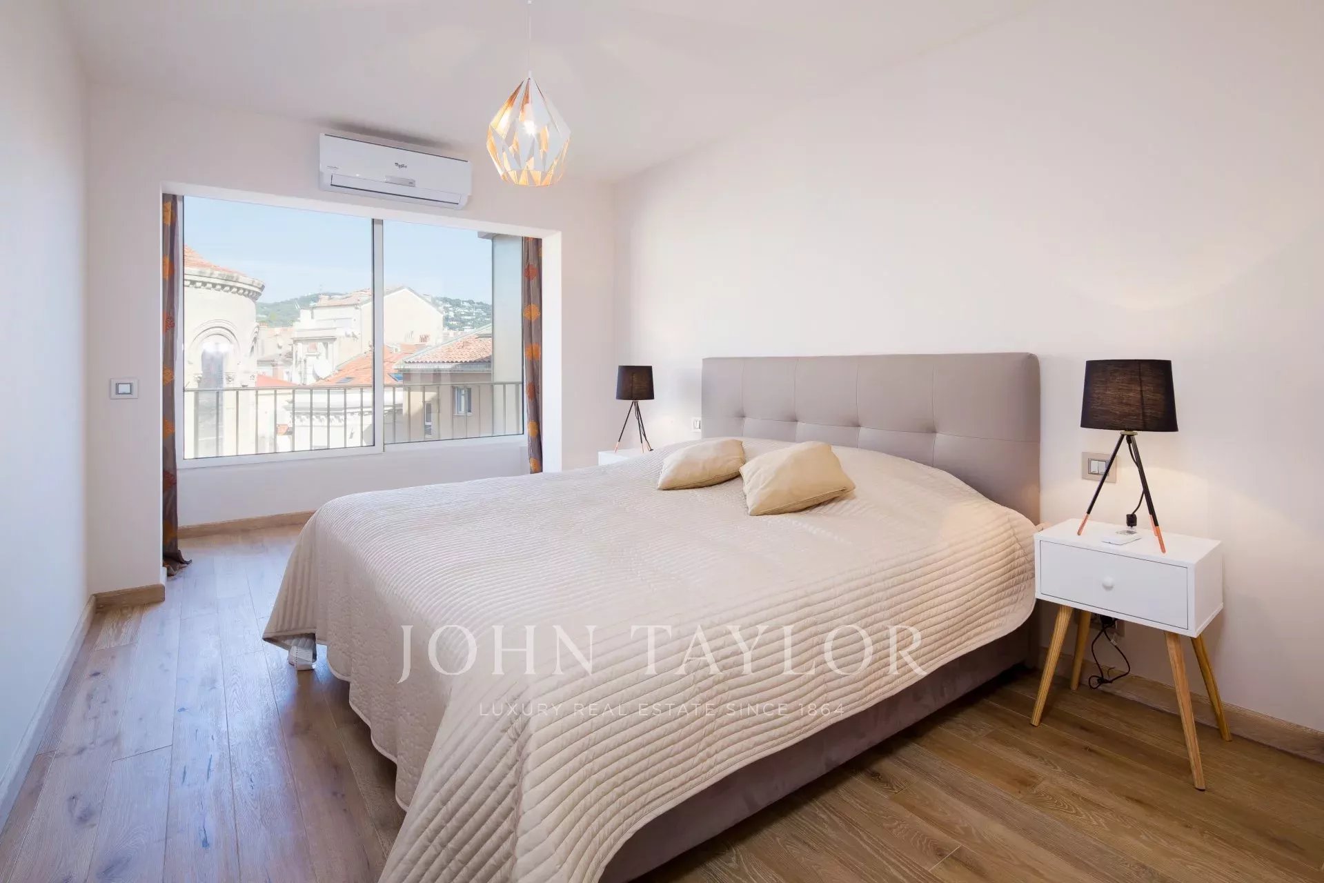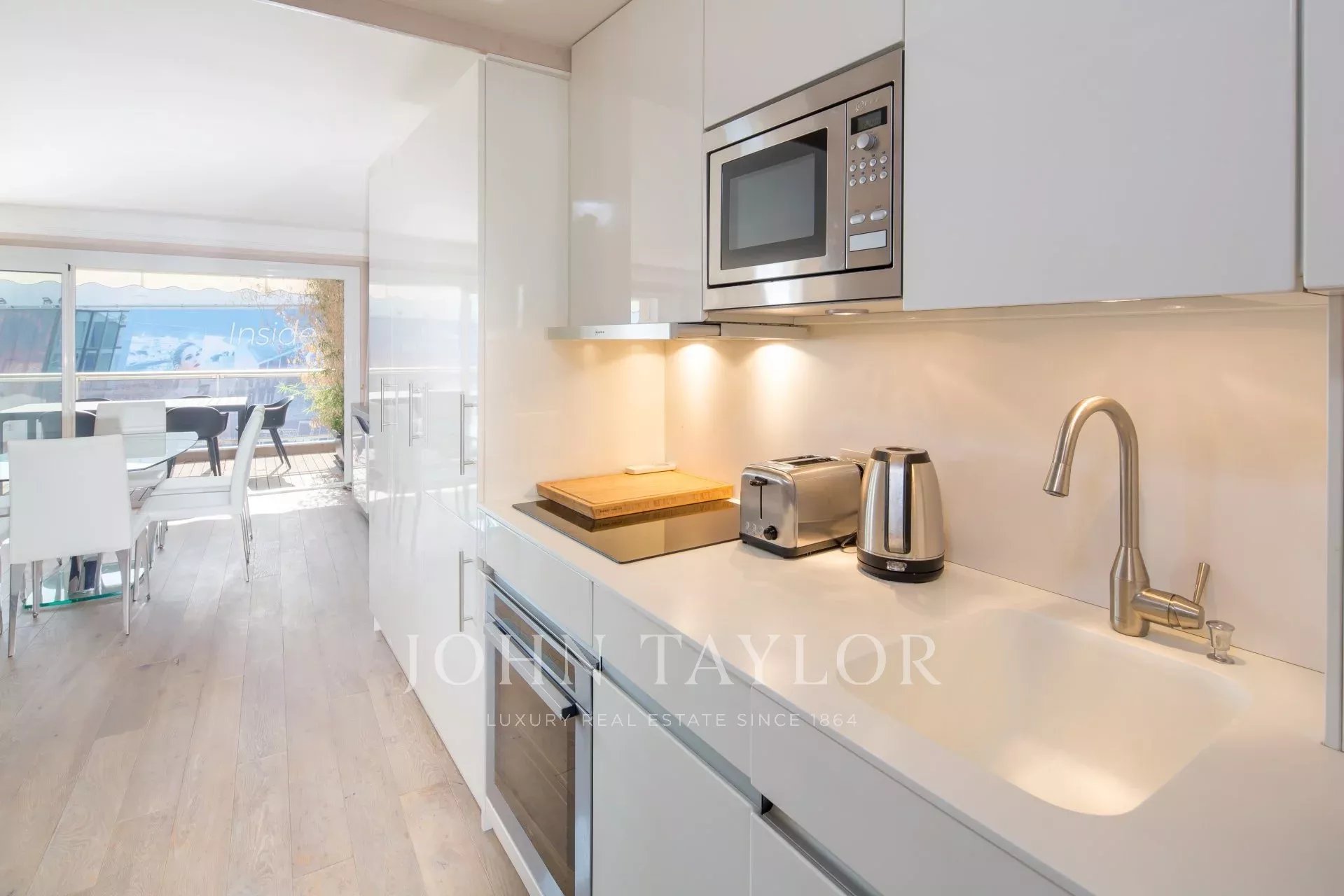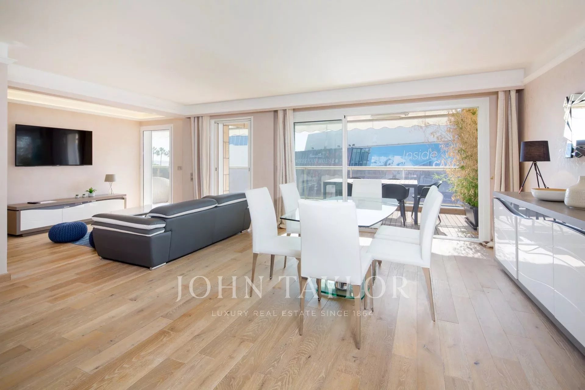 Sur Croisette et face au Palais des Festivals, offrant une superbe vue sur la Baie de Cannes, appartement contemporain entièrement climatisé d'environ 112 m2 habitables. Entièrement rénové, l'appartement séduit par sa décoration contemporaine, ses prestations haut de gamme et ses 2 terrasses d’environ 11 m2 chacune.