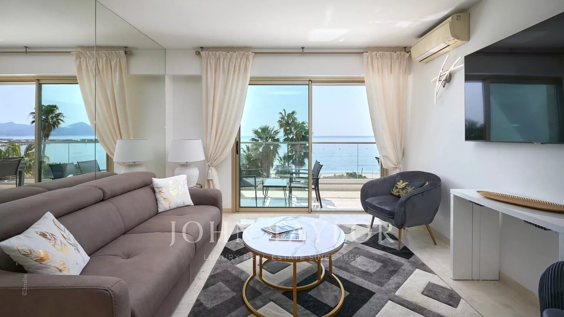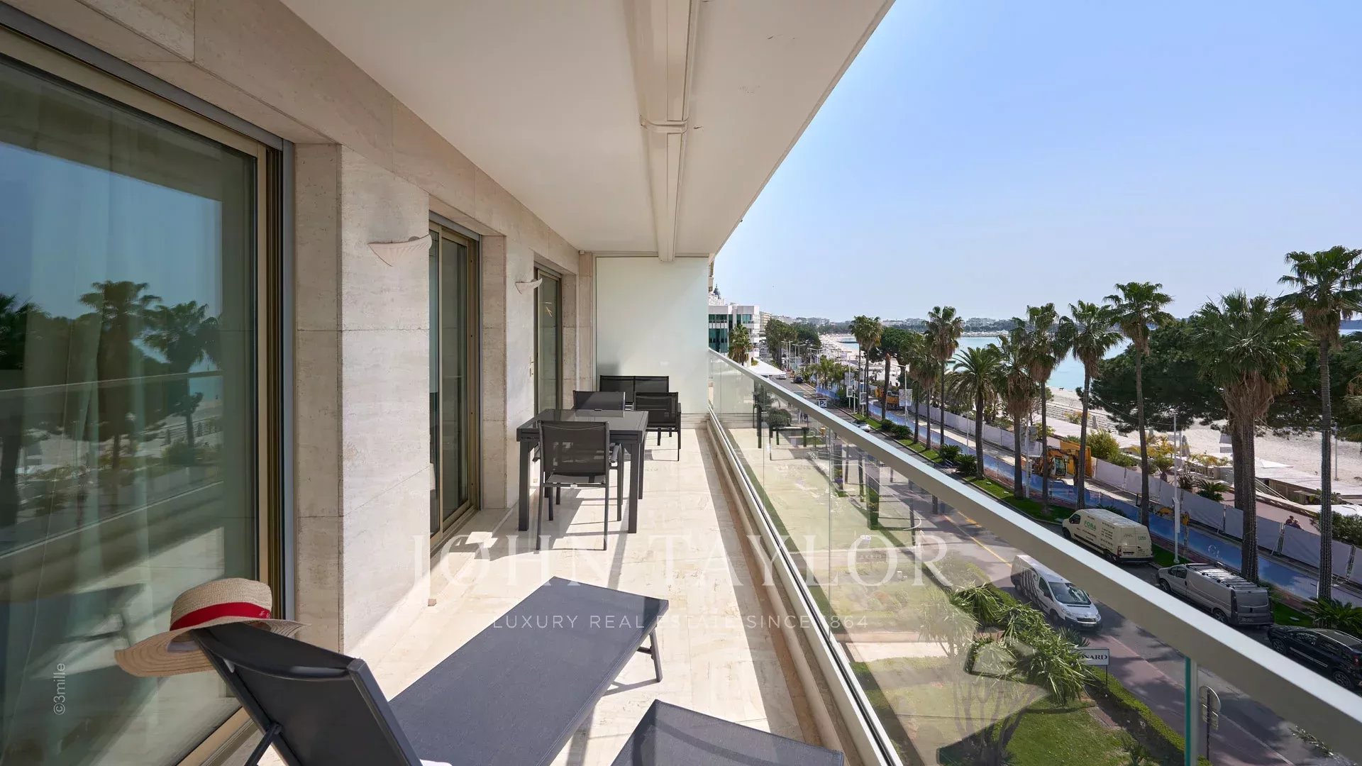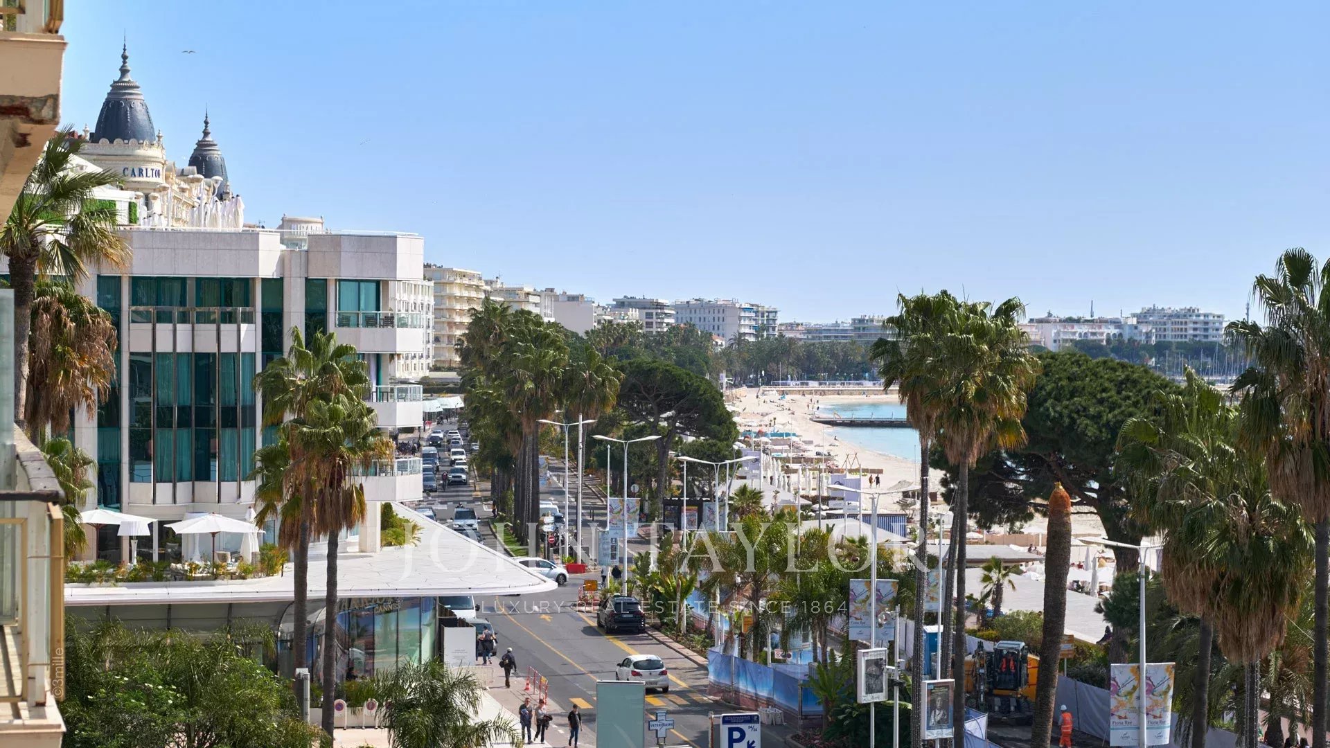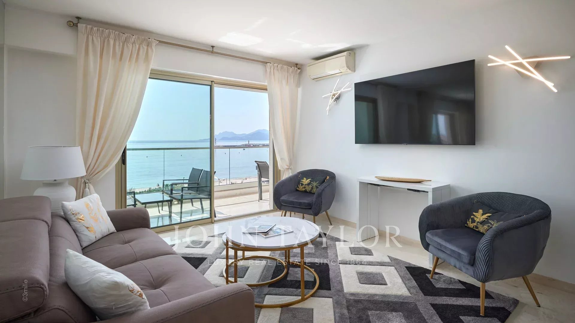Bel appartement climatisé situé en plein cœur de la Croisette au 4ème étage d'une résidence de standing, jouissant d'une vue panoramique sur la Baie de Cannes, ses plages, le Palais des Festivals, et l'Estérel.