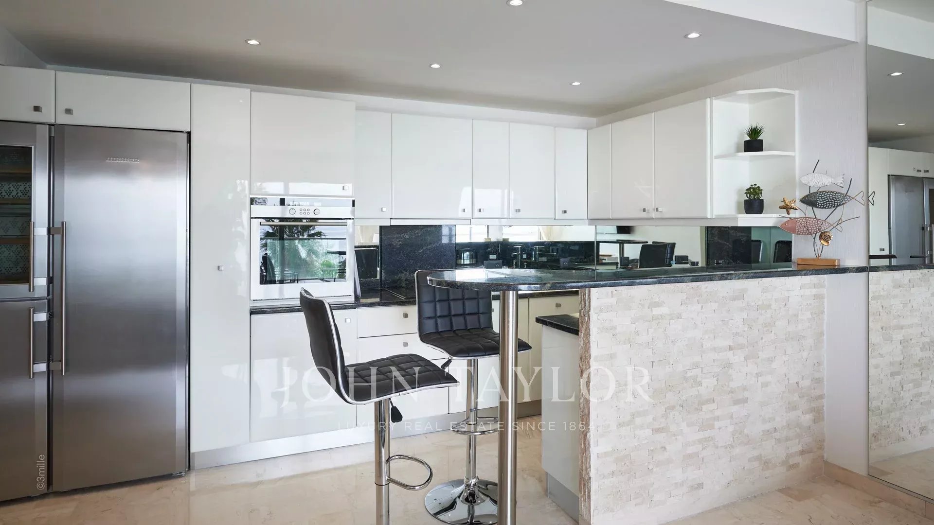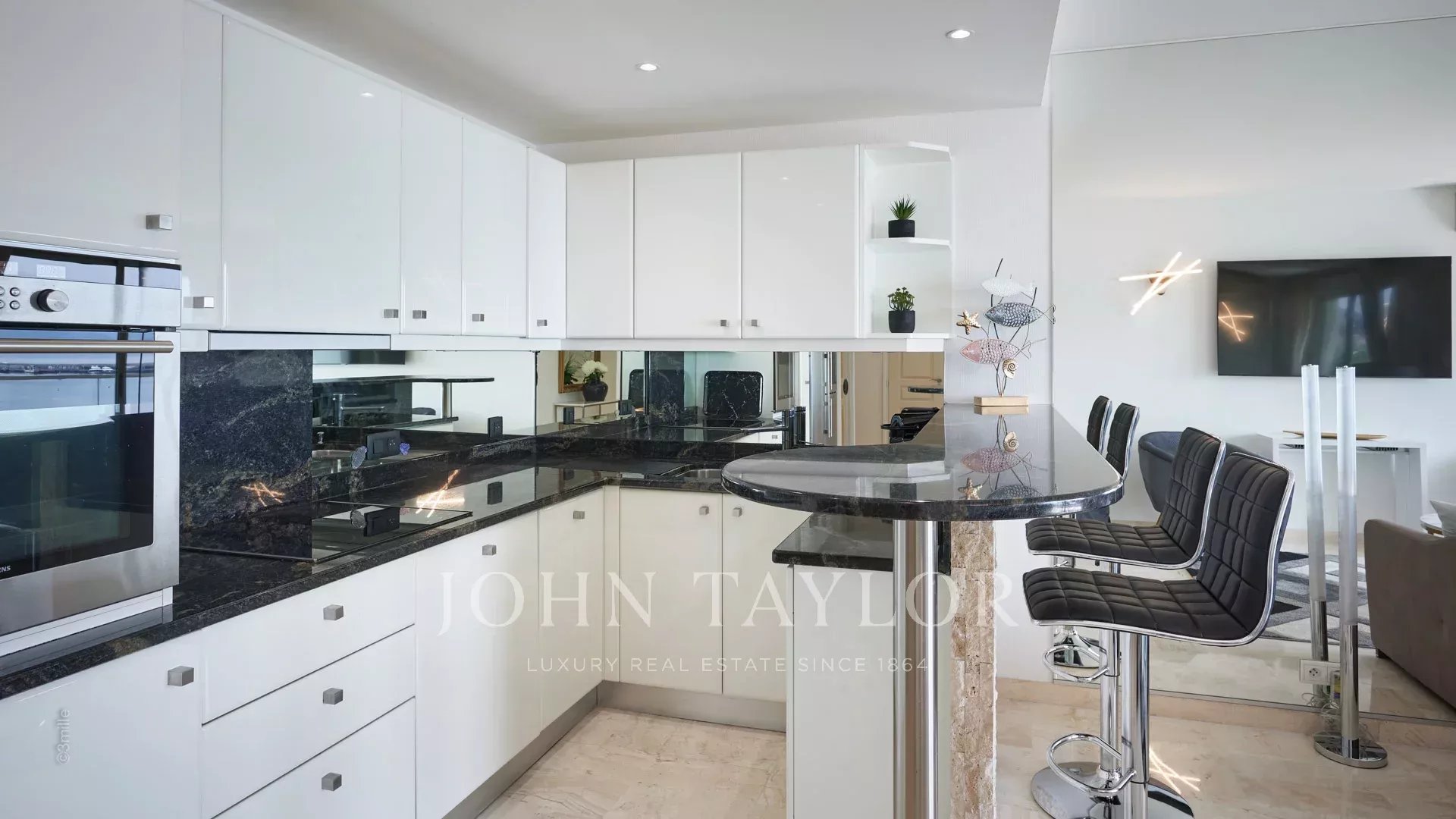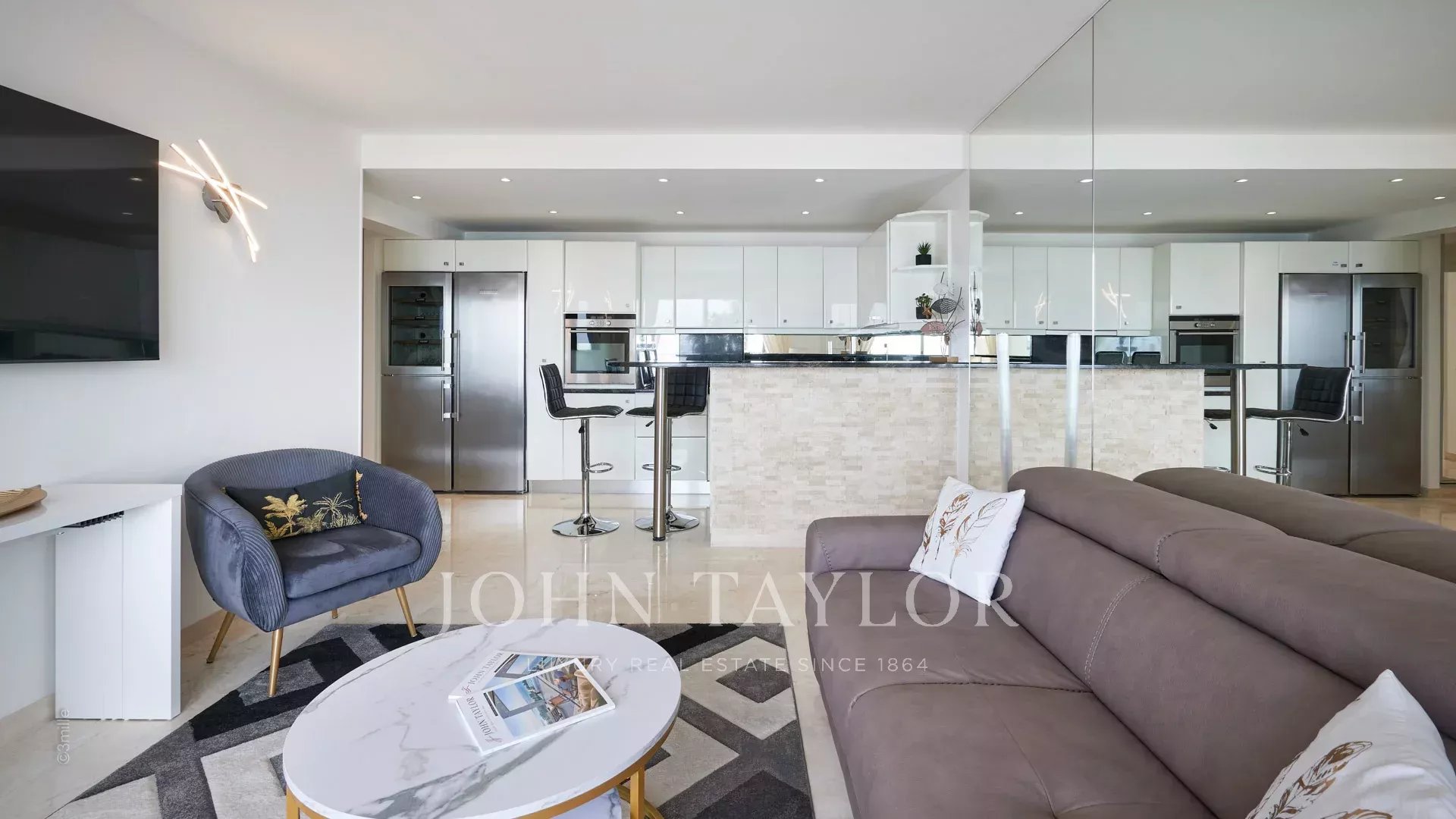 Salon (TV écran plat) avec cuisine ouverte parfaitement équipée