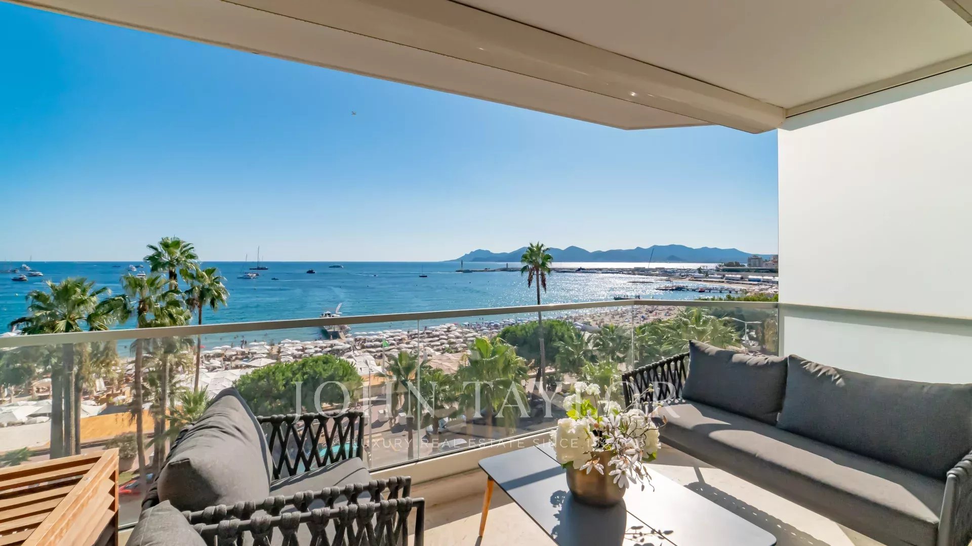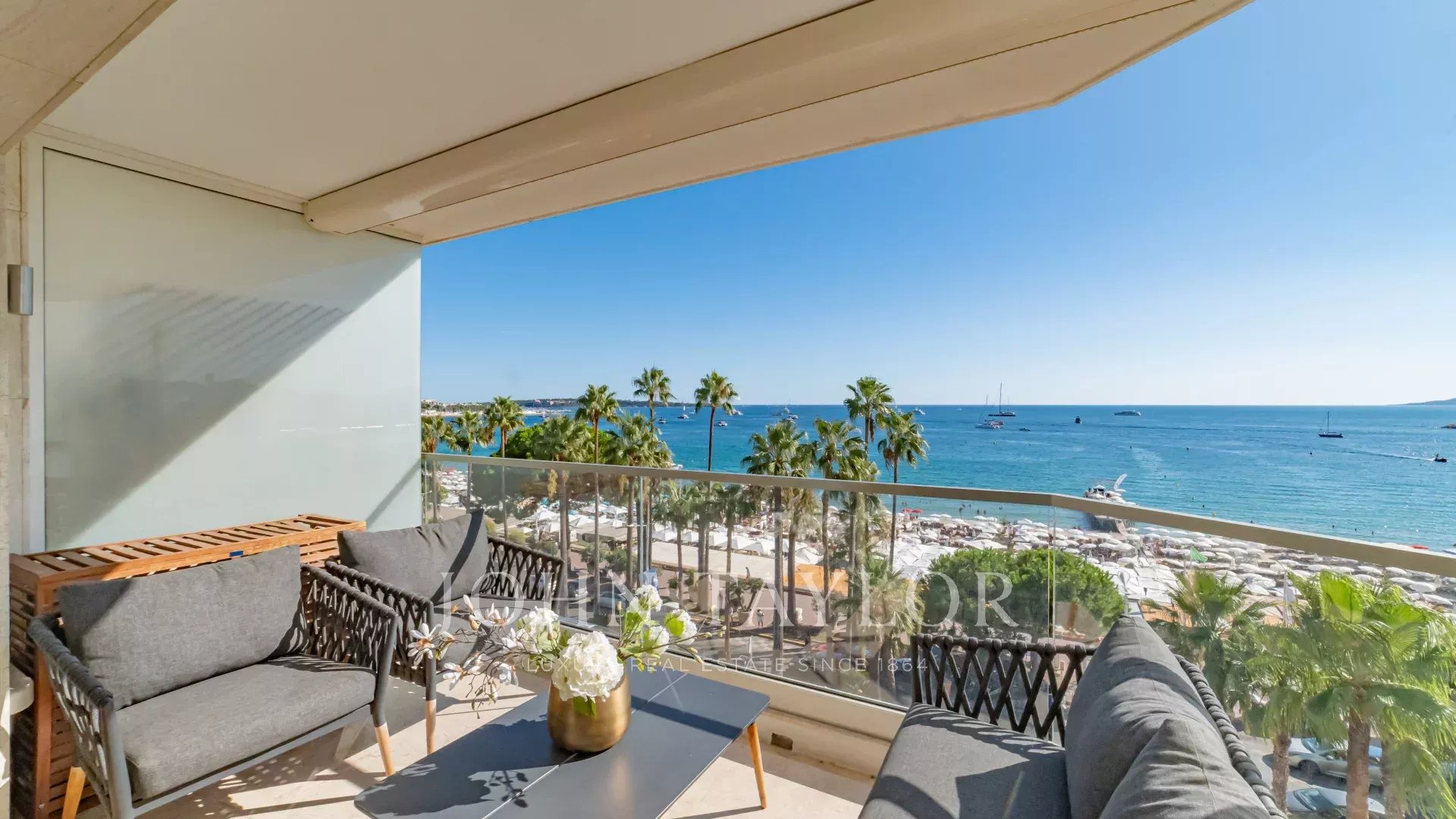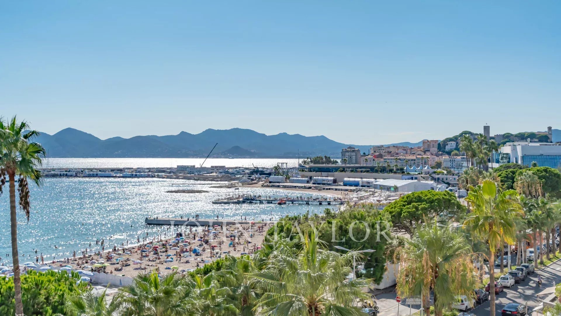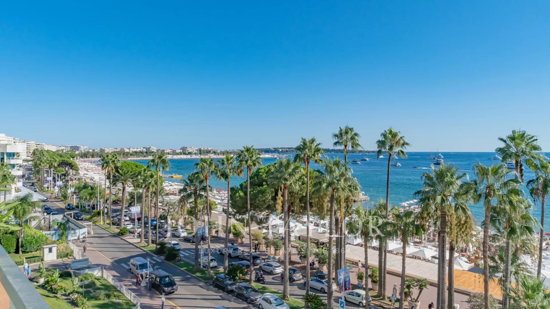 Bel appartement climatisé situé au cœur de la Croisette au 5ème étage d’une résidence de standing, jouissant d'une vue panoramique magnifique sur la Baie de Cannes, ses plages, le Palais des Festivals, et l'Estérel.